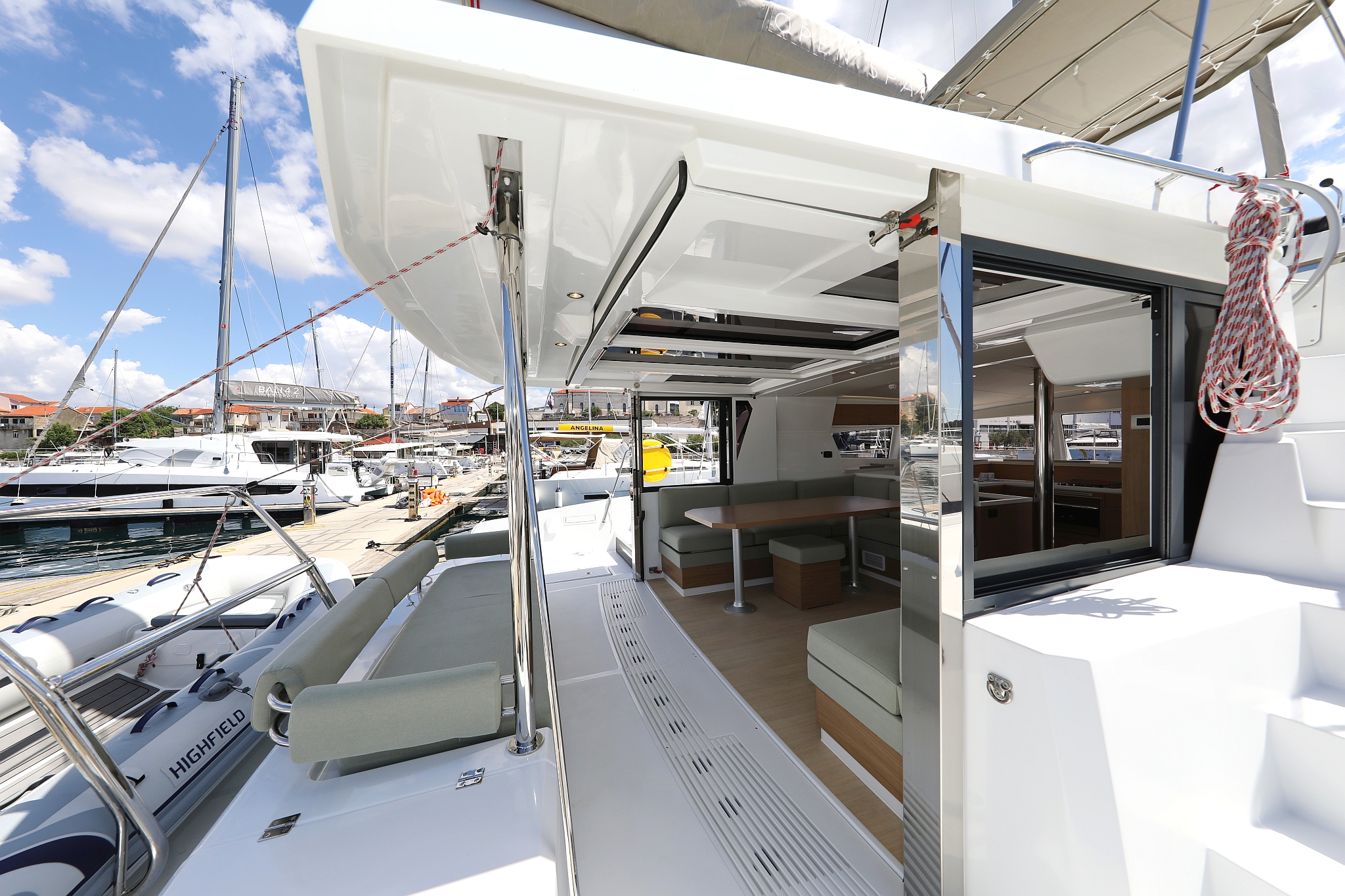 | Outside | Anker mit Kette, Cockpitdusche, Cockpitlautsprecher, Cockpitpolster, Cockpittisch, Deckpolster, elektr. Ankerwinsch, elektr. Winsch, Fender, Grill, Hardtop, Solaranlage, Winschen |