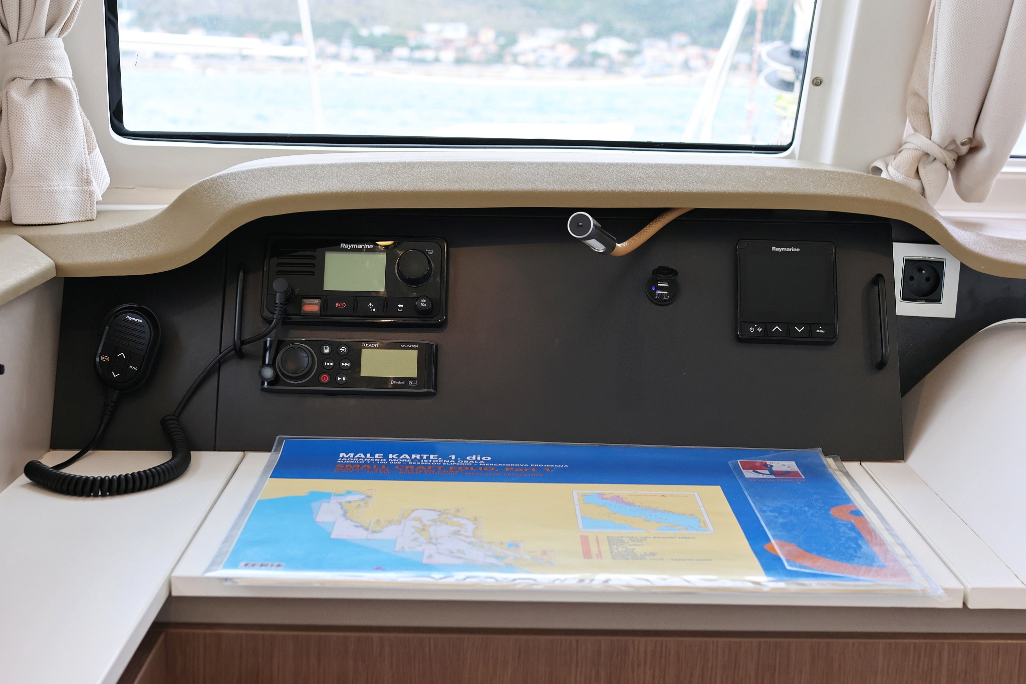 | Navigation | Fernglas, GPS mit Kartenplotter im Cockpit, Handpeilkompass, Kompass, Navigationsbesteck, Seekarten, Tridata (Log, Echolot, Windm.), Windmesser |
