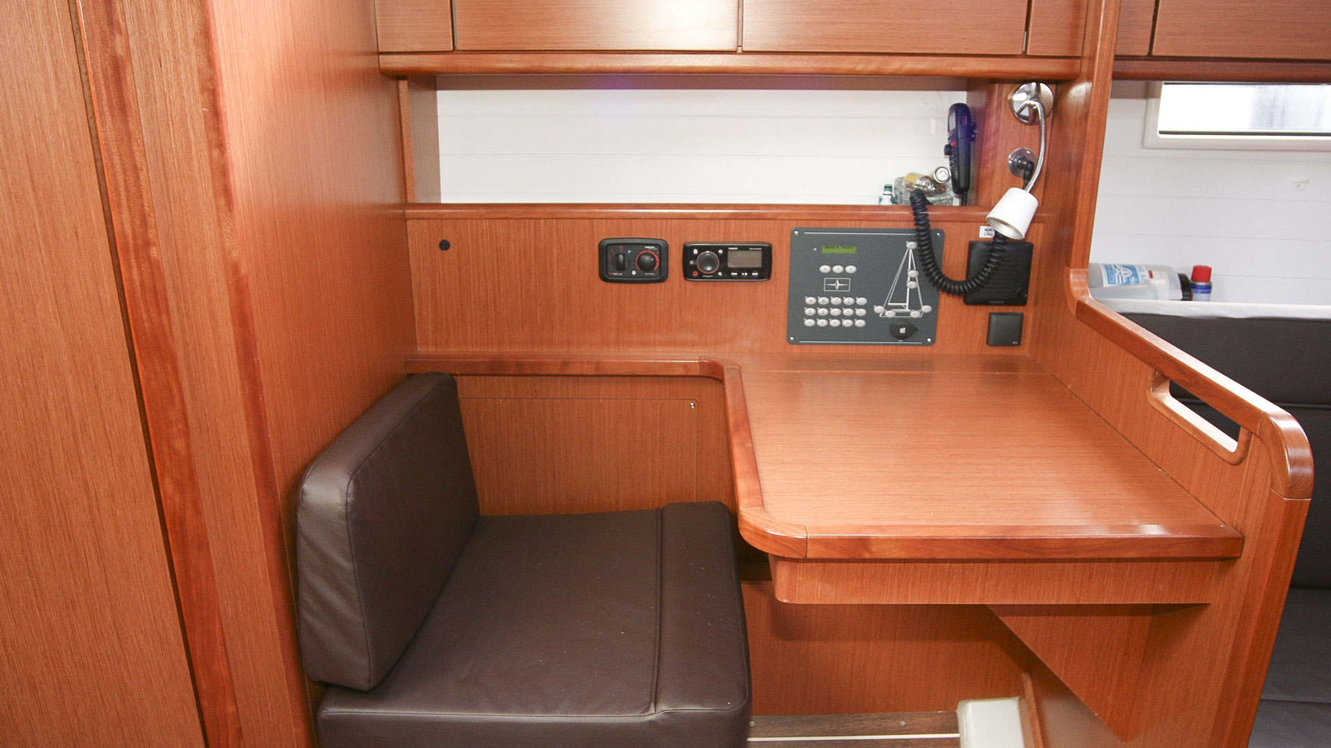 | Navigation | Barometer, Fernglas, GPS mit Kartenplotter im Cockpit, Hafenhandbücher, Handpeilkompass, iPad, Kompass, Navigationsbesteck, Seekarten, Tridata (Log, Echolot, Windm.), Windmesser |
