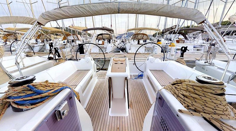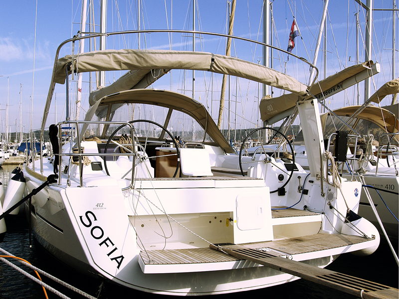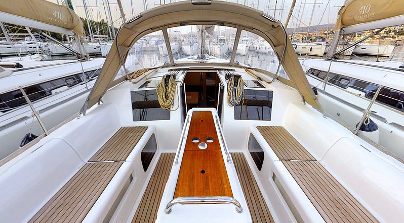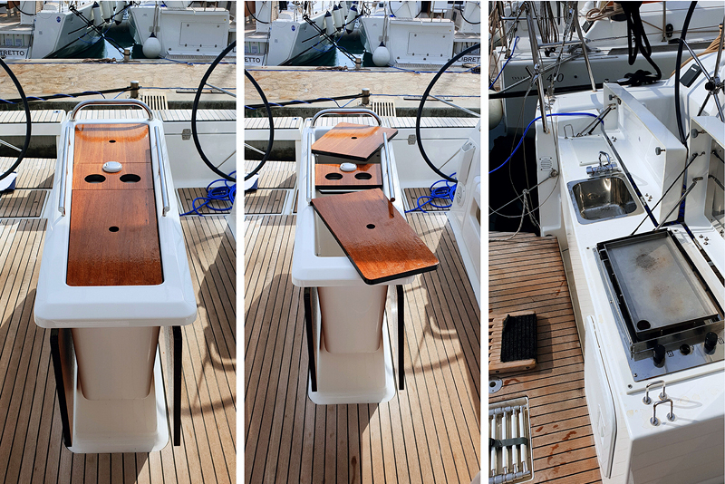 | Outside | 220 V-Landanschluss, Anker mit Kette, Badeplattform, Benzinkanister, Biminitop, Bootshaken, Cockpitdusche, Cockpitlautsprecher, Cockpitpolster, Cockpittisch, Deckbürste, Dieselkanister , elektr. Ankerwinsch, Fender, Festmacherleinen, Gangway, Grill, Kugelfender, Solaranlage, Sprayhood, Spülbecken im Cockpit, Teak auf Badeplattform, Teak im Cockpit, Wasserkanister , Wasserschlauch, Windex, Winschen |