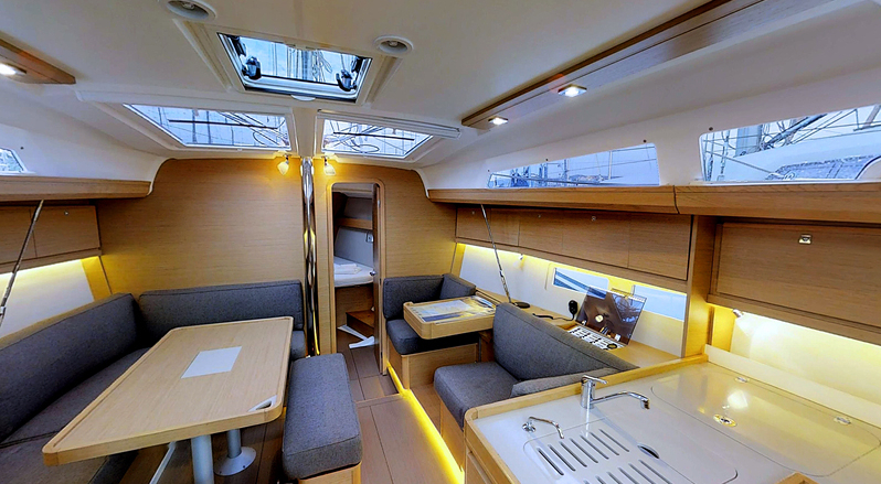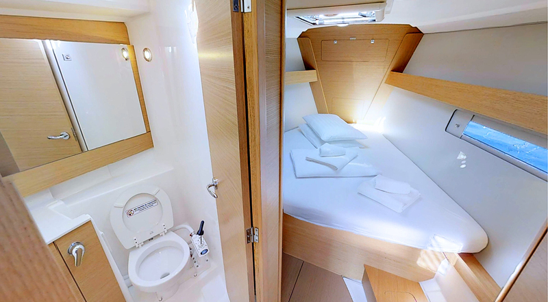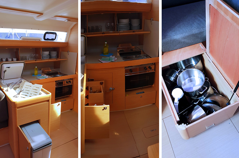 | Inside | 3-flammiger Gasherd, Fäkalientank, Inverter 12V/220V, Kleiderbügel, Kühlschrank, Landstromkabel, Lautsprecher im Salon, Luftpumpe für Beiboot, Pantryausstattung, Salontisch absenkbar, Ventilatoren in Kabinen, Weinkühlschrank, Weinschrank |