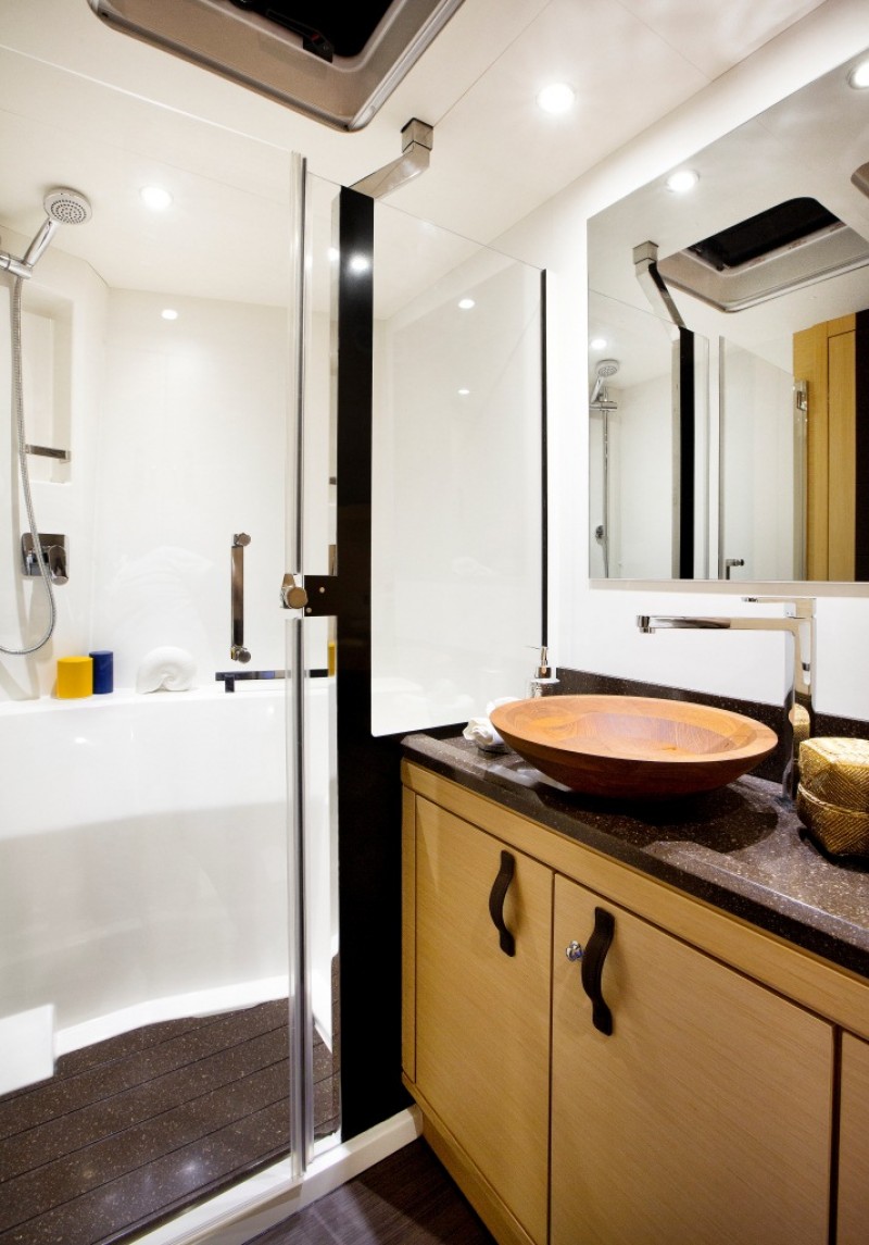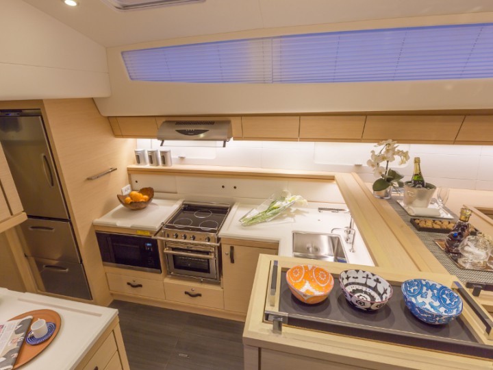 | Inside | Backofen, Eiswürfelmaschine, Gasherd, Gefrierschrank, Generator, Geschirrspüler, Heizung, Inverter 12V/220V, Kaffeemaschine, Klimaanlage (ohne Landstrombedarf), Kühlschrank, Lautsprecher im Salon, Mikrowelle, Pantryausstattung, Sound System, Spülbecken, TV, Watermaker, WC (elektr.) |