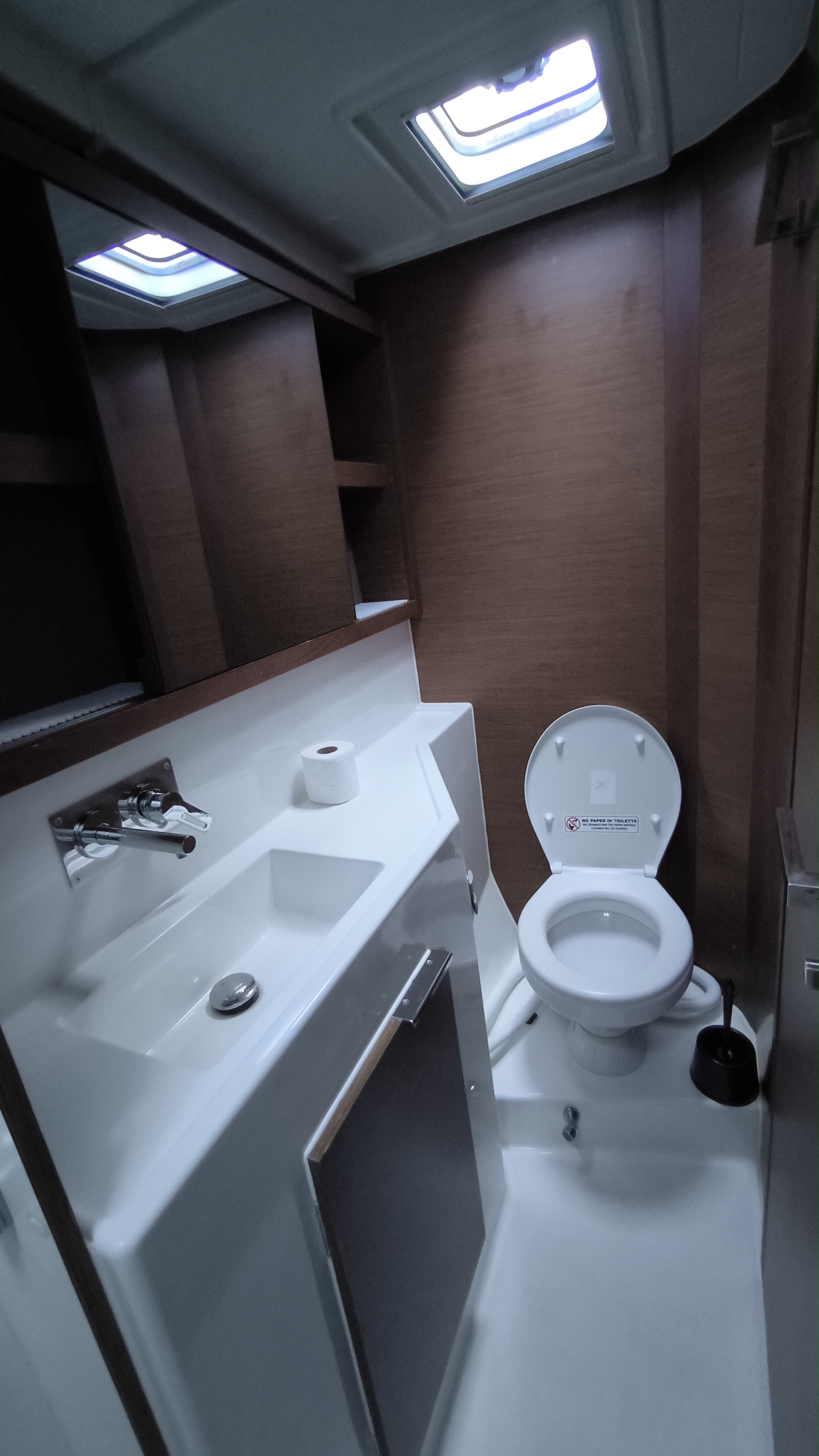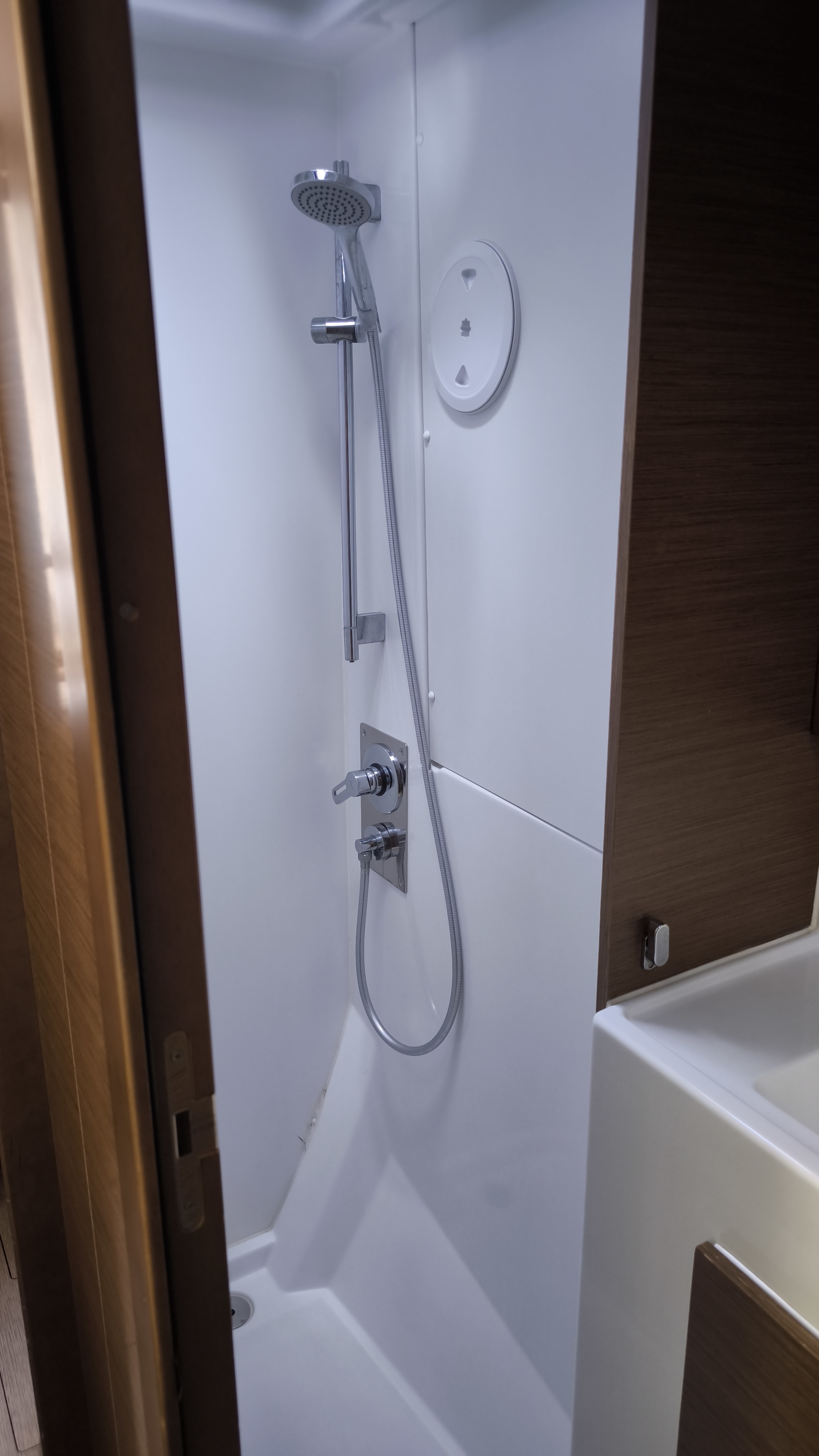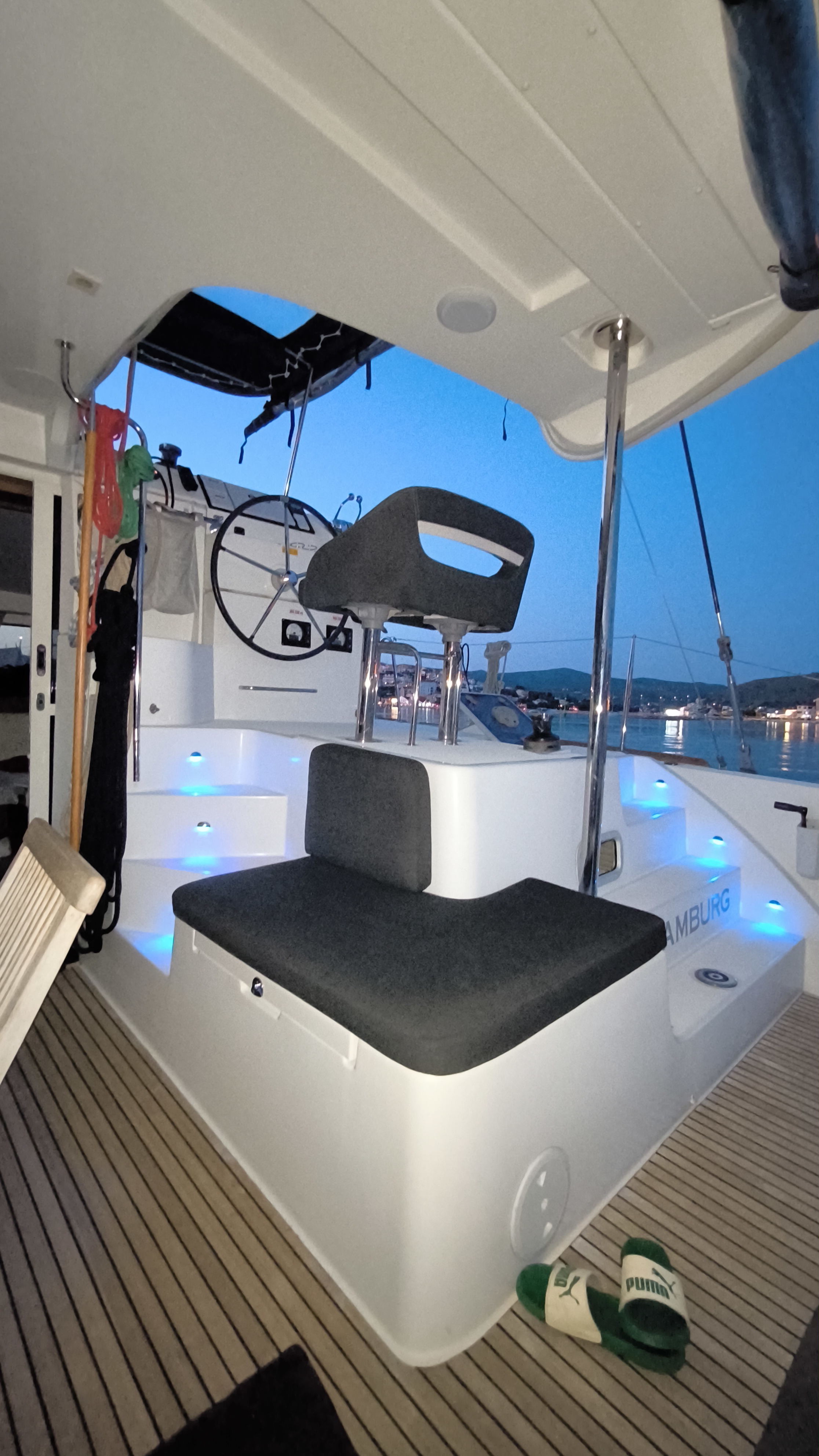 | Outside | Ankerkettenzähler, Badeleiter, Badeplattform, Biminitop, Cockpitdusche, Cockpitlautsprecher, Cockpitpolster, Cockpittisch, Davits, Deckpolster, elektr. Ankerwinsch, elektr. Winsch, Fernsteuerung für elektr. Ankerwinsch, Solaranlage, Sprayhood, Teak auf Badeplattform |