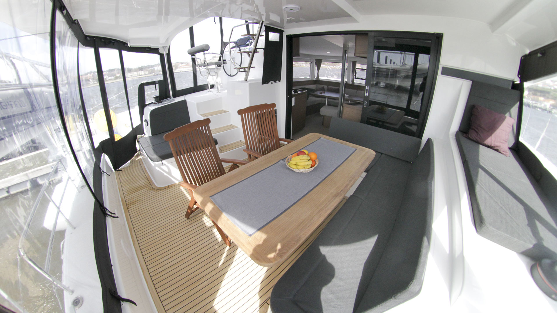 | Outside | 12 V-Anschluss, 220 V-Landanschluss, Anker mit Kette, Badeleiter, Badeplattform, Biminitop, Bootshaken, Cockpitdusche, Cockpitkühlschrank, Cockpitlautsprecher, Cockpitpolster, Cockpittisch, elektr. Ankerwinsch, elektr. Winsch, Faltpropeller, Fender, Festmacherleinen, Gangway, Grill, Kuchenbude, Kugelfender, Solaranlage, Sonnendeck, Sprayhood, Teak auf Badeplattform, Wasserschlauch, Winschen |