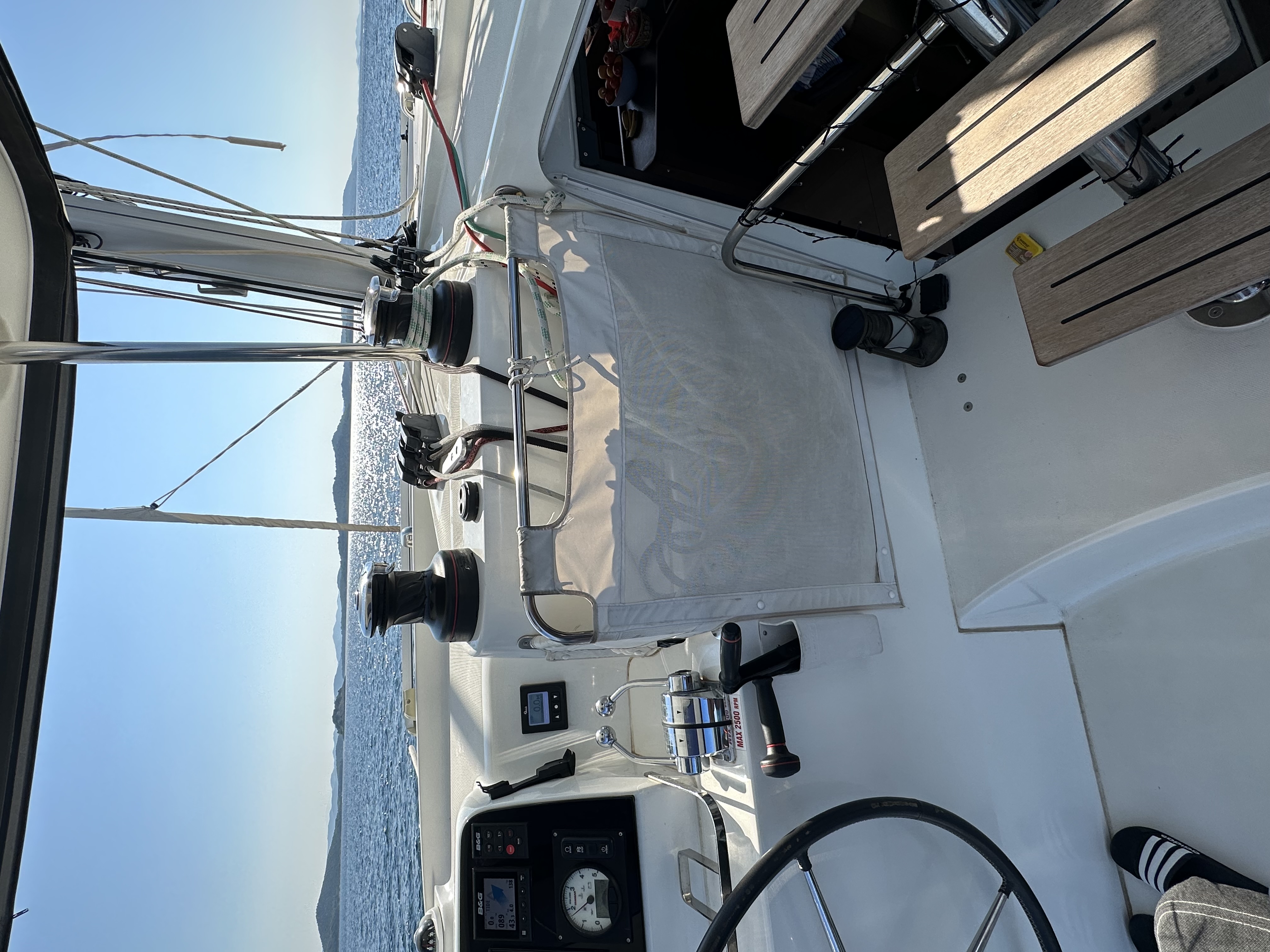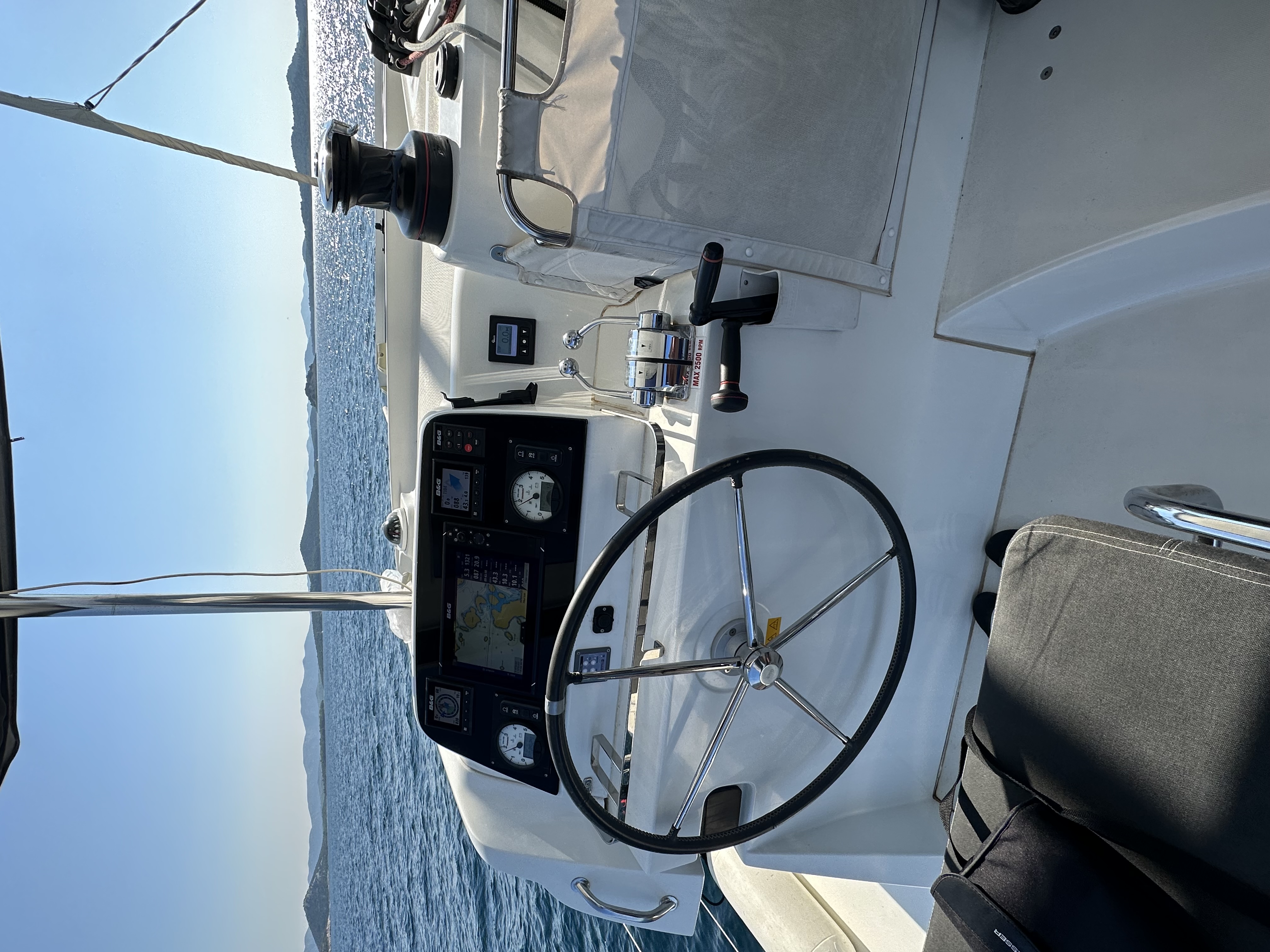 | Navigation | Barometer, Fernglas, GPS mit Kartenplotter, GPS mit Kartenplotter im Cockpit, Hafenhandbücher, Handpeilkompass, Kompass, Navigationsbesteck, Radar, Seekarten, Tridata (Log, Echolot, Windm.), Windmesser |