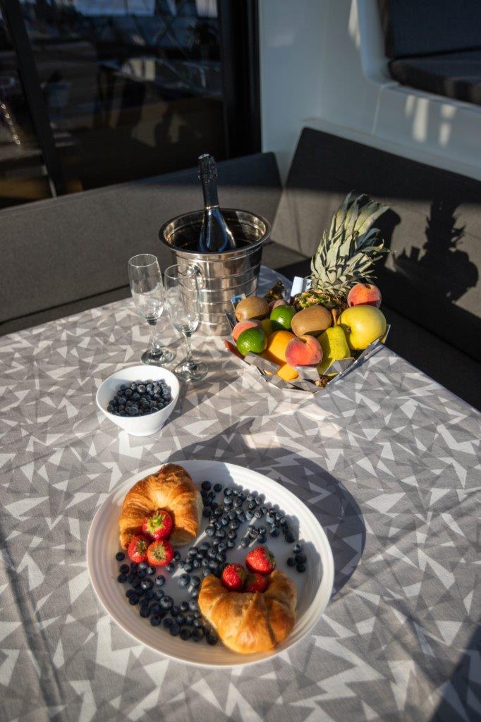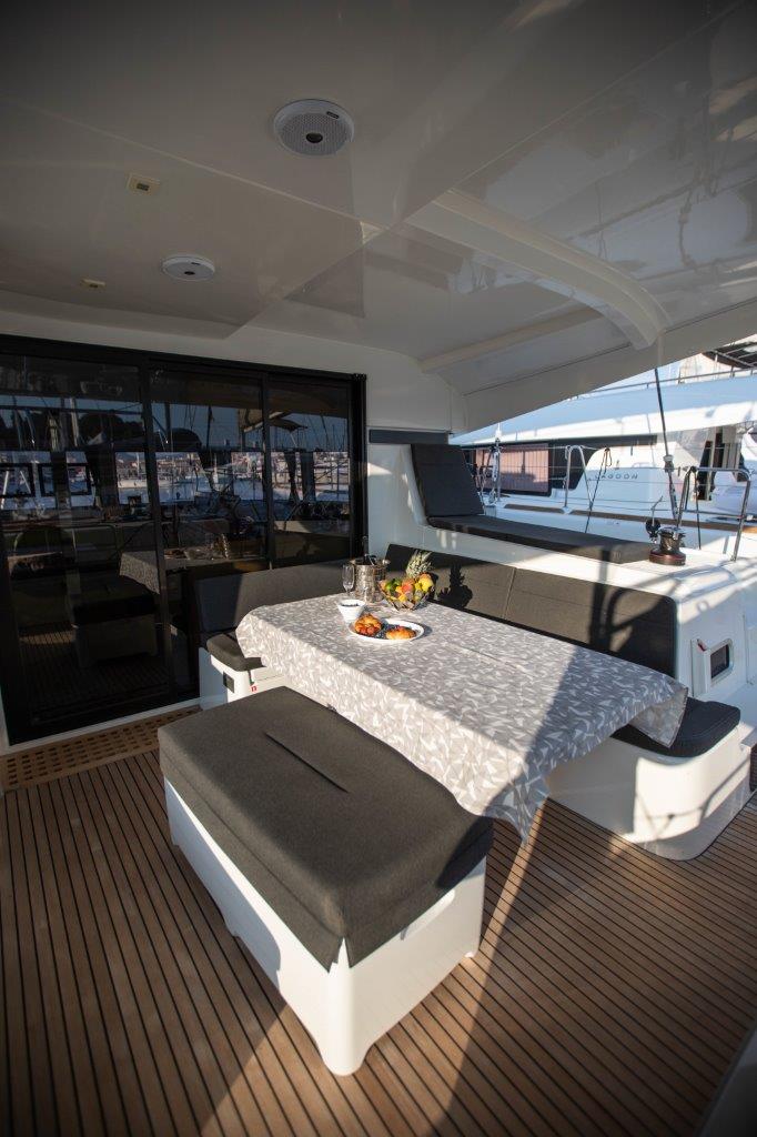 | Outside | 220 V-Landanschluss, Biminitop, Cockpitdusche, Cockpitkühlschrank, Cockpitlautsprecher, Cockpitpolster, Cockpittisch, elektr. Ankerwinsch, Gangway, Sprayhood, Teak im Cockpit |