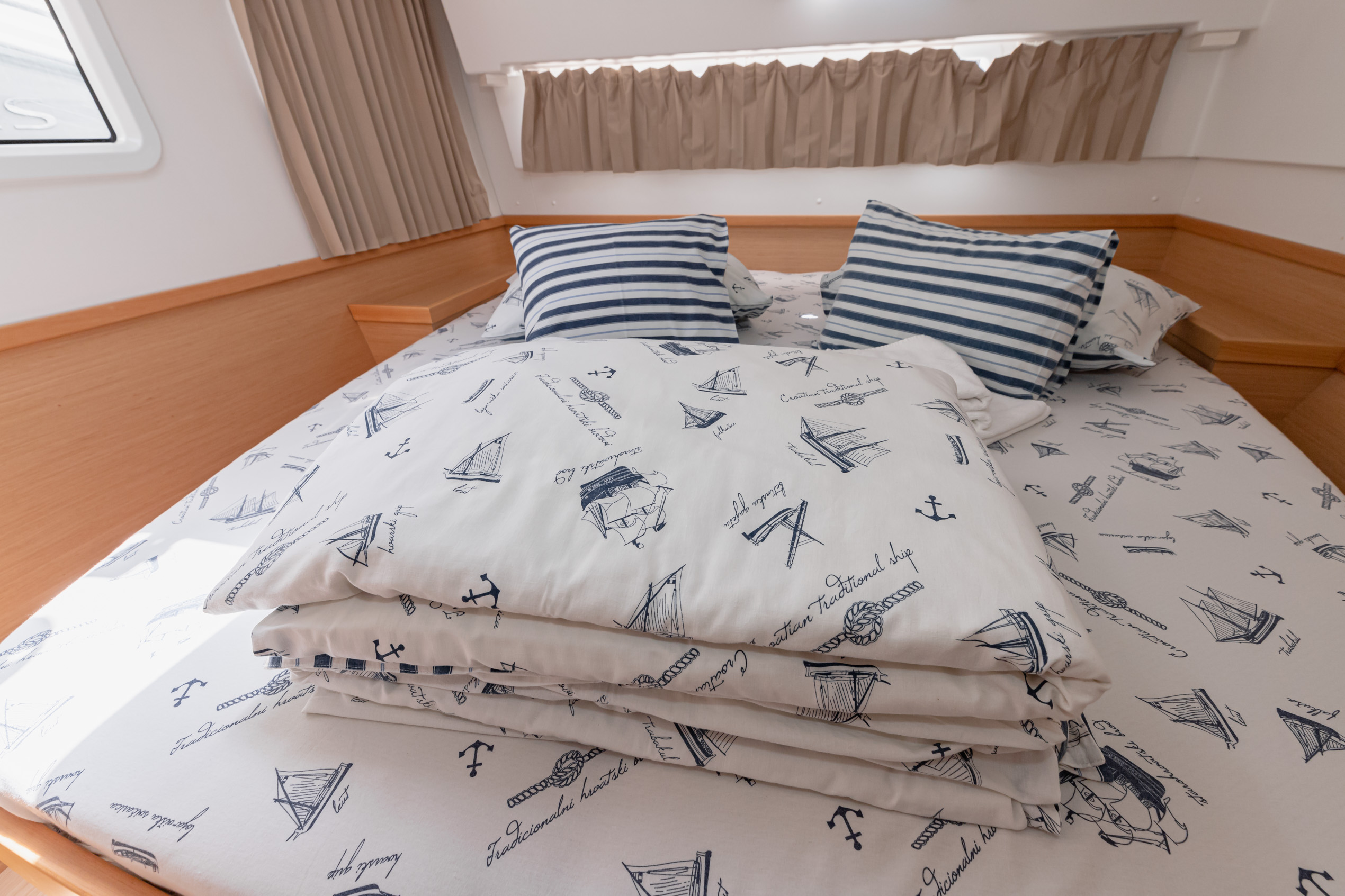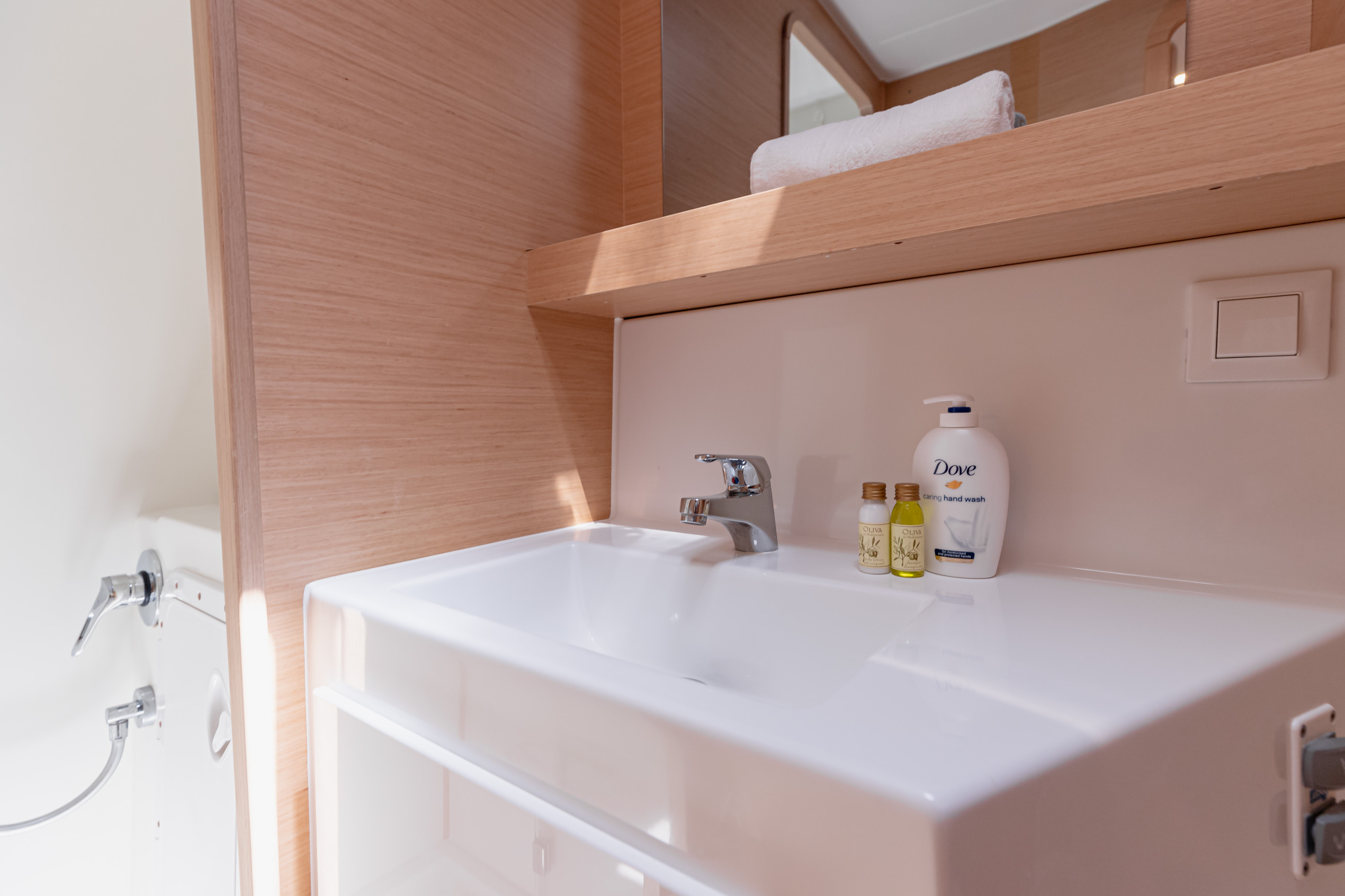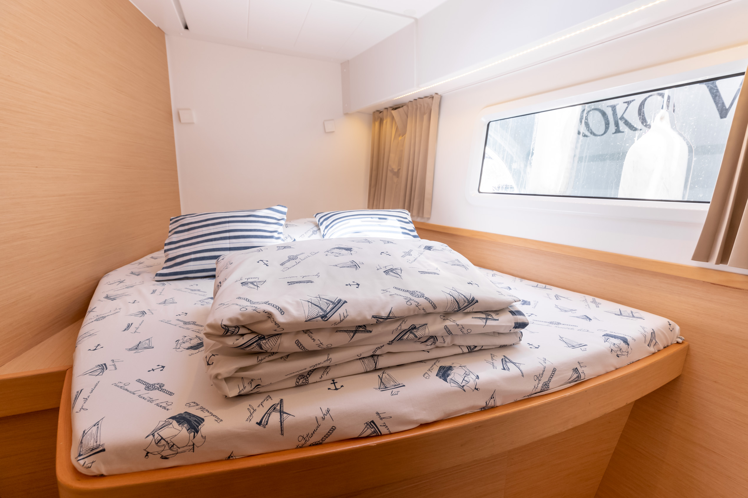 | Inside | 2. Kühlschrank, Gasherd, Generator, Geschirr, Kaffeemaschine, Klimaanlage (Salon), Ladegerät, Pantryausstattung, Radio mit CD, MP3, USB und Bluetooth, Radio mit USB, Spülbecken, Ventilatoren in Kabinen, Warmwasser, Wasserkocher, WC (elektr.) |