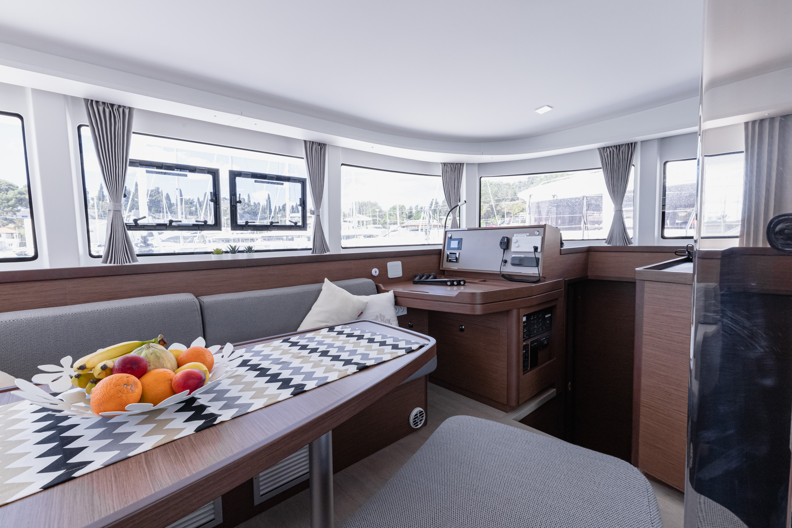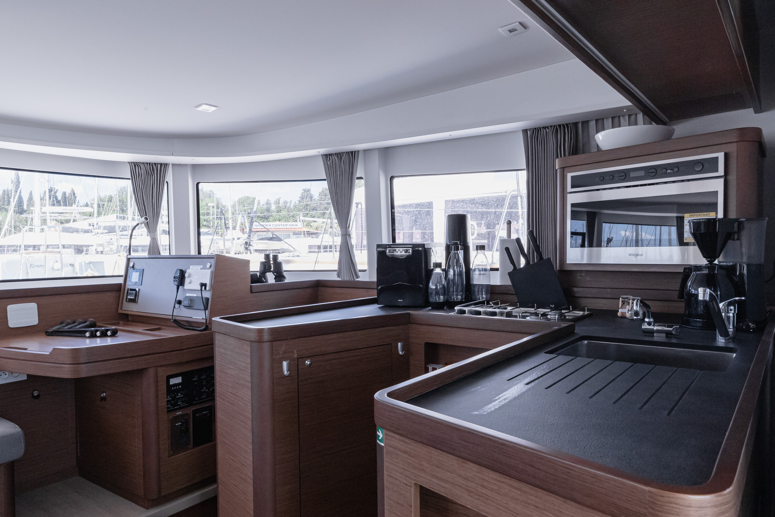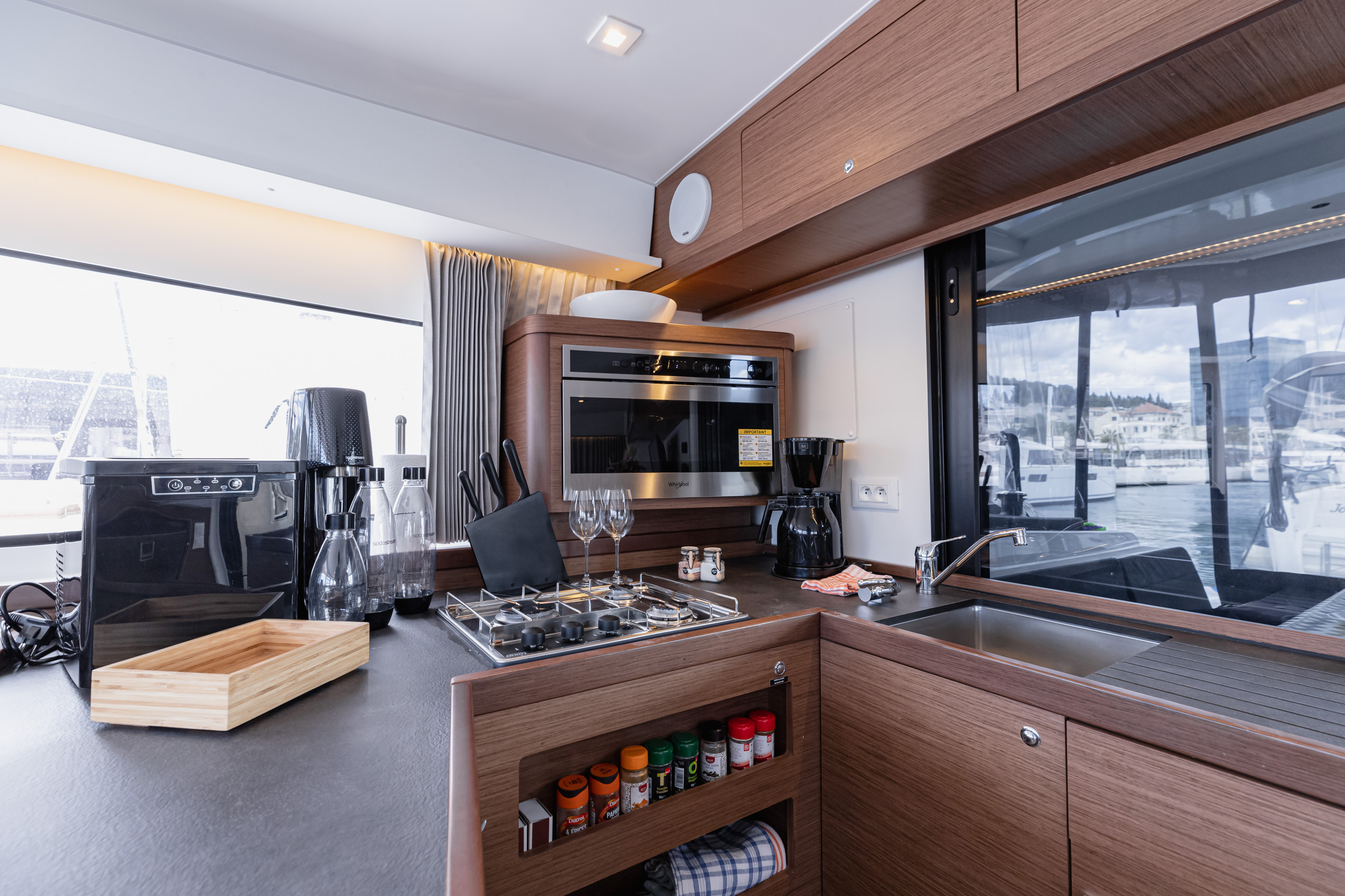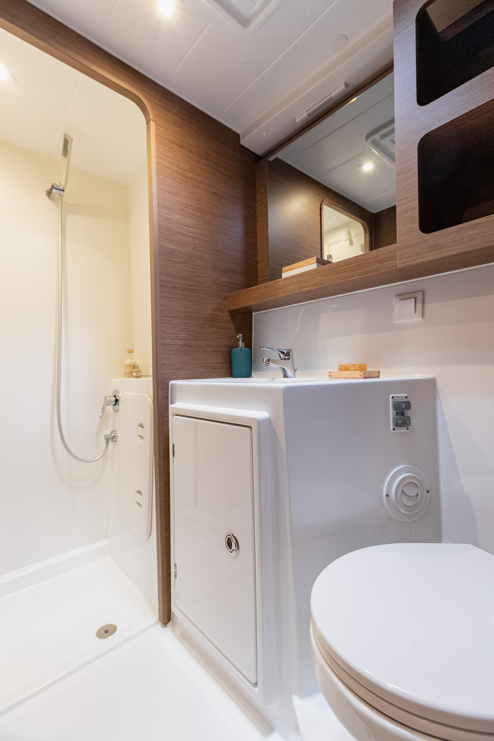 | Inside | Backofen, CD-Player, Eiswürfelmaschine, Fäkalientank, Fön, Gasherd, Gefrierschrank, Generator, Heizung, Inverter 12V/220V, Kaffeemaschine, Klimaanlage (ohne Landstrombedarf), Kühlschrank, Ladegerät, Mikrowelle, Pantryausstattung, TV + DVD, Warmwasser, Watermaker, WC (elektr.) |