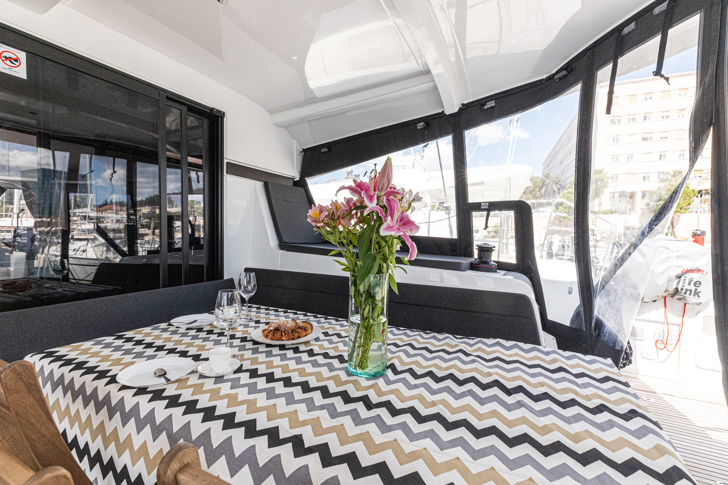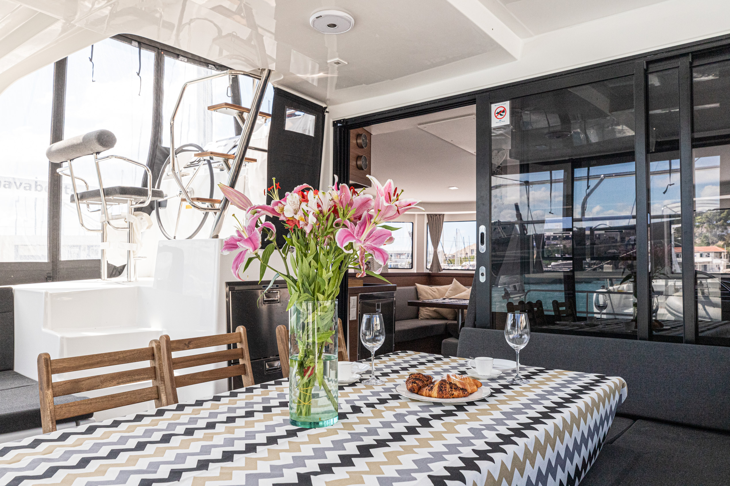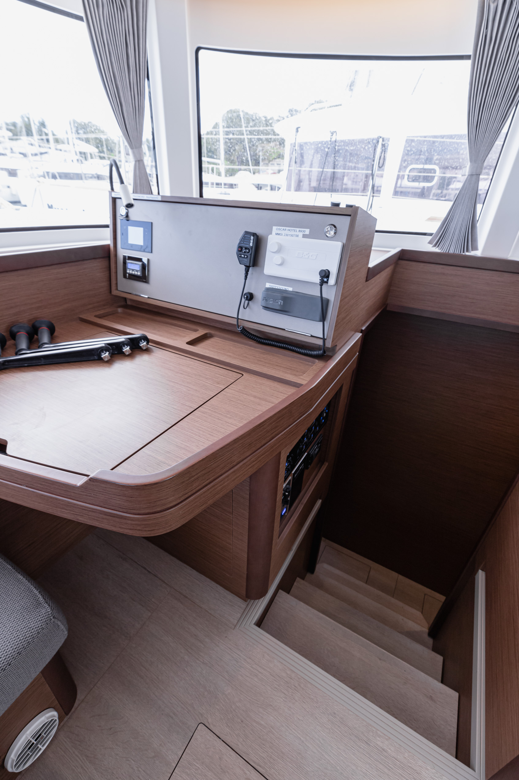 | Outside | 220 V-Landanschluss, Biminitop, Cockpitdusche, Cockpitlautsprecher, Cockpitpolster, Cockpittisch, elektr. Ankerwinsch, elektr. Winsch, Gangway, Solaranlage, Sprayhood, Teak im Cockpit |