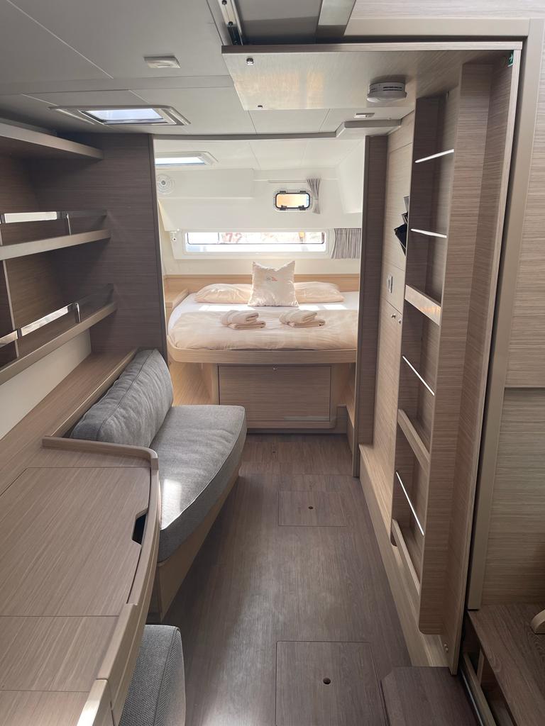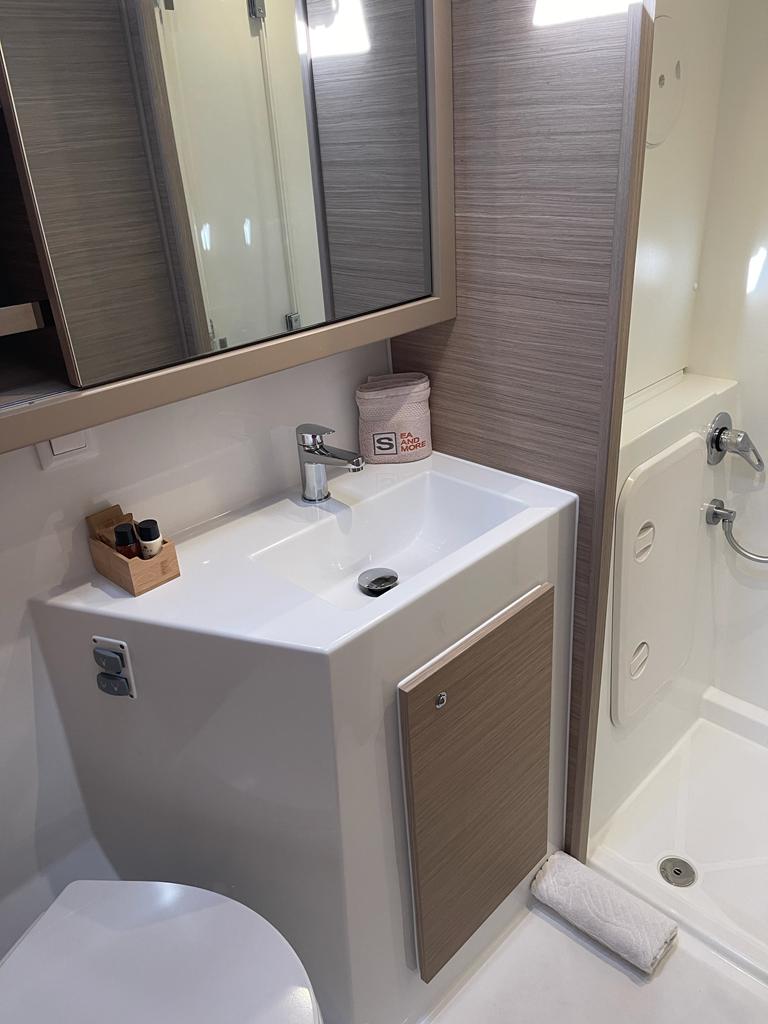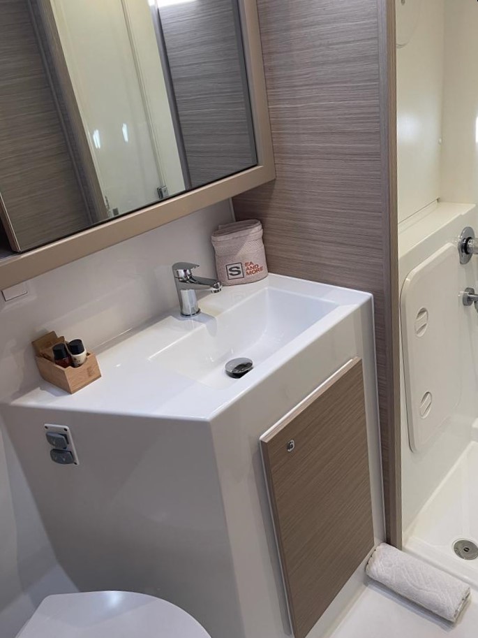 | Inside | Generator, Heizung, Inverter 12V/220V, Klimaanlage (ohne Landstrombedarf), Kühlschrank, Ladegerät, Luftpumpe für Beiboot, Nespresso-Maschine, Pantryausstattung, Radio, Salontisch absenkbar, USB Steckdose, Ventilatoren in Kabinen, Warmwasser, WC (elektr.) |