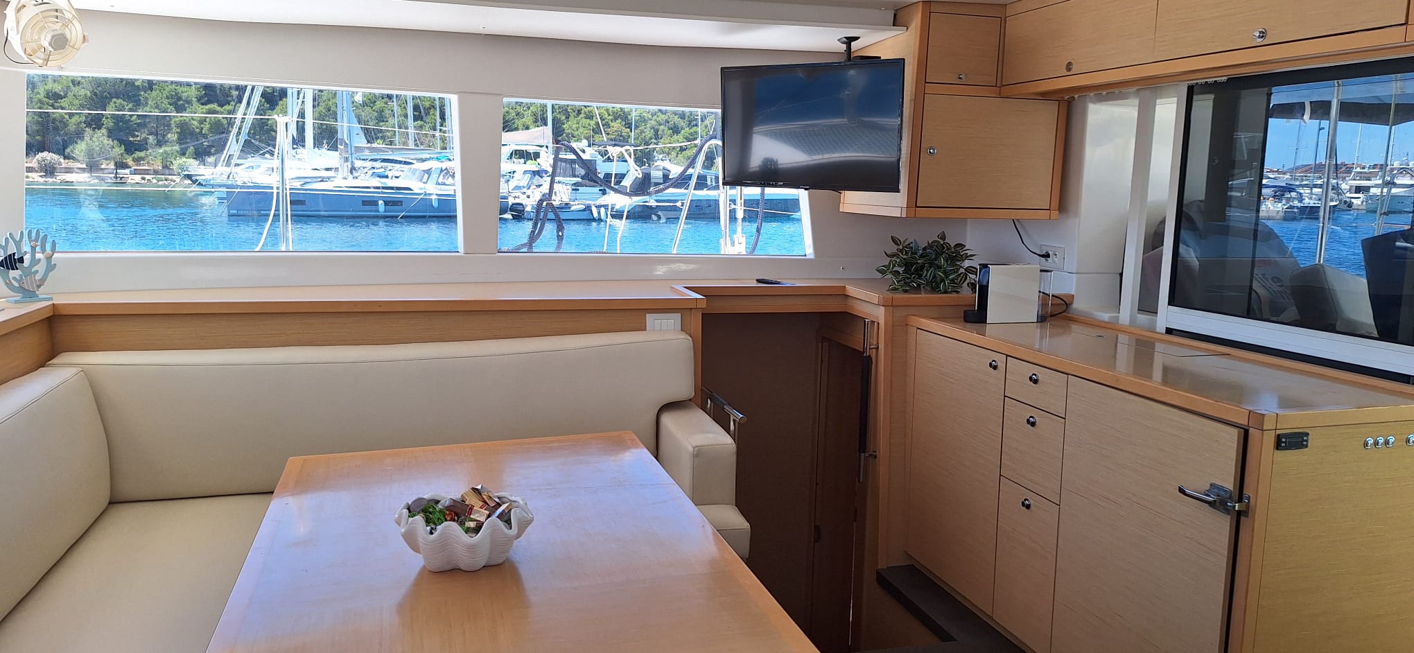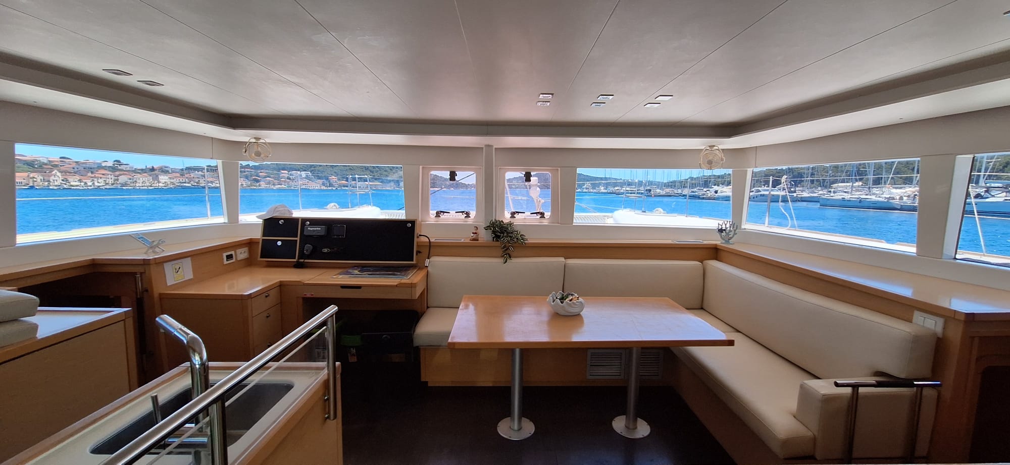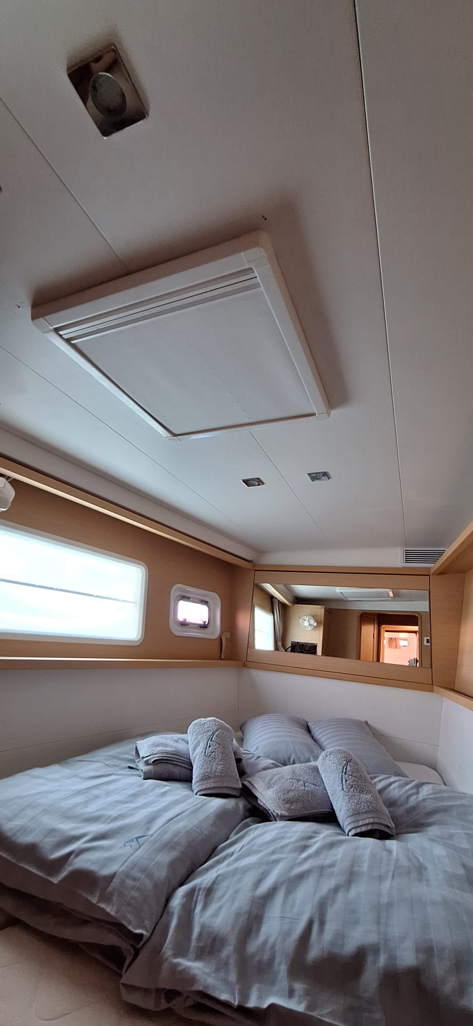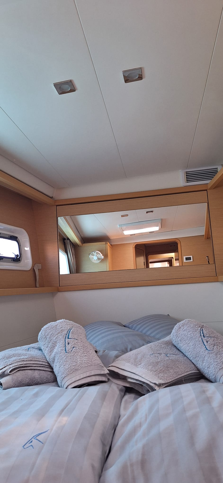 | Inside | Borduhr, DVD-Player, Fäkalientank, Gasherd mit Backofen, Gefrierschrank, Generator, Geschirrspüler, Inverter 12V/220V, Klimaanlage (ohne Landstrombedarf), Kühlschrank, Ladegerät, Lautsprecher im Salon, Mikrowelle, Radio mit MP3 , Spülbecken, TV, Ventilatoren in Kabinen, Warmwasser, Wasserkocher, Watermaker |