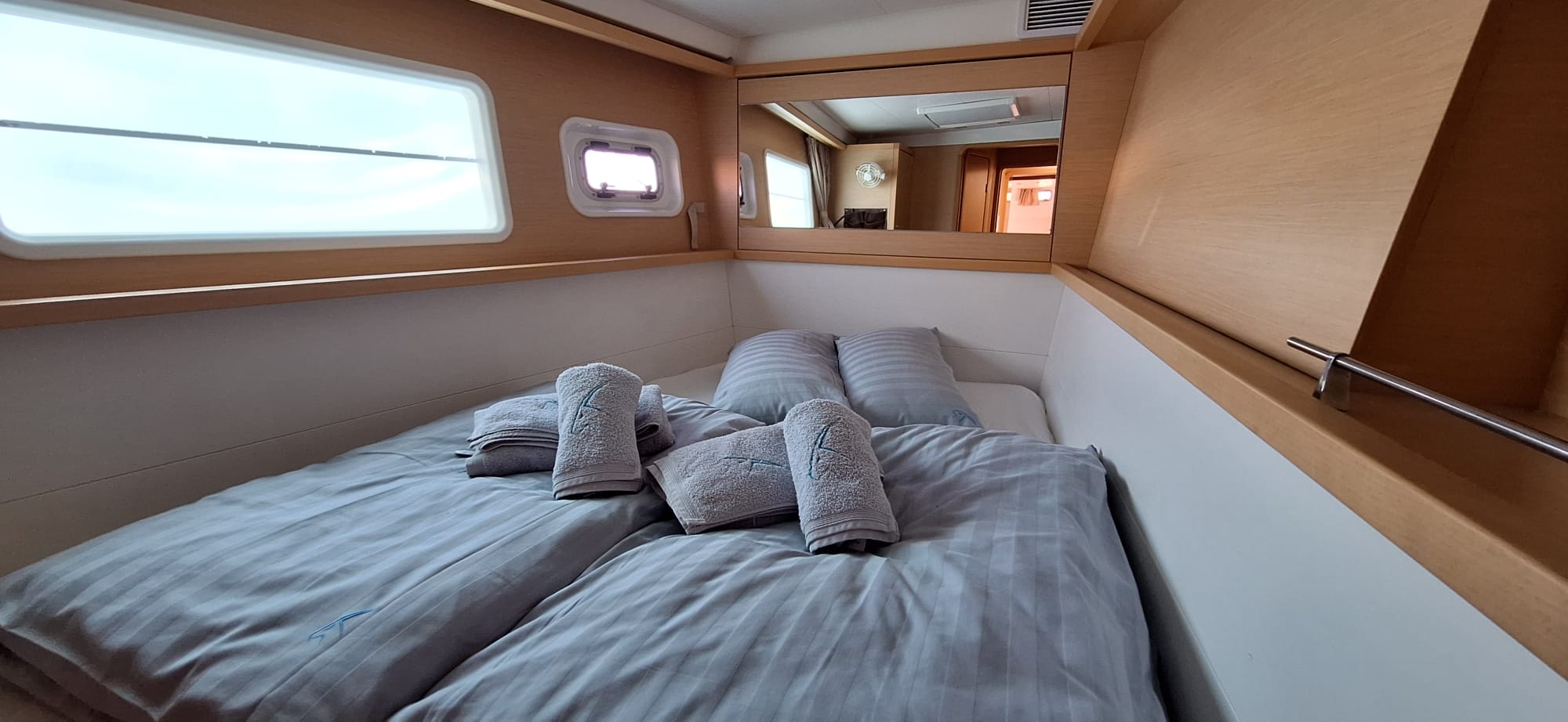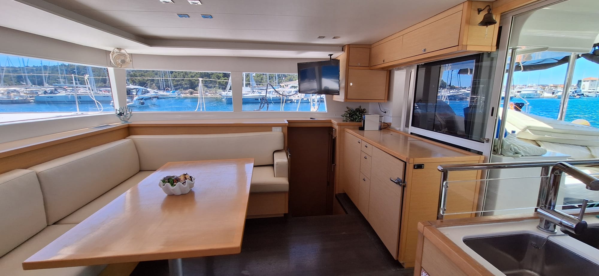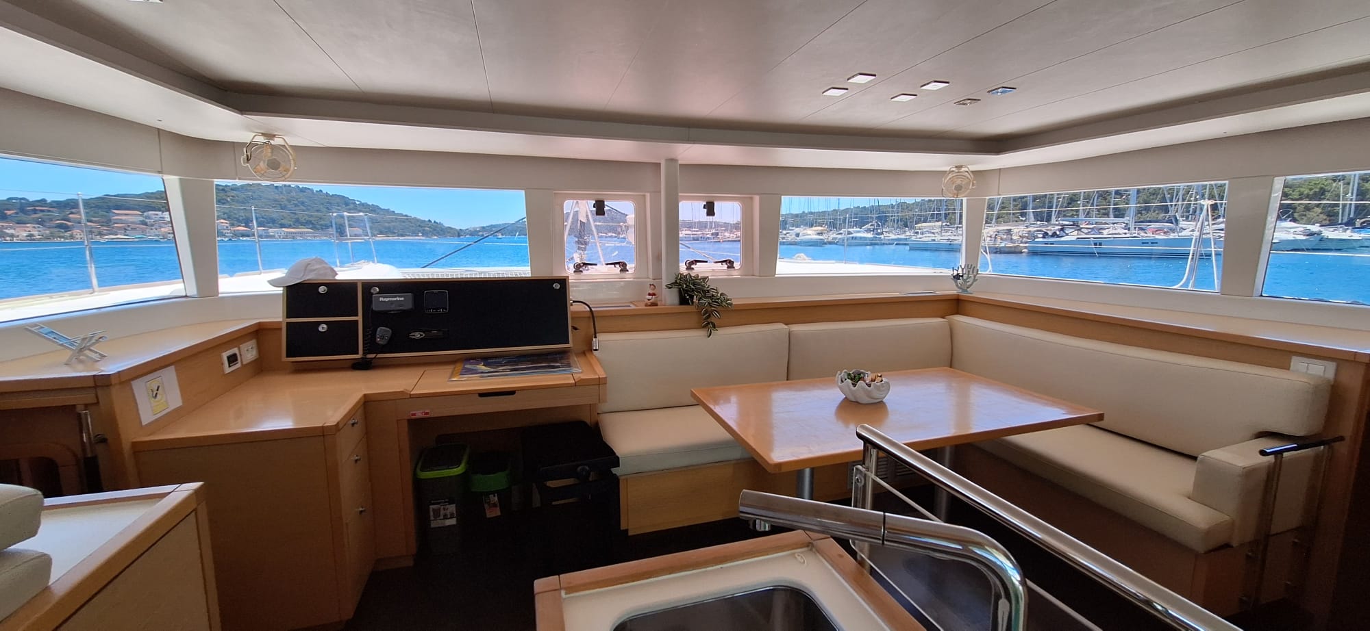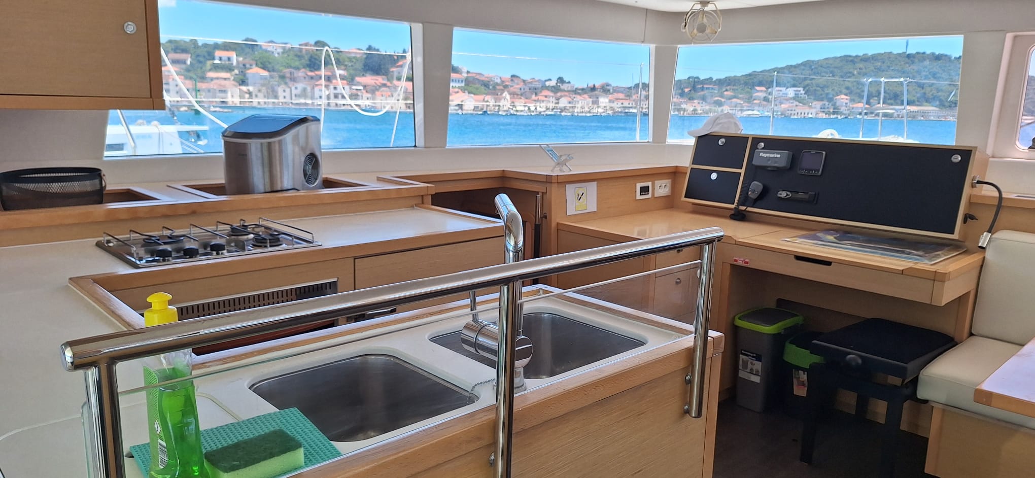 | Inside | Borduhr, DVD-Player, Fäkalientank, Gasherd mit Backofen, Gefrierschrank, Generator, Geschirrspüler, Inverter 12V/220V, Klimaanlage (ohne Landstrombedarf), Kühlschrank, Ladegerät, Lautsprecher im Salon, Mikrowelle, Radio mit MP3 , Spülbecken, TV, Ventilatoren in Kabinen, Warmwasser, Wasserkocher, Watermaker |
