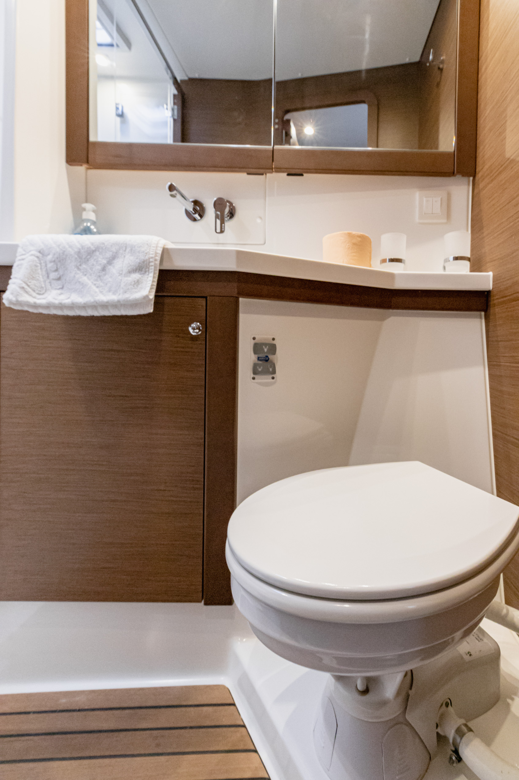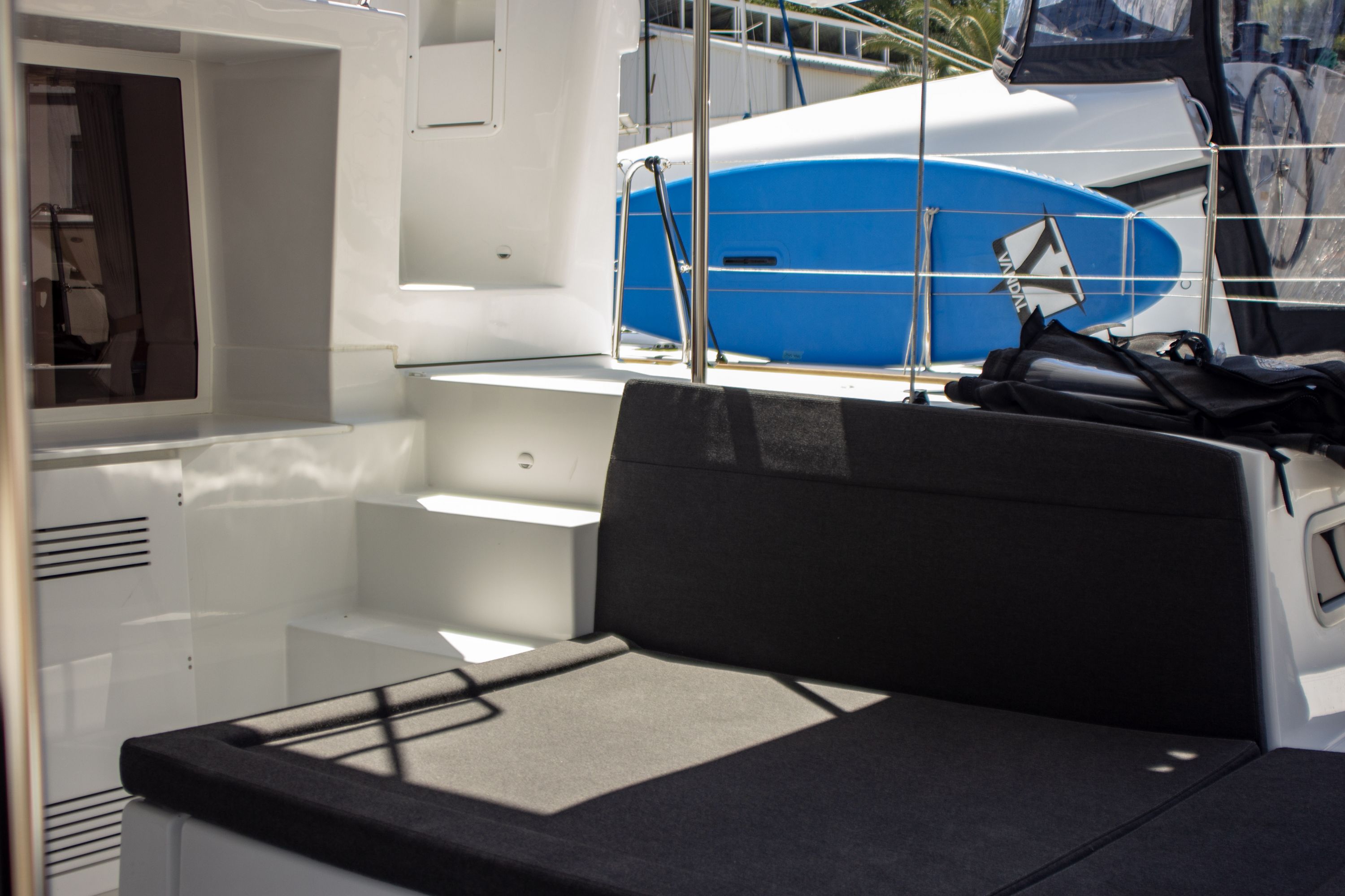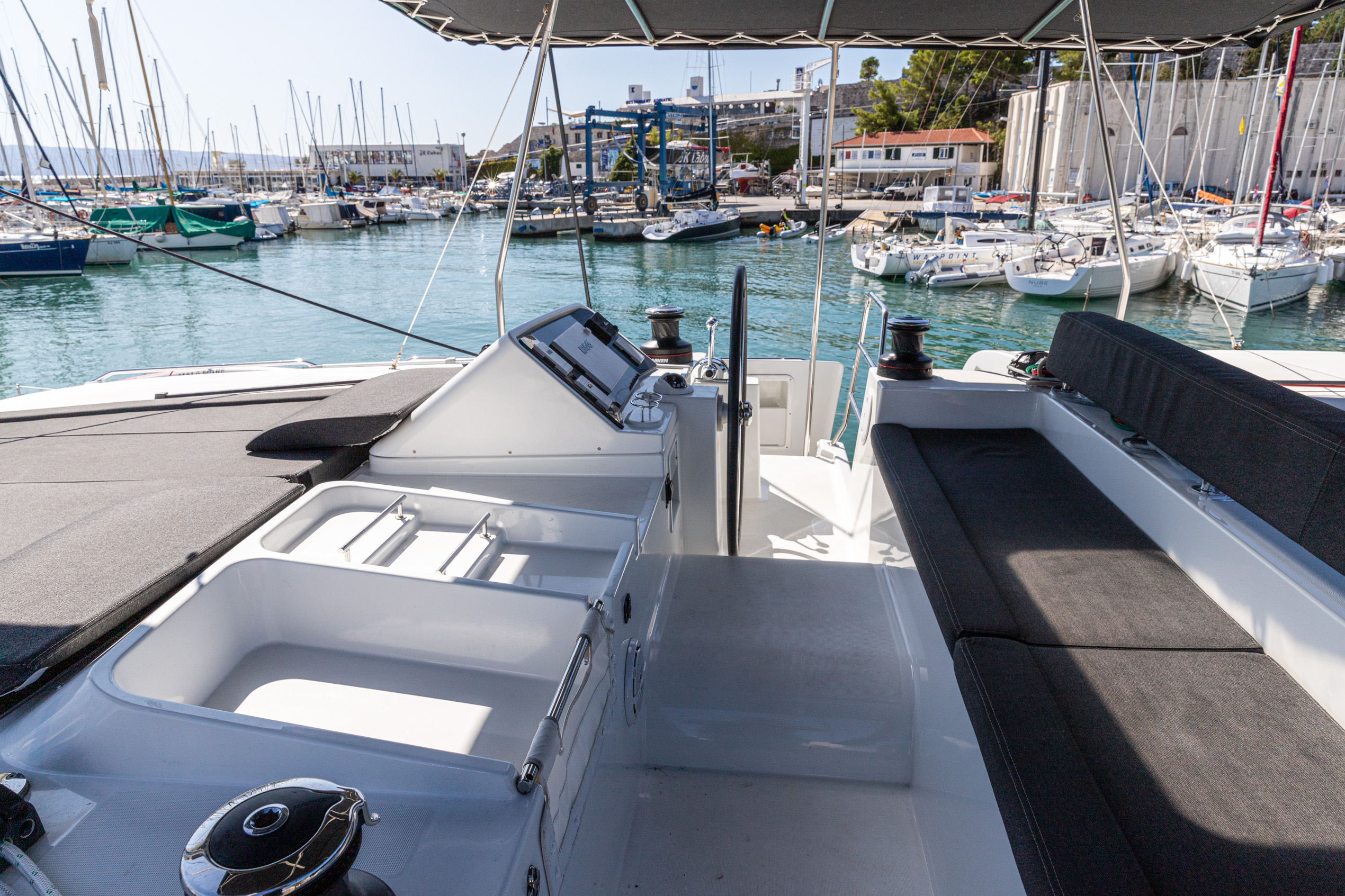 | Outside | 220 V-Landanschluss, Biminitop, Cockpitdusche, Cockpitkühlschrank, Cockpitlautsprecher, Cockpitpolster, Cockpittisch, elektr. Genuawinsch, elektr. Winsch, Gangway, Sprayhood |