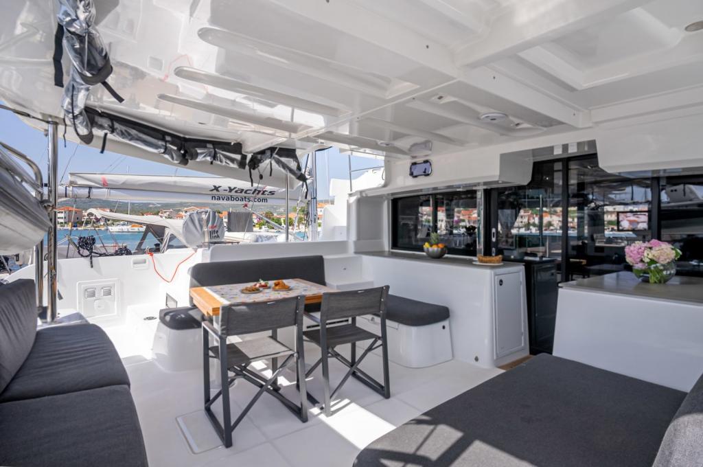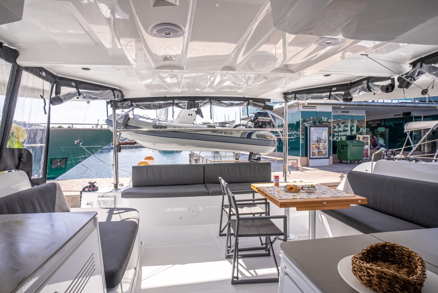 | Outside | 220 V-Landanschluss, Cockpitdusche, Cockpitkühlschrank, Cockpitlautsprecher, Cockpitpolster, Cockpittisch, elektr. Ankerwinsch, Gangway, Hardtop, Schnorchelausrüstung, Sprayhood |