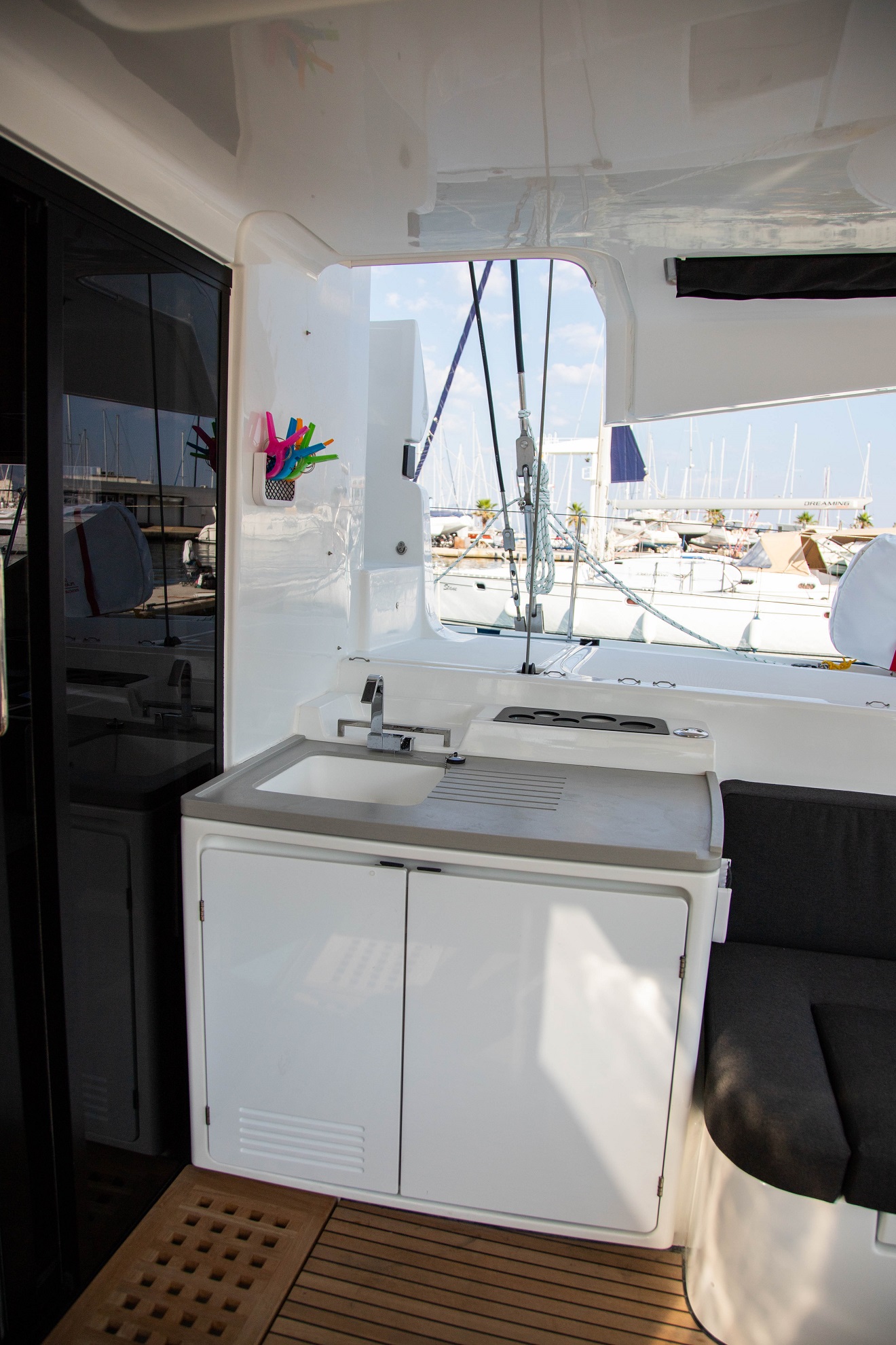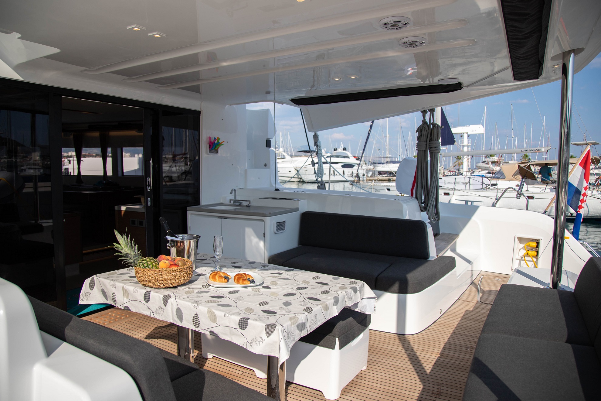 | Outside | 220 V-Landanschluss, Biminitop, Cockpitdusche, Cockpitkühlschrank, Cockpitlautsprecher, Cockpitpolster, Cockpittisch, elektr. Ankerwinsch, Gangway, Schnorchelausrüstung, Sprayhood, Unterwasserbeleuchtung |