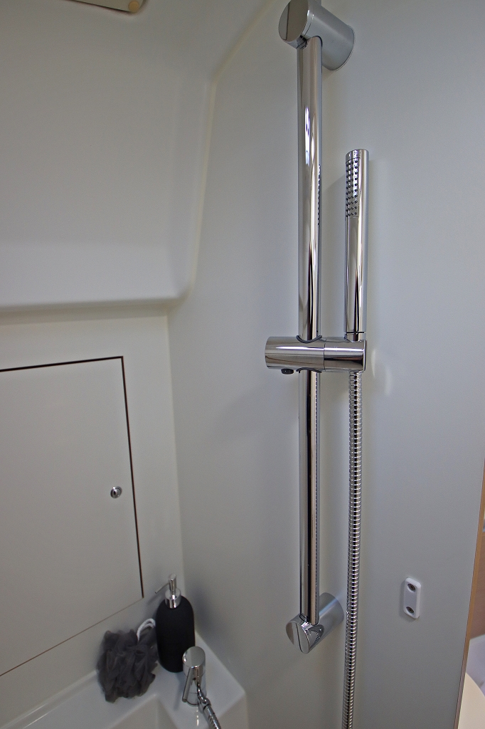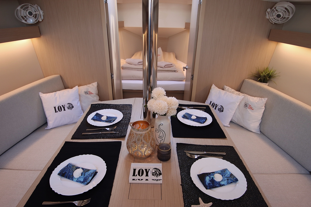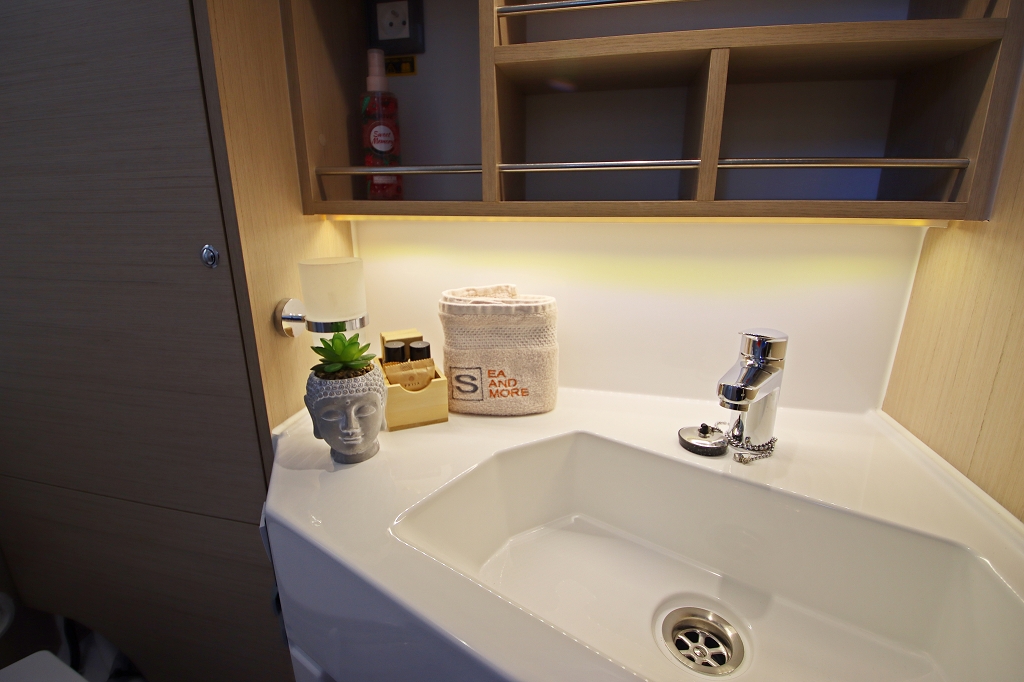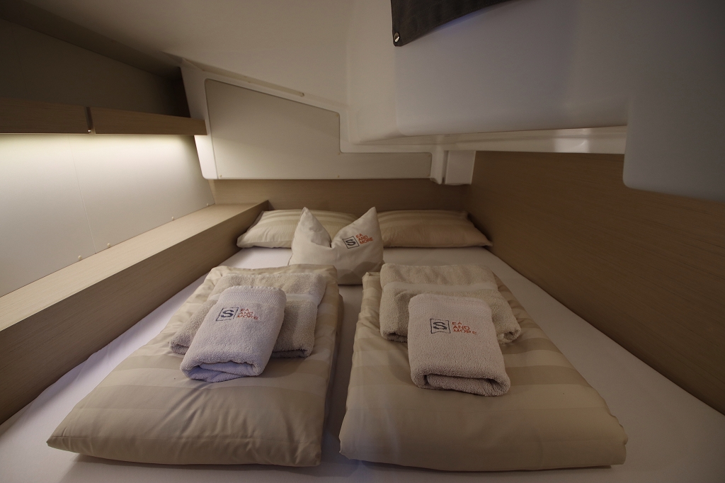 | Inside | FUSION Sound System, Heizung, Inverter 12V/220V, Kaffeemaschine, Kühlschrank, Ladegerät, Lautsprecher im Salon, Luftpumpe für Beiboot, Pantryausstattung, Radio, USB Steckdose, Warmwasser, WC (elektr.) |