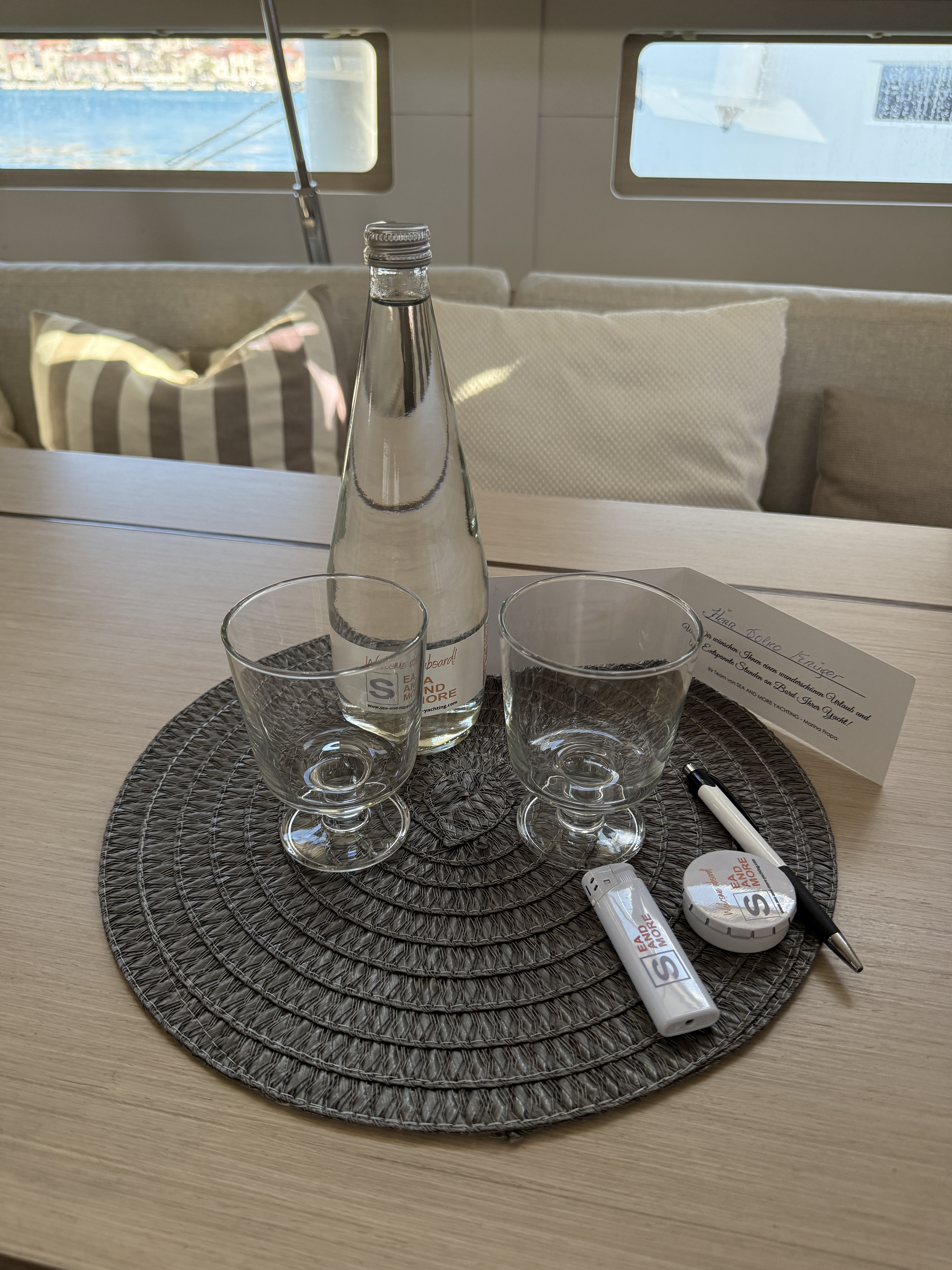 | Outside | 220 V-Landanschluss, Anker mit Kette, Biminitop, Bootshaken, Cockpitdusche, Cockpitlautsprecher, Cockpitpolster, Cockpittisch, Dieselkanister , elektr. Ankerwinsch, Faltpropeller, Fender, Festmacherleinen, Gangway, Kugelfender, Kunststoff-Eimer (Pütz), Sprayhood, Teak im Cockpit, Wasserschlauch, Windex |