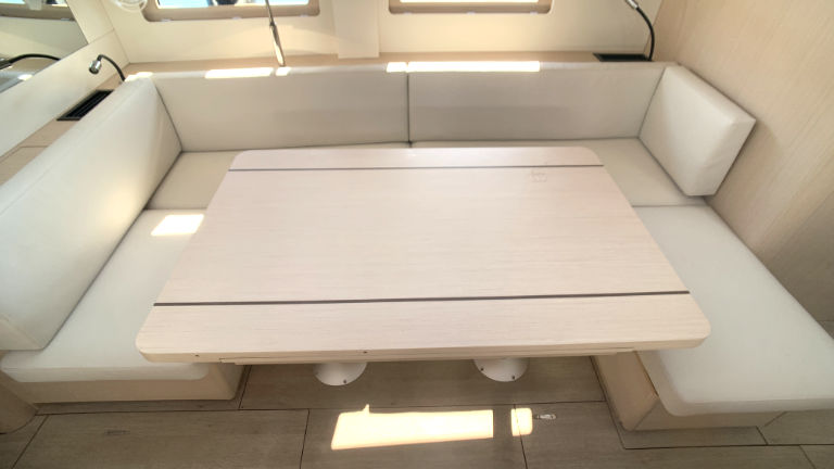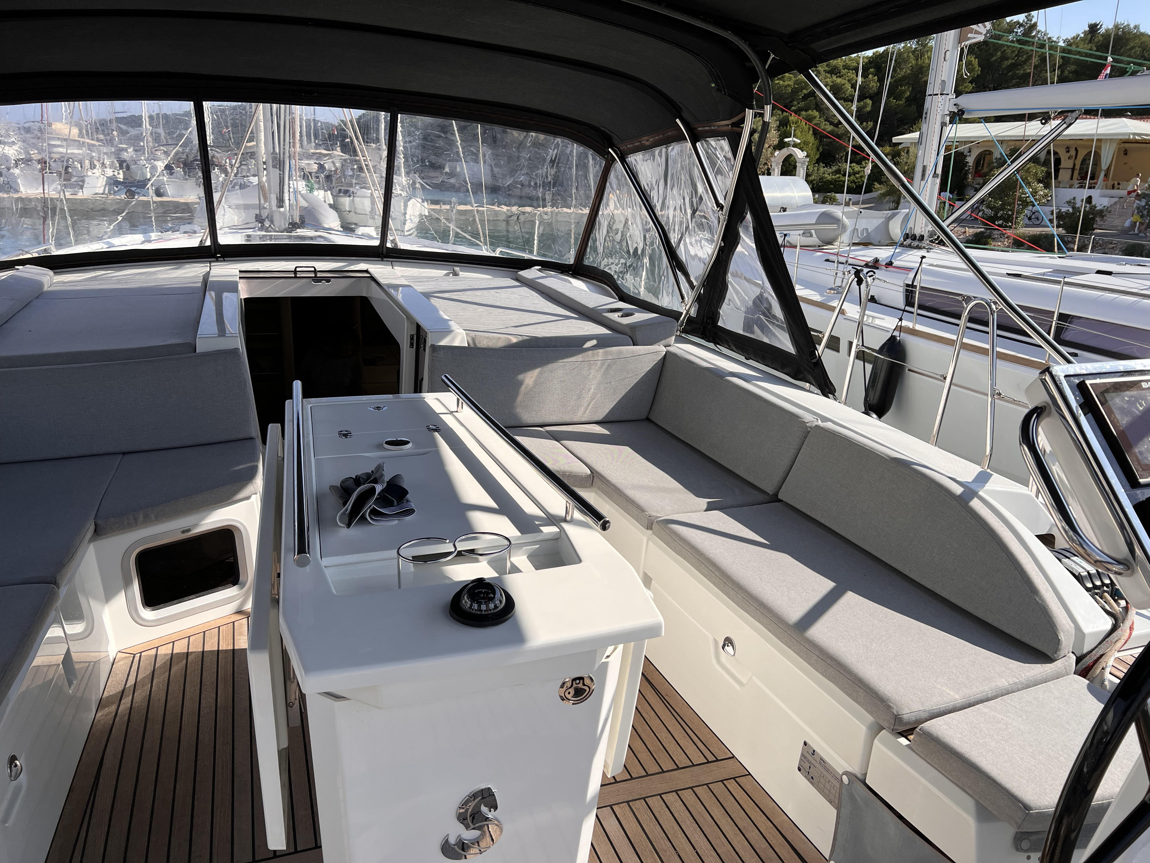 | Outside | Badeleiter, Badeplattform (hydr.), Biminitop, Cockpitdusche, Cockpitlautsprecher, Cockpitleuchte, Cockpitpolster, Cockpittisch, Davits, elektr. Ankerwinsch, elektr. Winsch, Gangway, Grill, Seereling, Solaranlage, Sprayhood, Teak auf Badeplattform, Teak im Cockpit, Teakdeck, Unterwasserbeleuchtung |