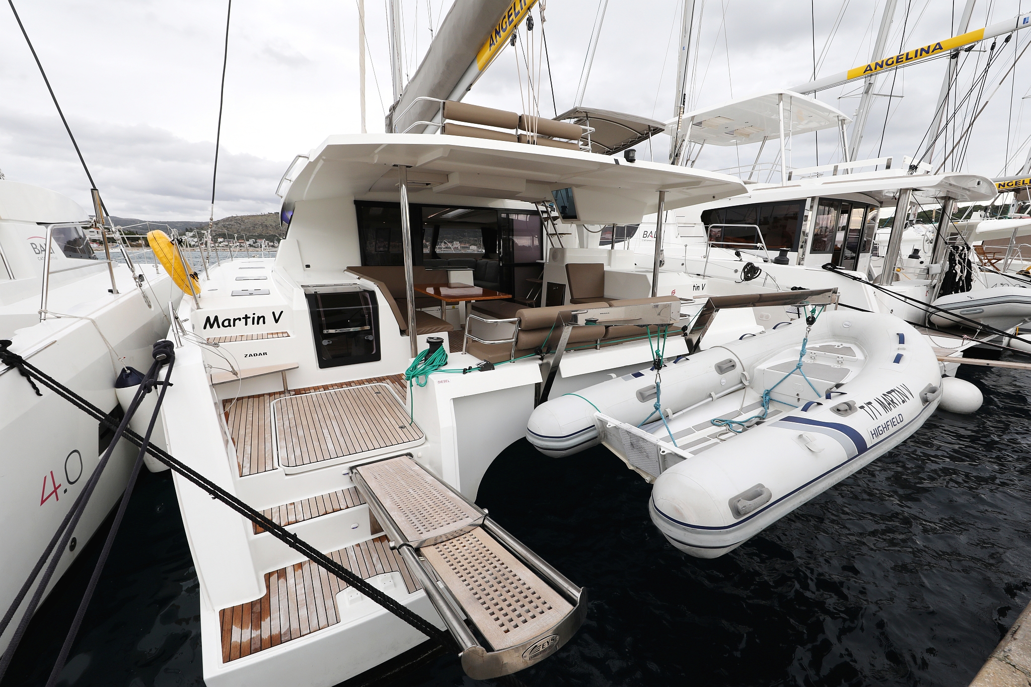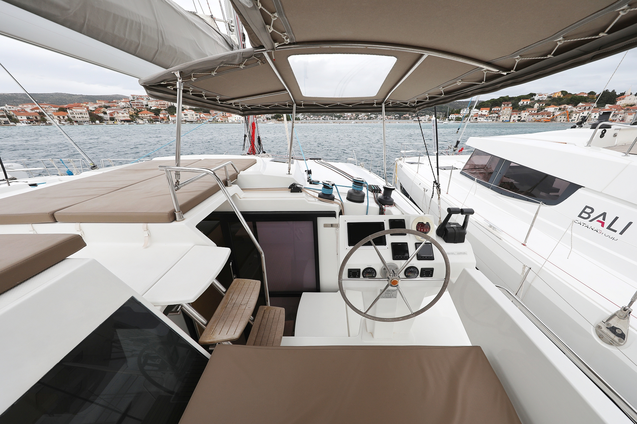 | Outside | Badeleiter, Bootshaken, Cockpitkühlschrank, Cockpitlautsprecher, Cockpitpolster, Cockpittisch, Deckpolster, Delta-Anker, elektr. Genuawinsch, elektr. Großwinsch, Fender, Festmacherleinen, Hardtop, hydraul. Gangway, Jambo Anker, Sonnendeck, Unterwasserbeleuchtung, Wasserschlauch, Winschen |