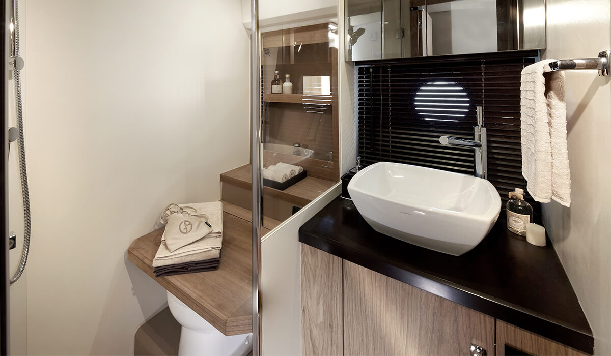 | Inside | DVD-Player, Eisbox, Fäkalientank, Gefrierschrank, Generator, Geschirrspüler, Inverter 12V/220V, Kaffeemaschine, Klimaanlage (ohne Landstrombedarf), Kühlschrank, Ladegerät, Landstromkabel, Mikrowelle, Pantryausstattung, Radio mit CD und MP3, TV, Warmwasser, Waschmaschine, Watermaker, WC (elektr.) |