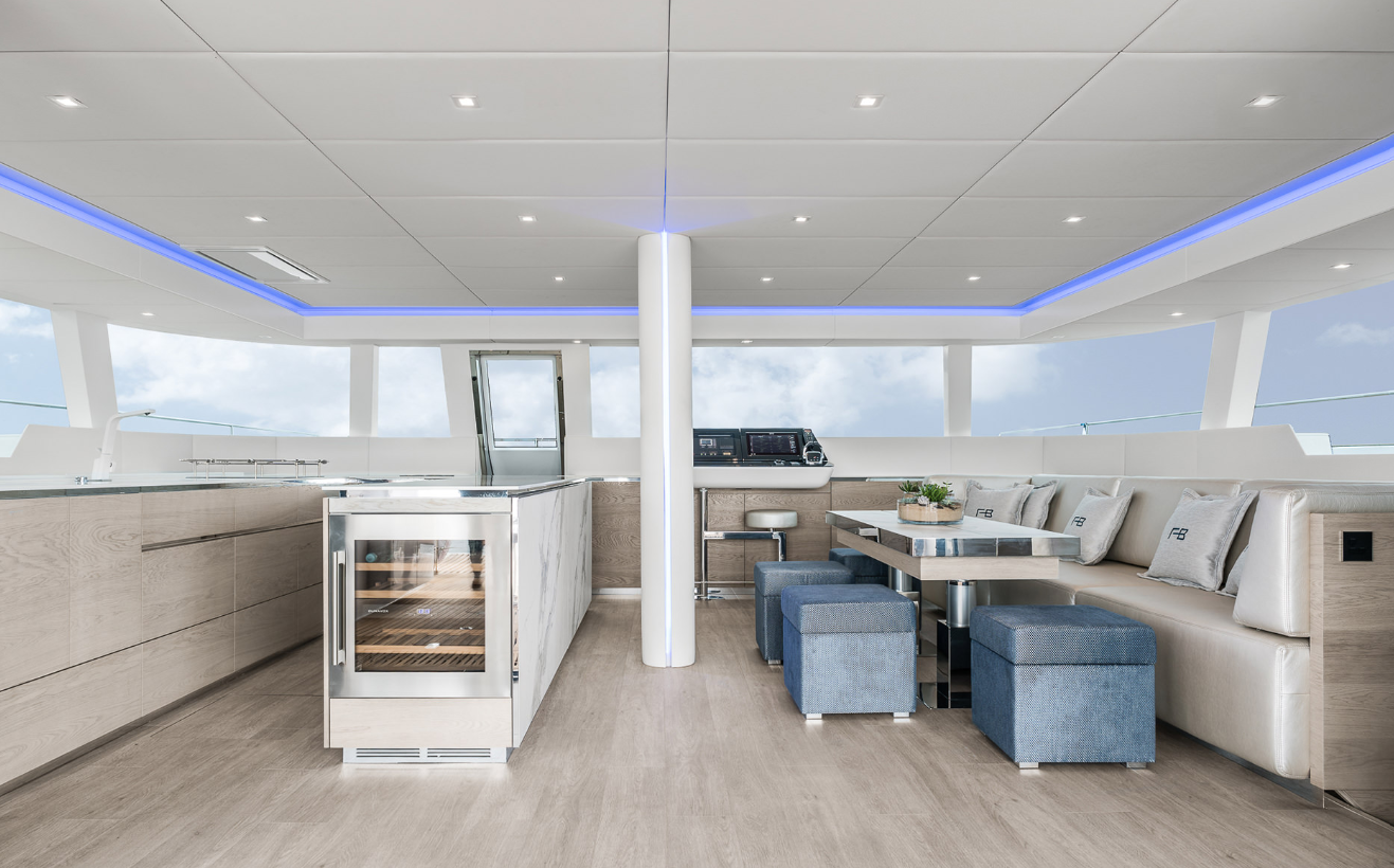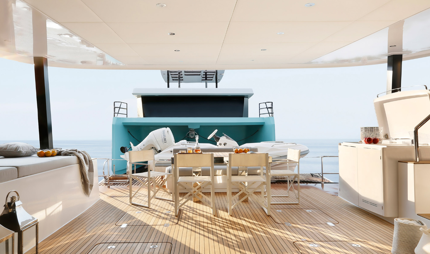 | Outside | 220 V-Landanschluss, Angelausrüstung, Badeplattform, Cockpitkühlschrank, Cockpitlautsprecher, Cockpitpolster, Flybridge, Gangway, Hardtop, Kugelfender, Schnorchelausrüstung, Teak auf Flybridge, Teak im Cockpit, Teakdeck |