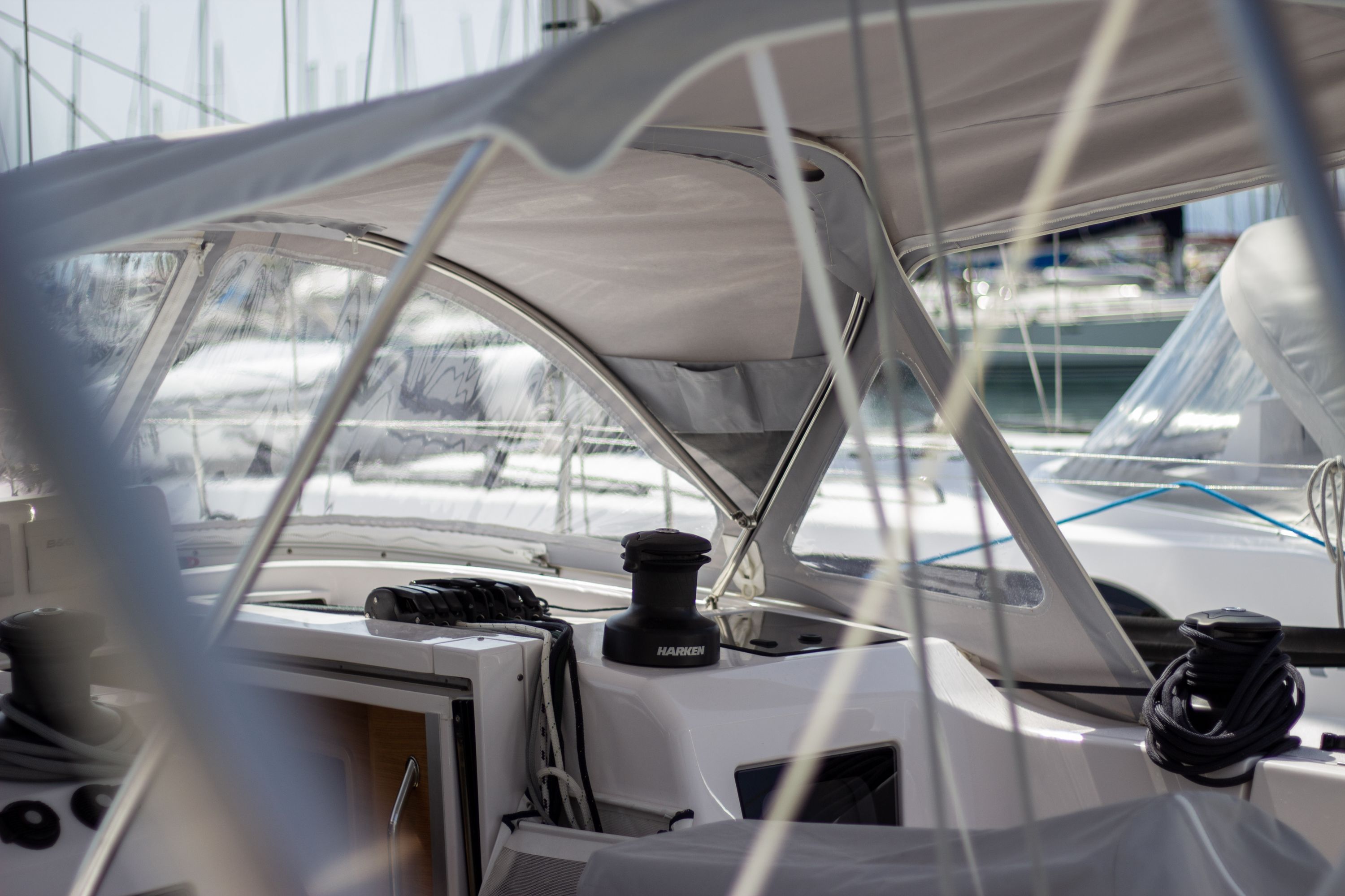 | Outside | 220 V-Landanschluss, Biminitop, Cockpitdusche, Cockpitlautsprecher, Cockpitpolster, Cockpittisch, elektr. Ankerwinsch, Gangway, Sprayhood, Teak im Cockpit |