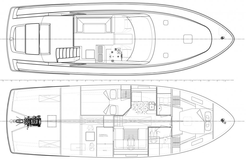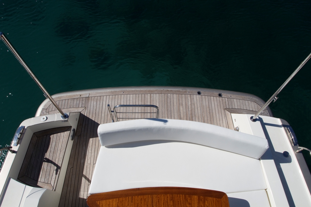| Outside | Anker mit Kette, Aschenbecher, Badeleiter, Badeplattform, Biminitop, Bootshaken, Cockpitdusche, Cockpittisch, Deckbürste, Dieselkanister , elektr. Ankerwinsch, Fender, Festmacherleinen, Gangway, Heckdusche, Kunststoff-Eimer (Pütz), Polster auf Flybridge, Sonnendeck, Wasserschlauch |