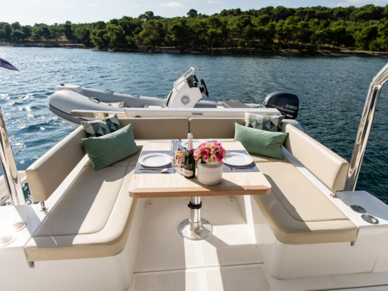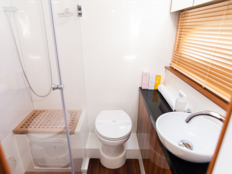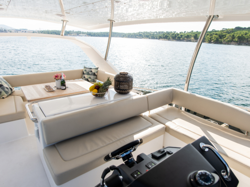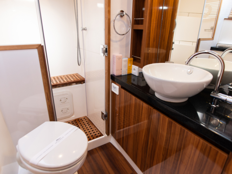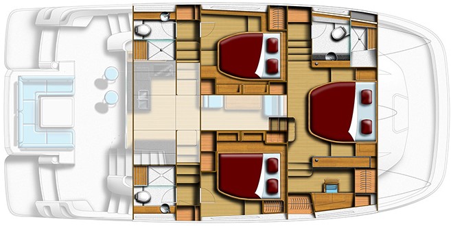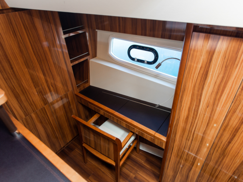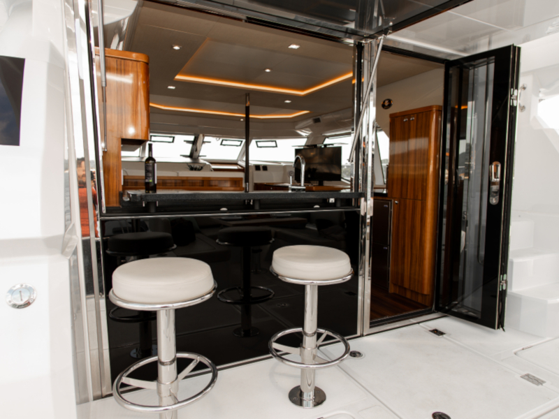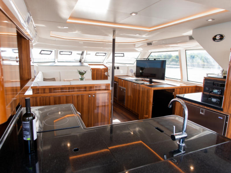 | Inside | Eiswürfelmaschine, Fäkalientank, FUSION Sound System, Gefrierschrank, Generator, Herd mit Ceranfeld, Klimaanlage (ohne Landstrombedarf), Kühlschrank, LCD Fernseher + DVD, Mikrowelle, Watermaker, WC (elektr.), Weinkühlschrank |