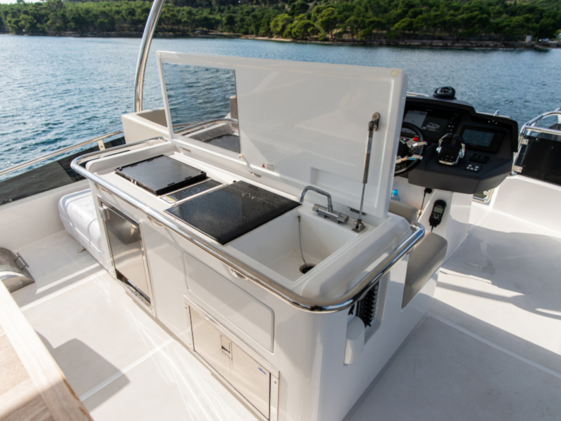 | Outside | Ankerwinsch, Cockpitlautsprecher, Davits, Grill und Kühlschrank auf Flybridge |