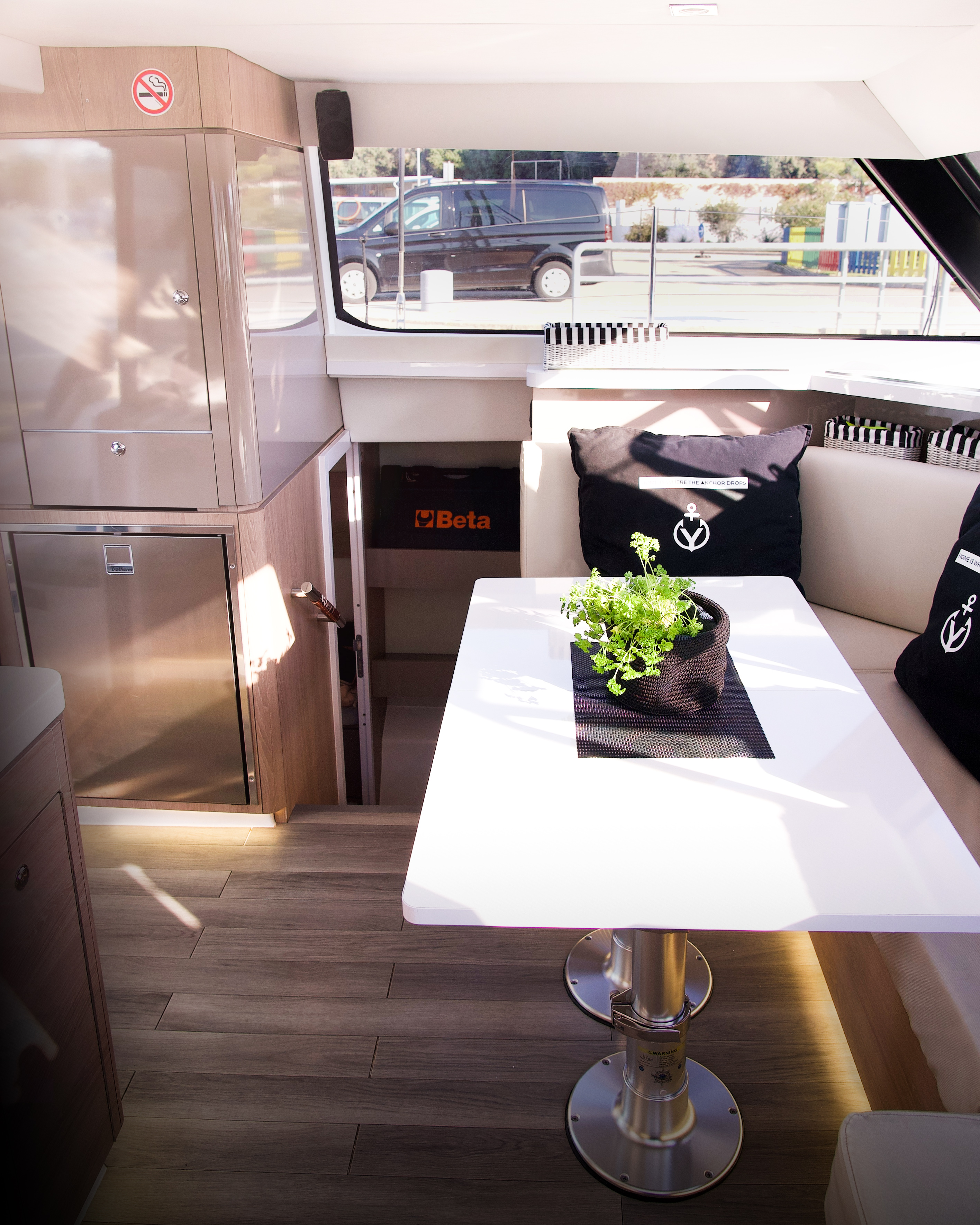 | Outside | 220 V-Landanschluss, Anker mit Kette, Badeplattform, Biminitop, Cockpitdusche, Cockpitlautsprecher, elektr. Ankerwinsch, Sprayhood |