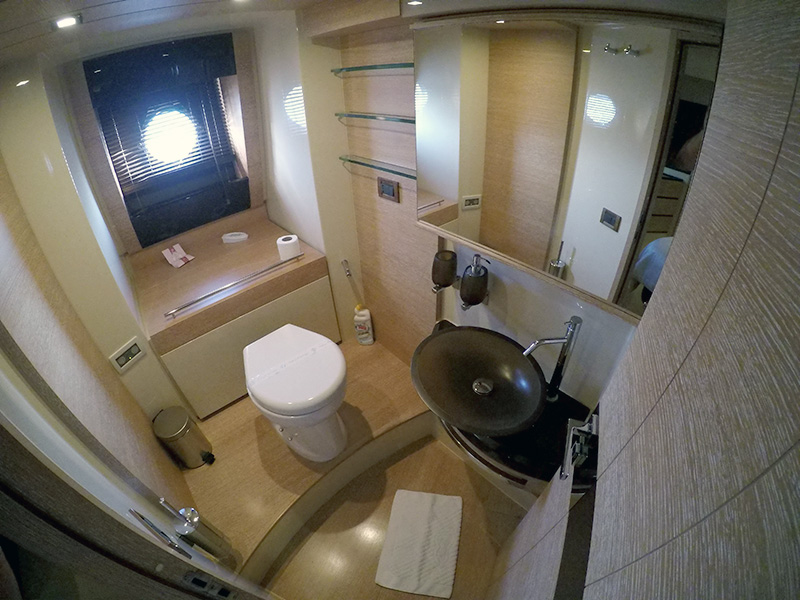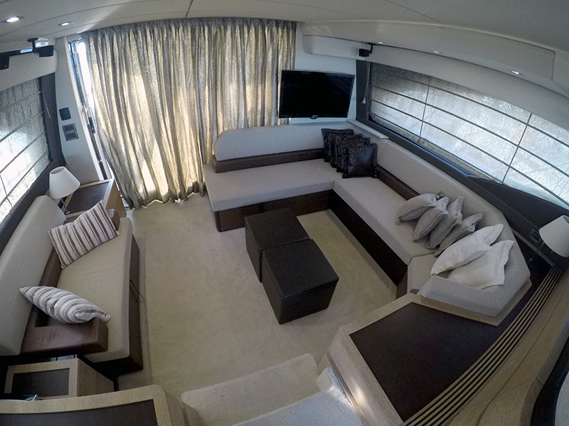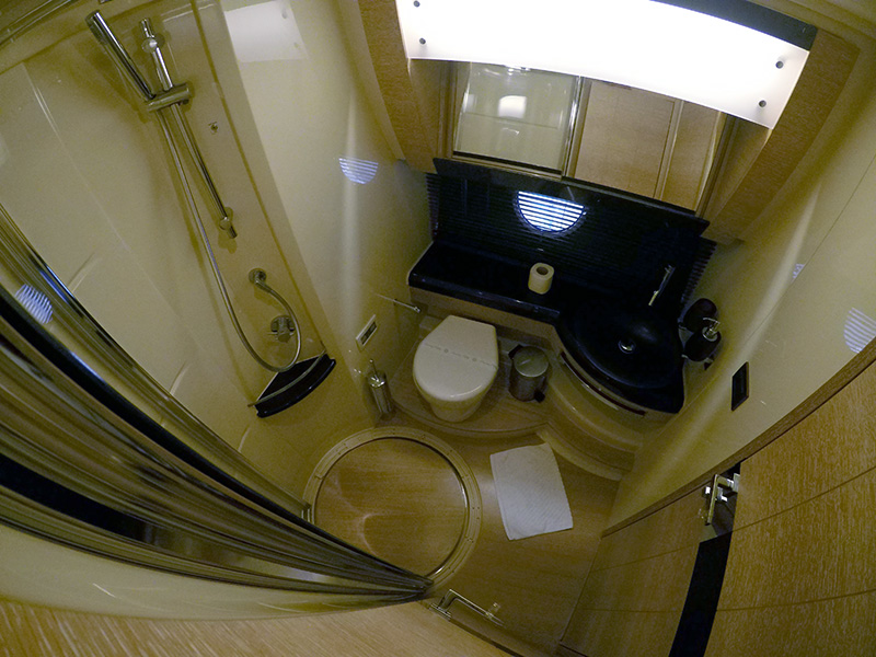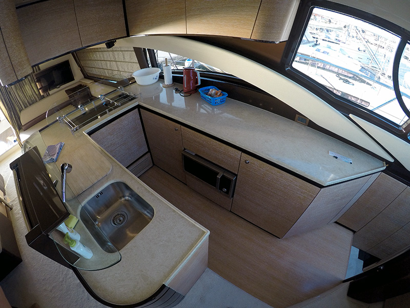 Inside Backofen, DVD-Player, Eiswürfelmaschine, Fäkalientank, Gasherd, Generator, Heizung, Klimaanlage (ohne Landstrombedarf), Kühlschrank, Luftpumpe für Beiboot, Mikrowelle, Radio mit USB, TV, Warmwasser