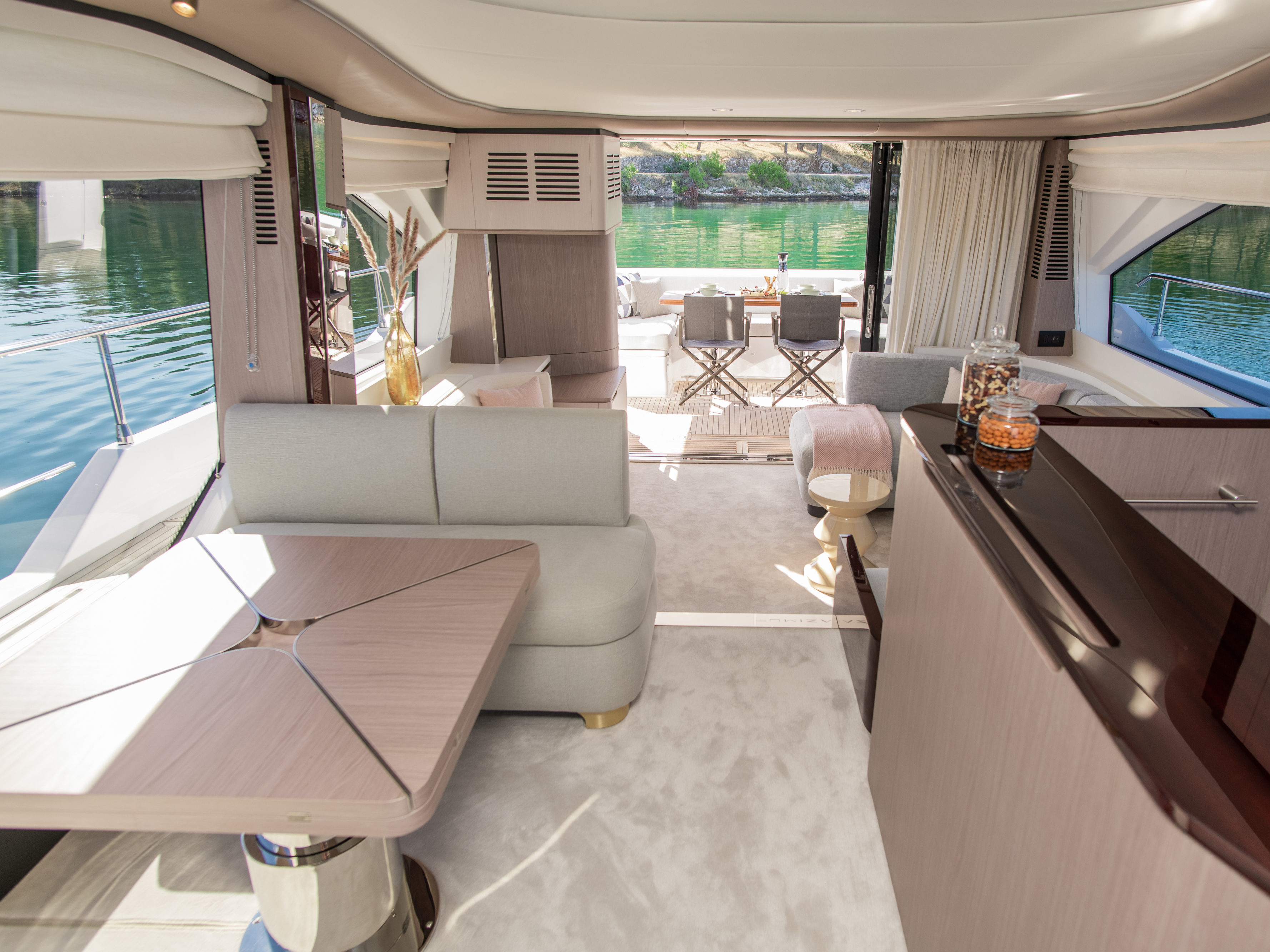 | Inside | Backofen, Druckwasser, Eiswürfelmaschine, Fäkalientank, FUSION Sound System, Gasdetektor, Gefrierschrank, Generator, Geschirrspüler, Heizung, Inverter 12V/220V, Klimaanlage (ohne Landstrombedarf), Ladegerät, LCD Fernseher + DVD, Mikrowelle, Radio, Safe für Wertsachen, Smart-TV, Spülbecken, Wasserkocher, Watermaker, WC (elektr.) |