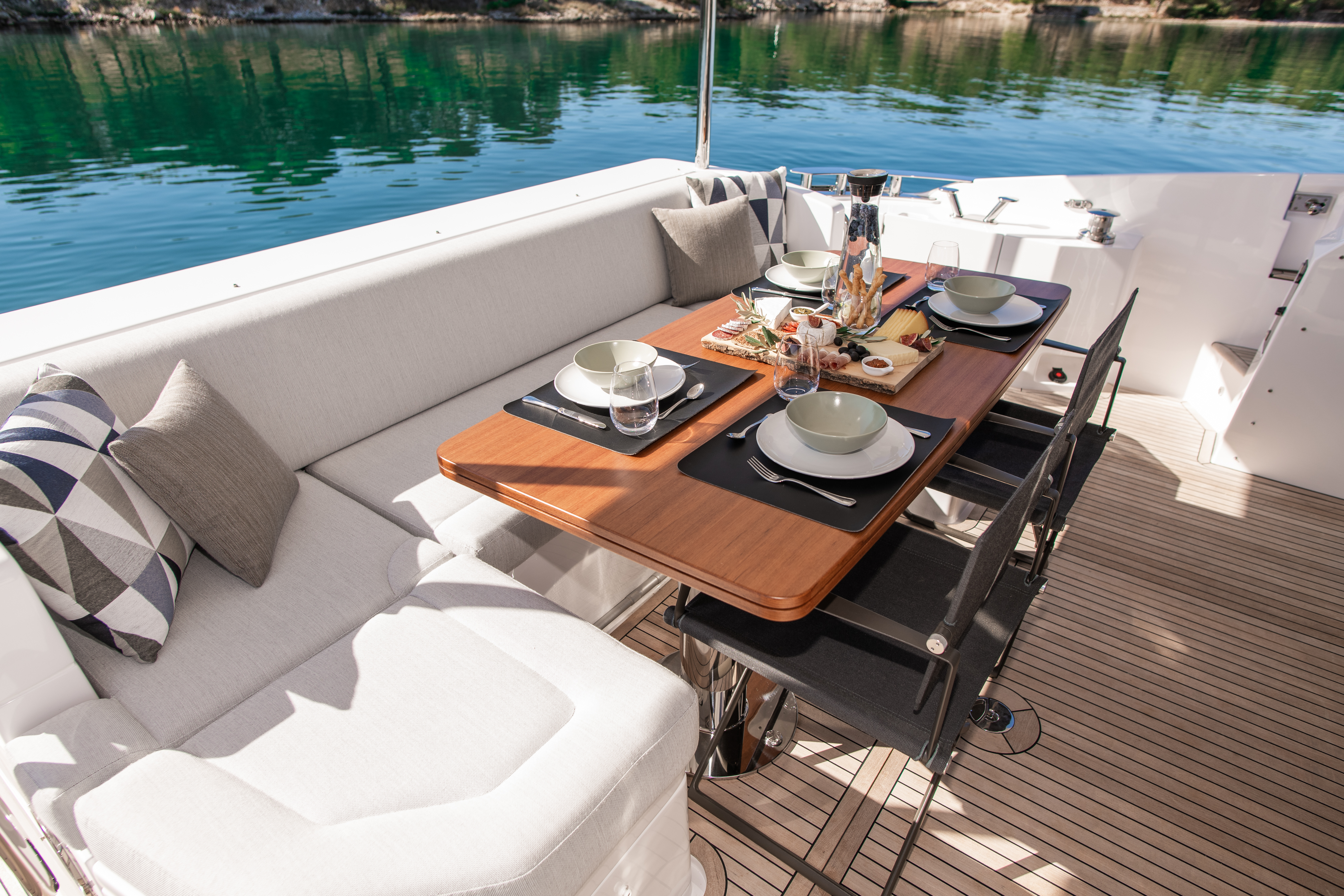 | Outside | 220 V-Landanschluss, Badeleiter, Badeplattform (hydr.), Cockpitlautsprecher, Cockpittisch, Deckpolster, Fender, Gangway, Heckdusche, Seereling, Sonnensegel, Teak auf Badeplattform, Teak im Cockpit, Unterwasserbeleuchtung, Wet Bar |