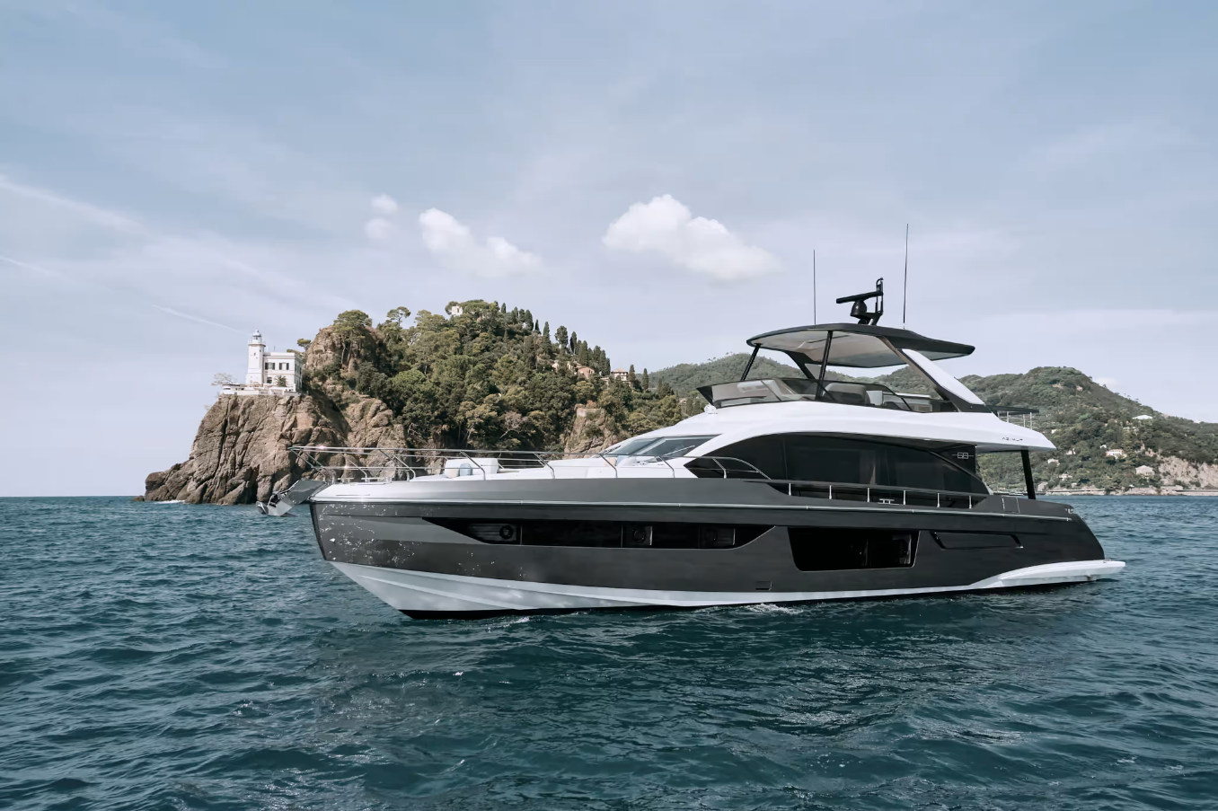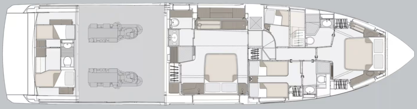 | Outside | 220 V-Landanschluss, Badeleiter, Badeplattform, Deckpolster, elektr. Ankerwinsch, Fender, Gangway, Hardtop, Heckdusche, Seereling, Sonnensegel, Unterwasserbeleuchtung, Wet Bar |