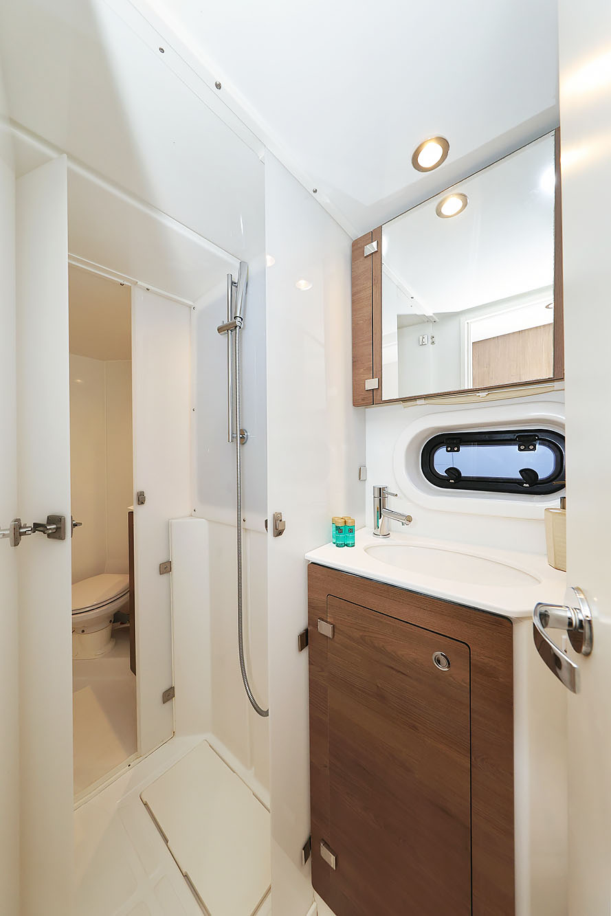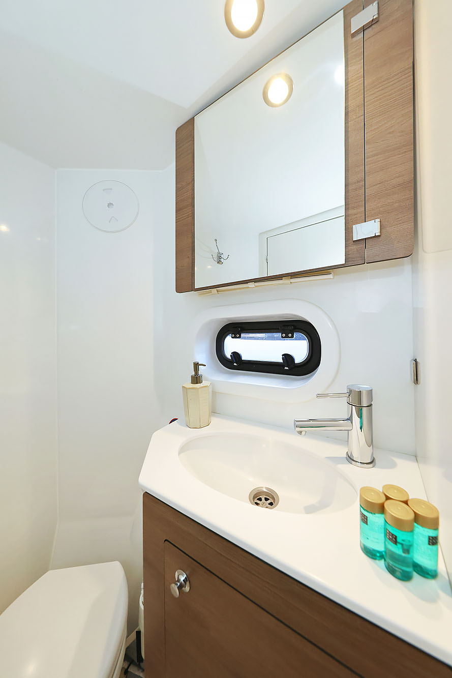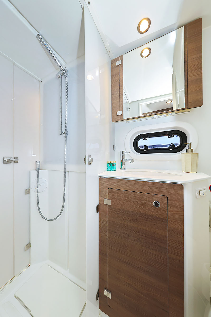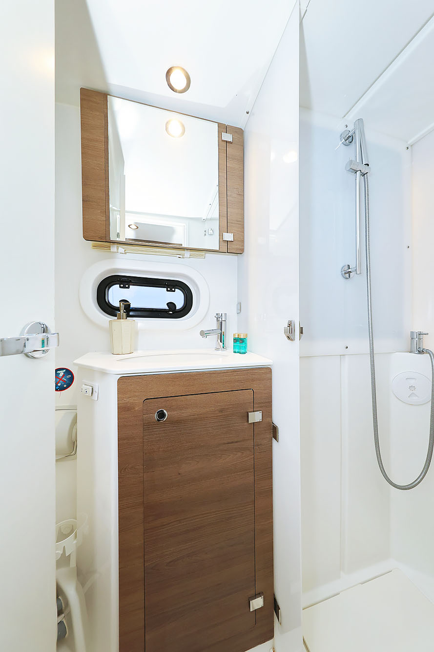 | Outside | 220 V-Landanschluss, Anker mit Kette, Badeleiter, Biminitop, Cockpitdusche, Cockpitlautsprecher, Cockpittisch, Deckpolster, elektr. Ankerwinsch, elektr. Winsch, Grill, Solaranlage, Windex |