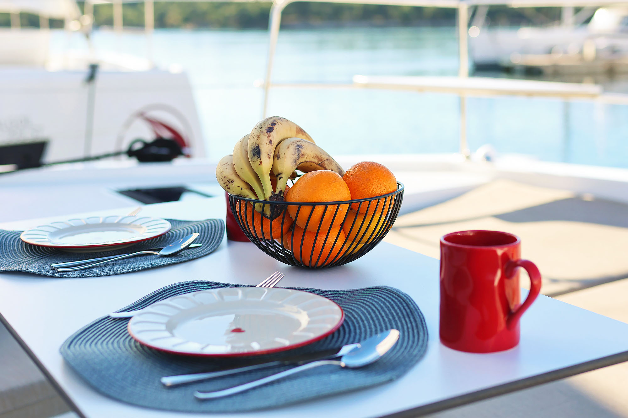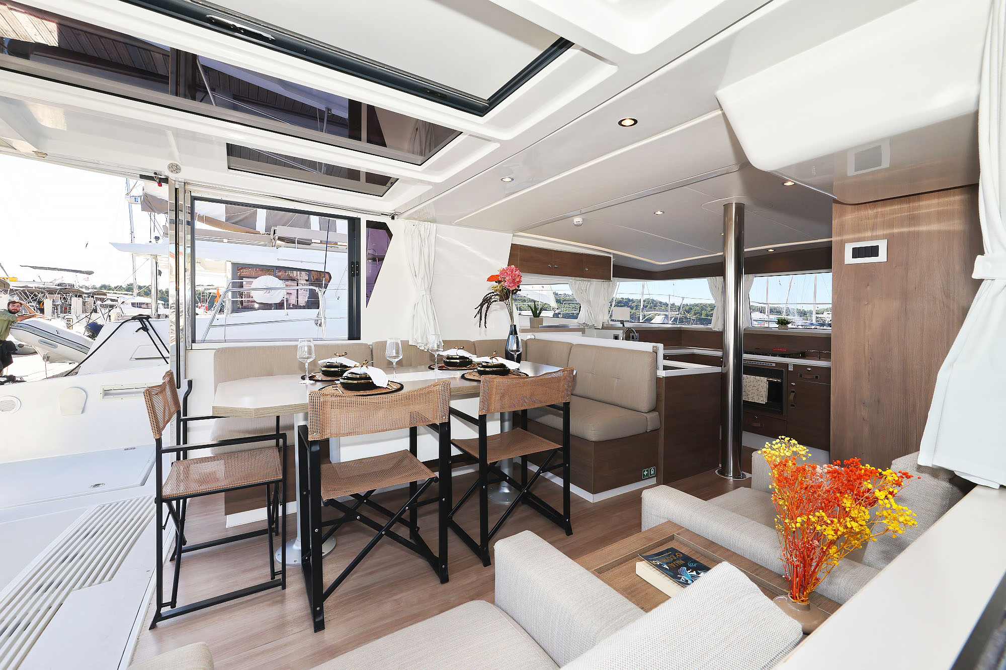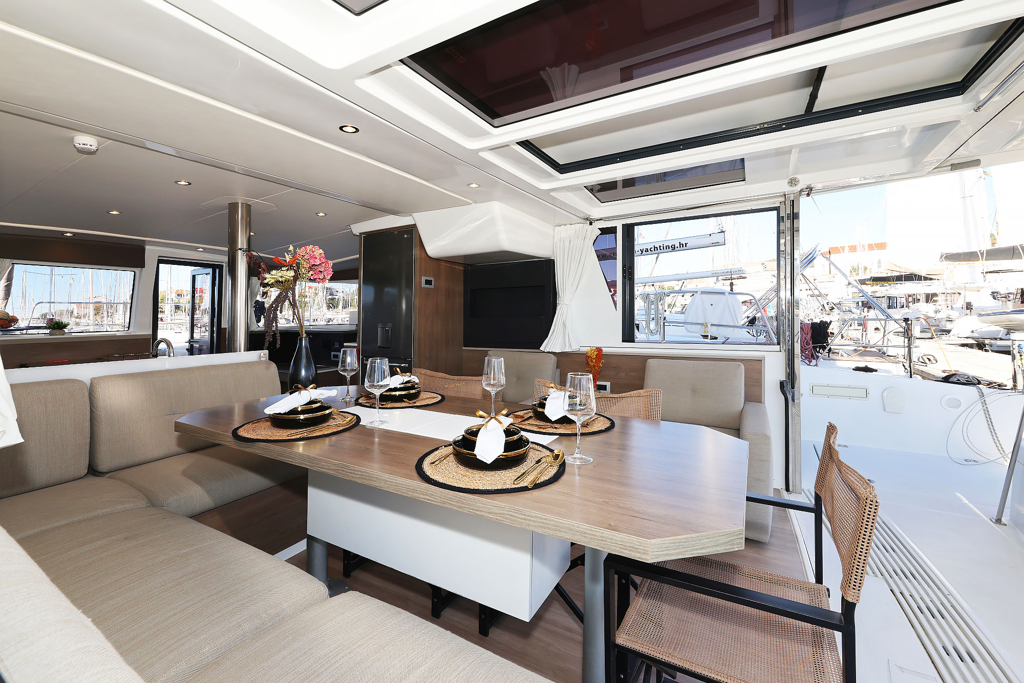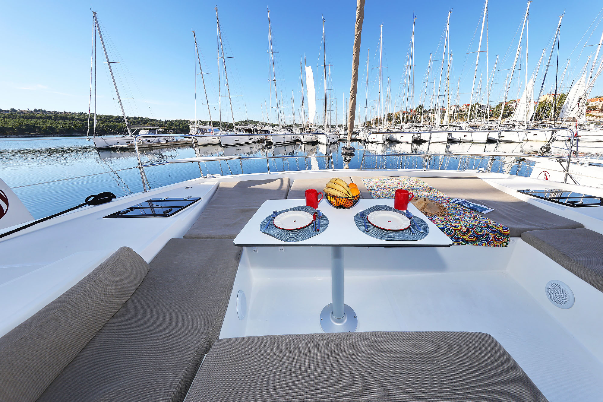 | Outside | 220 V-Landanschluss, Anker mit Kette, Badeleiter, Biminitop, Cockpitdusche, Cockpitlautsprecher, Cockpittisch, Deckpolster, elektr. Ankerwinsch, elektr. Winsch, Grill, Solaranlage, Windex |