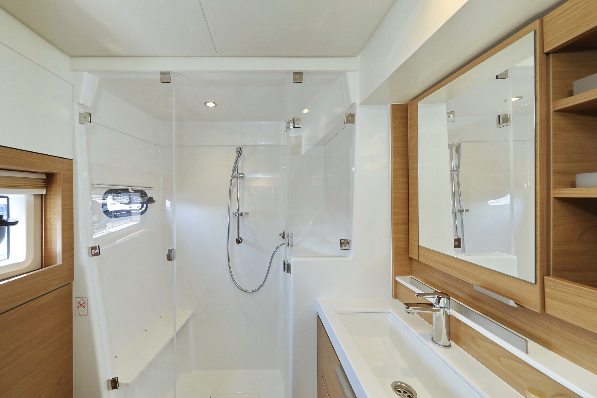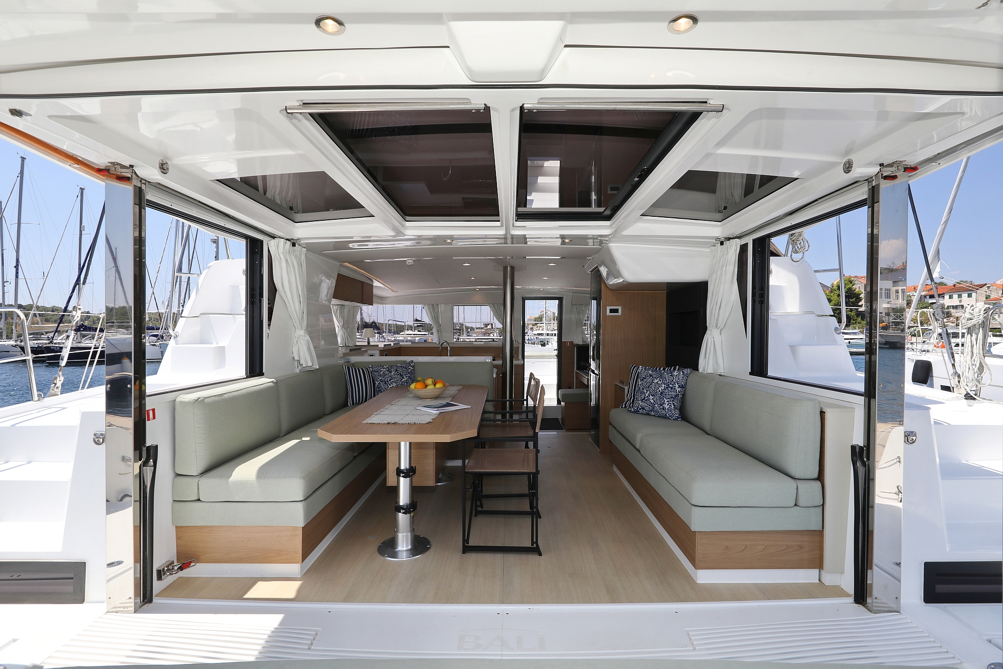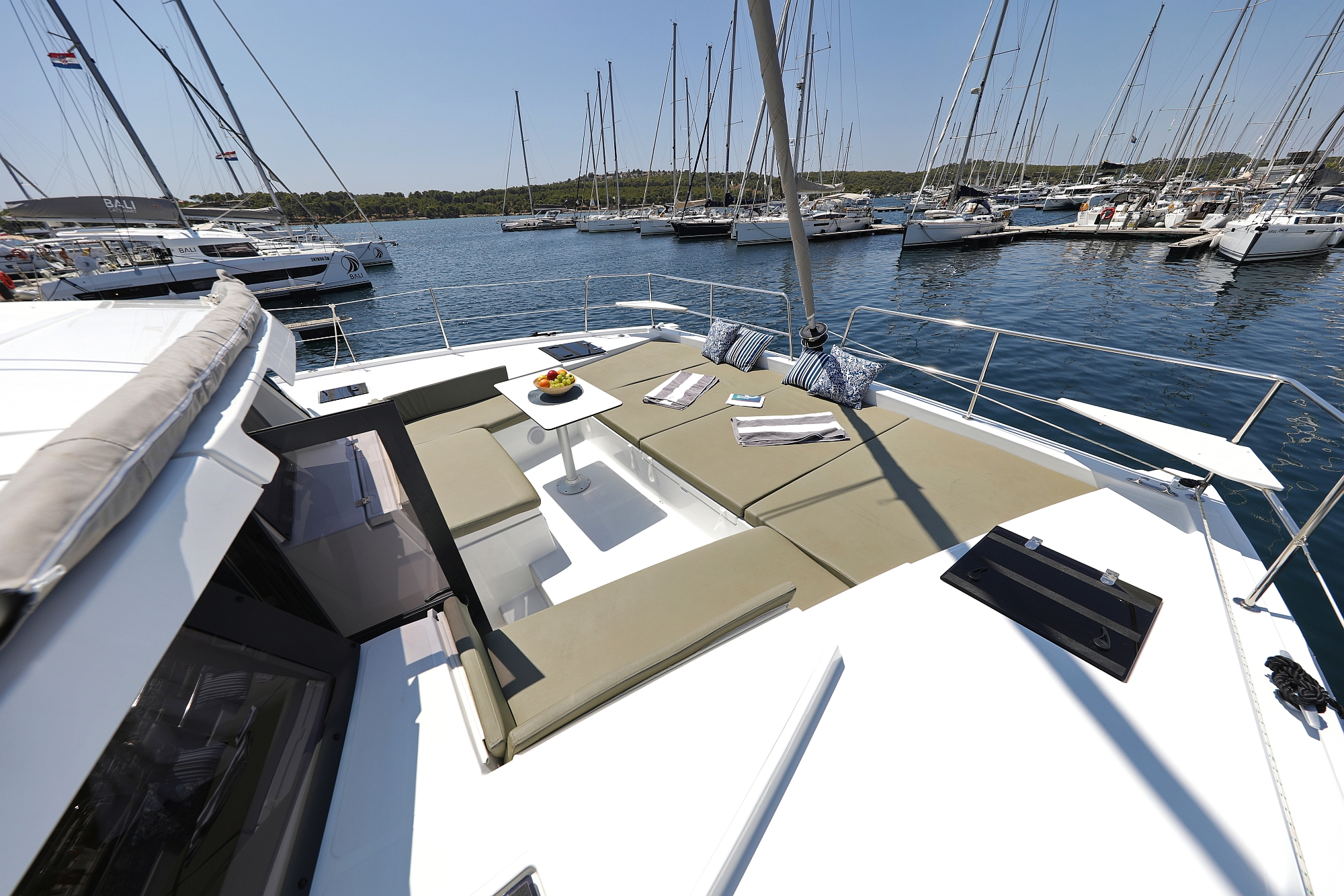 | Outside | 220 V-Landanschluss, Anker mit Kette, Badeleiter, Badeplattform, Biminitop, Cockpitdusche, Cockpitlautsprecher, Cockpittisch, elektr. Ankerwinsch, elektr. Großwinsch, Grill, Solaranlage |