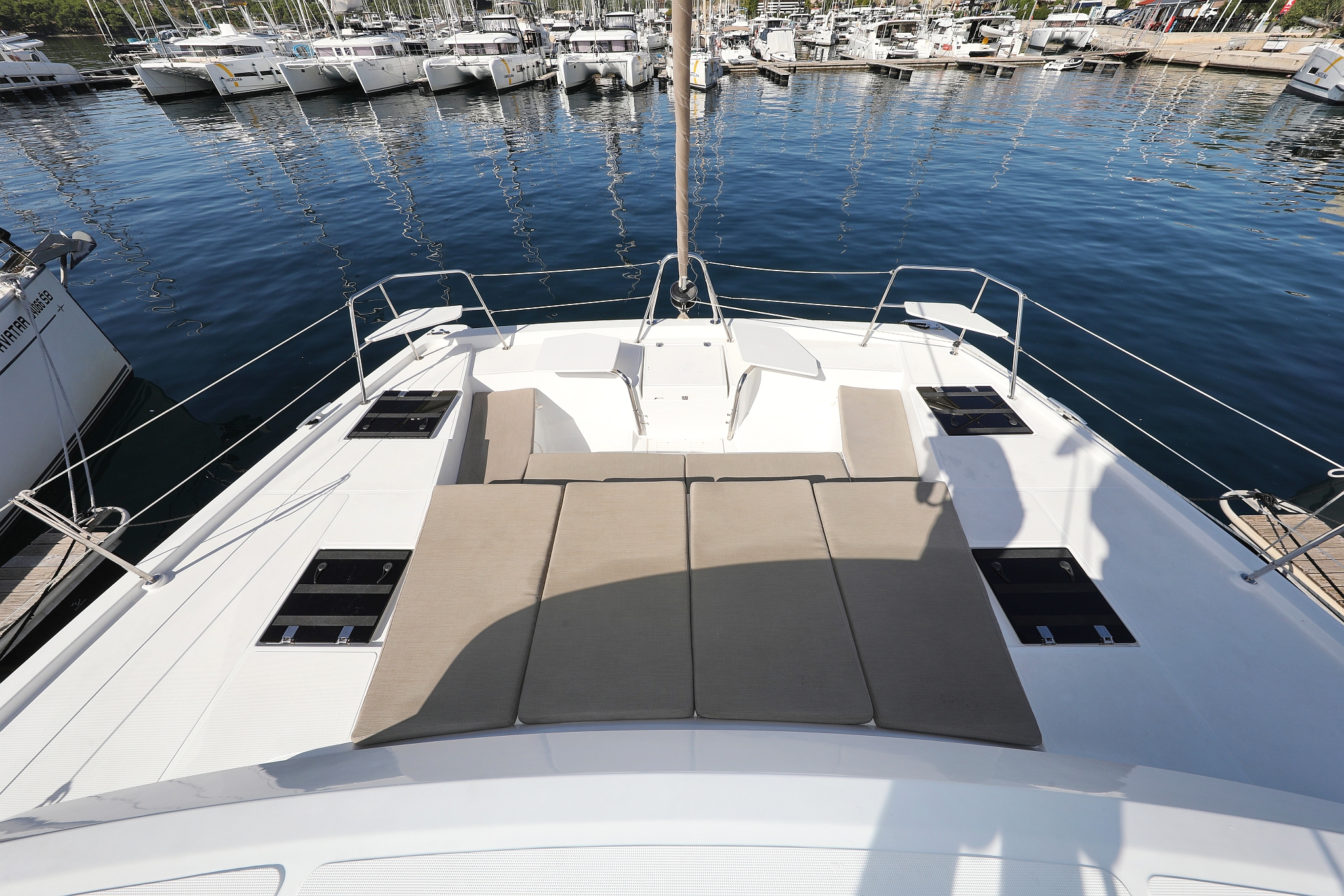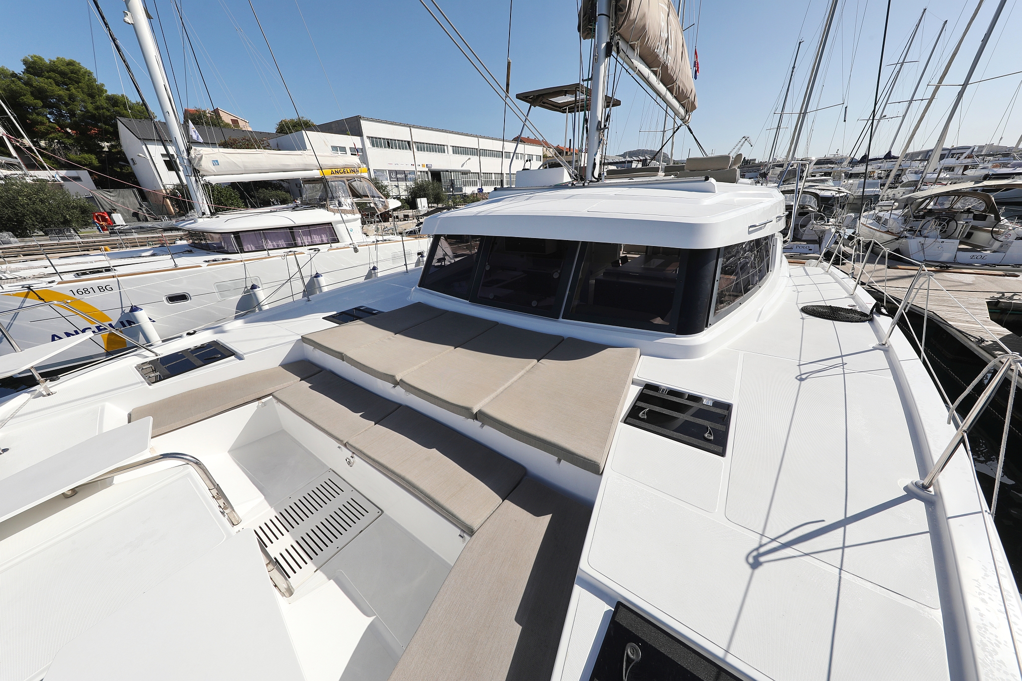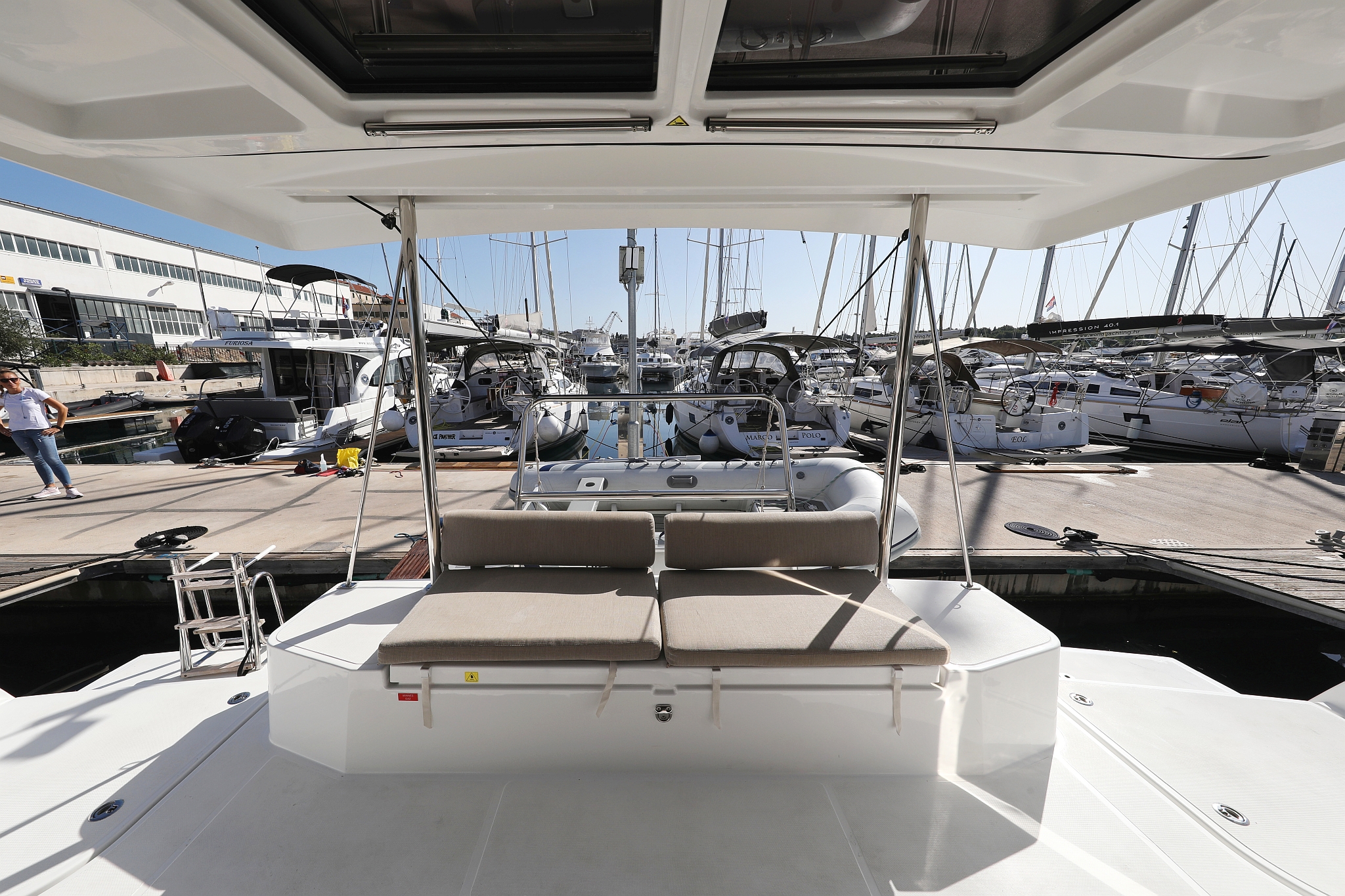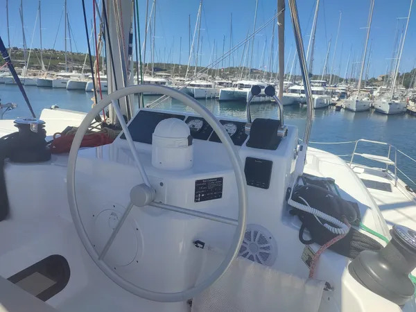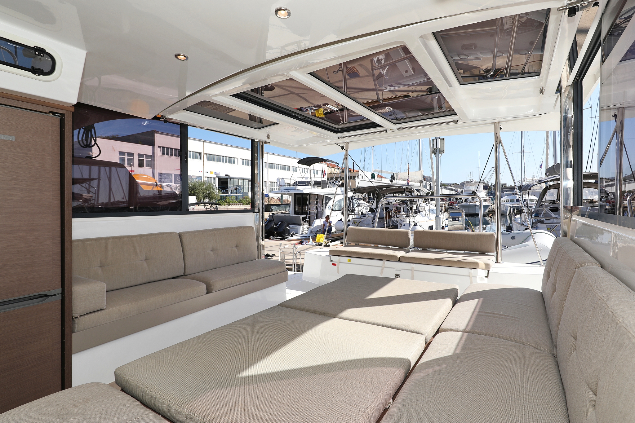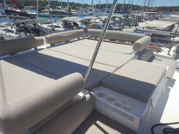 | Outside | 12 V-Anschluss, 220 V-Landanschluss, Anker mit Kette, Bootshaken, Cockpitdusche, Cockpitlautsprecher, Cockpitpolster, Cockpittisch, Deckpolster, elektr. Ankerwinsch, elektr. Winsch, Fender, Festmacherleinen, Gangway, Grill, Hardtop, Sonnendeck, Wasserschlauch, Winschen |