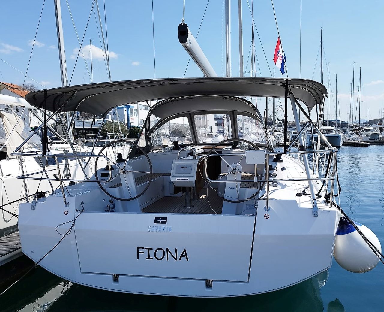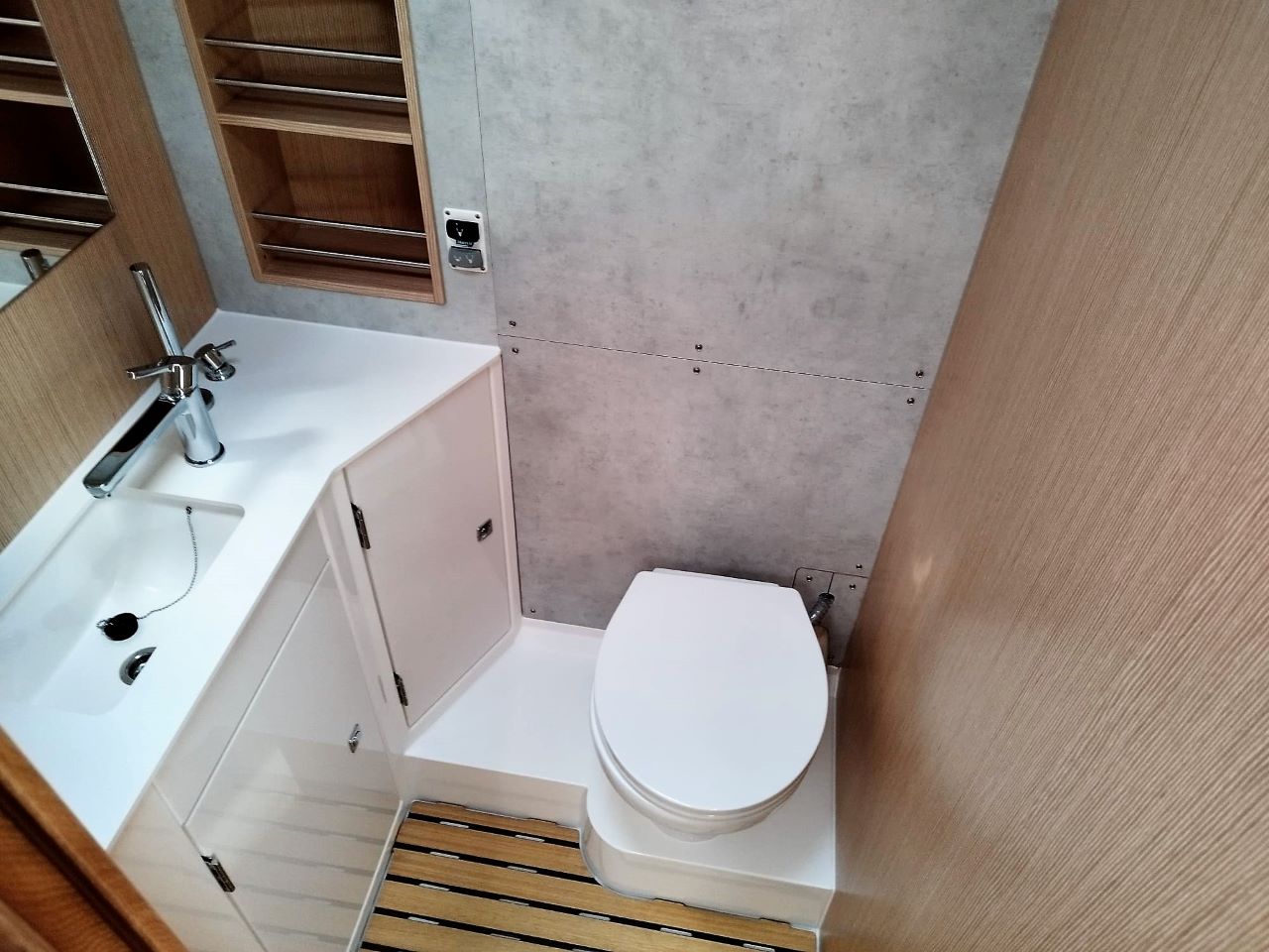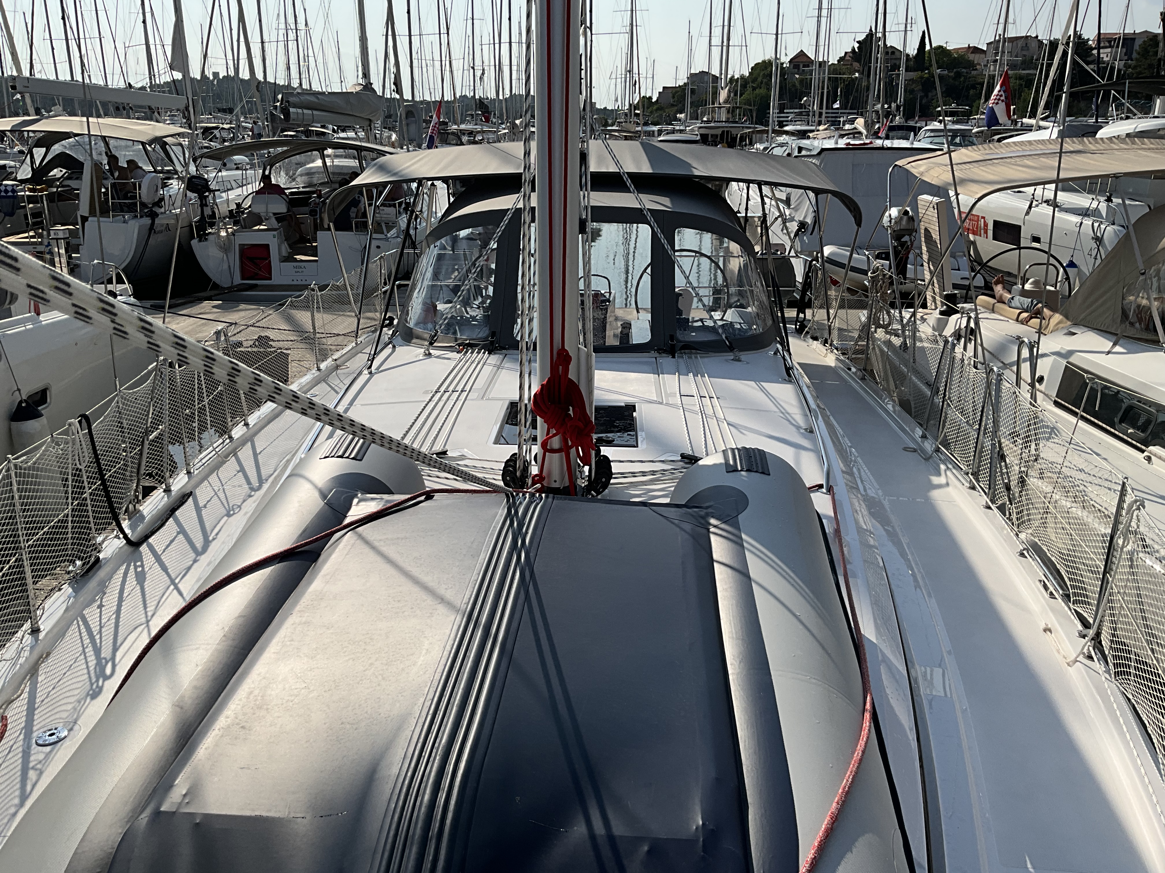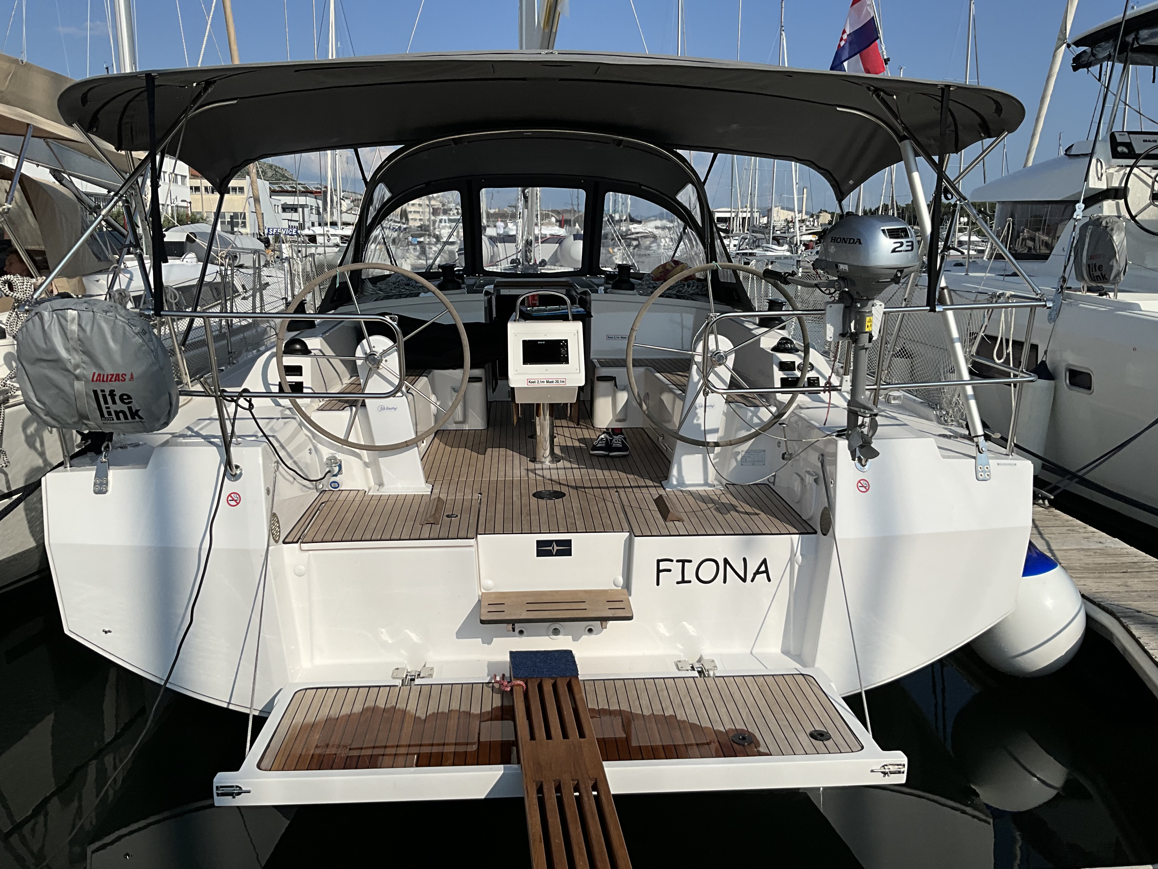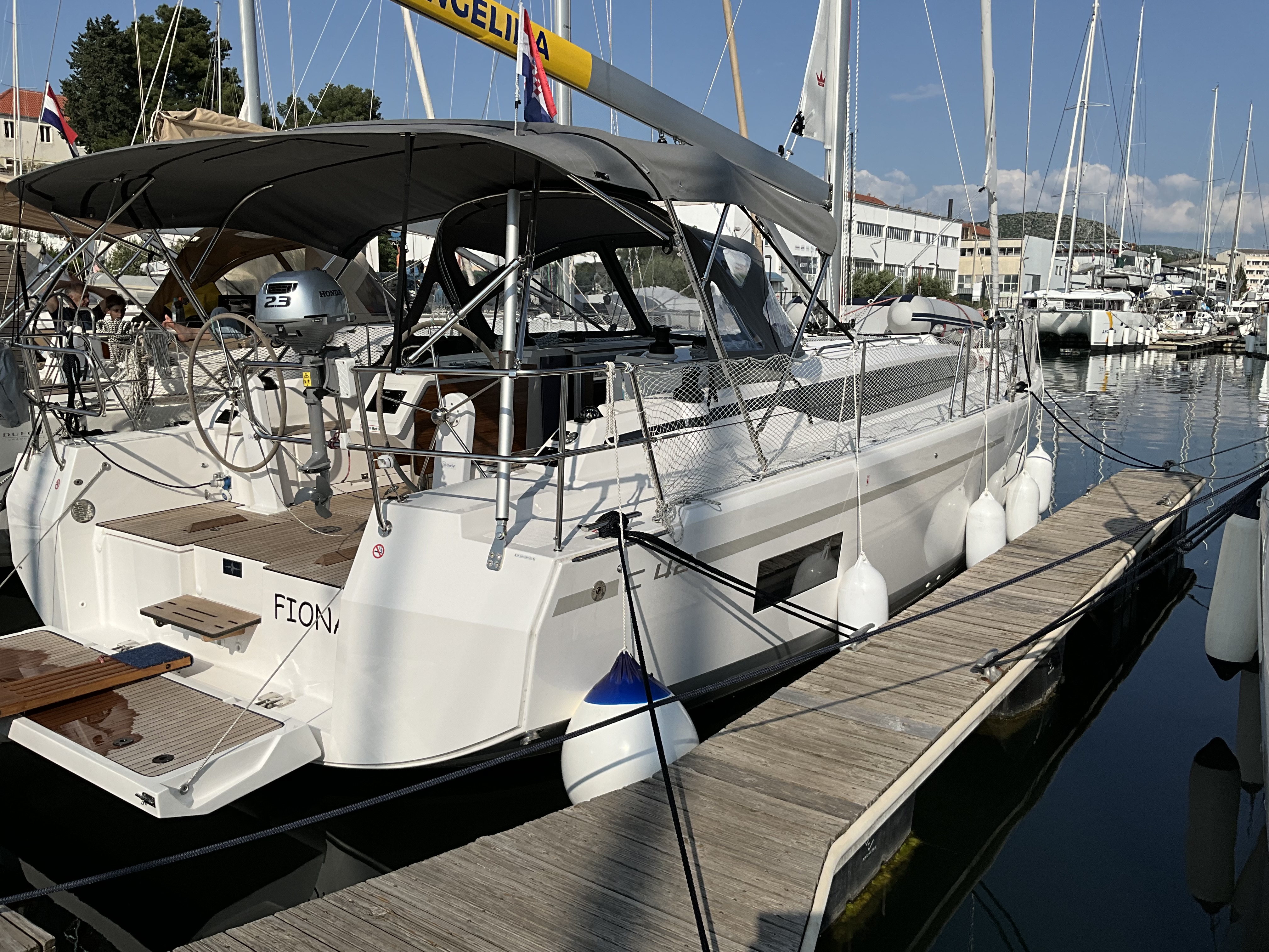 | Outside | Anker mit Kette, Badeplattform, Biminitop, Bootshaken, Cockpitdusche, Cockpitlautsprecher, Cockpitpolster, Cockpittisch, elektr. Ankerwinsch, Fender, Festmacherleinen, Gangway, Sprayhood, Teak im Cockpit, Wasserschlauch, Winschen |