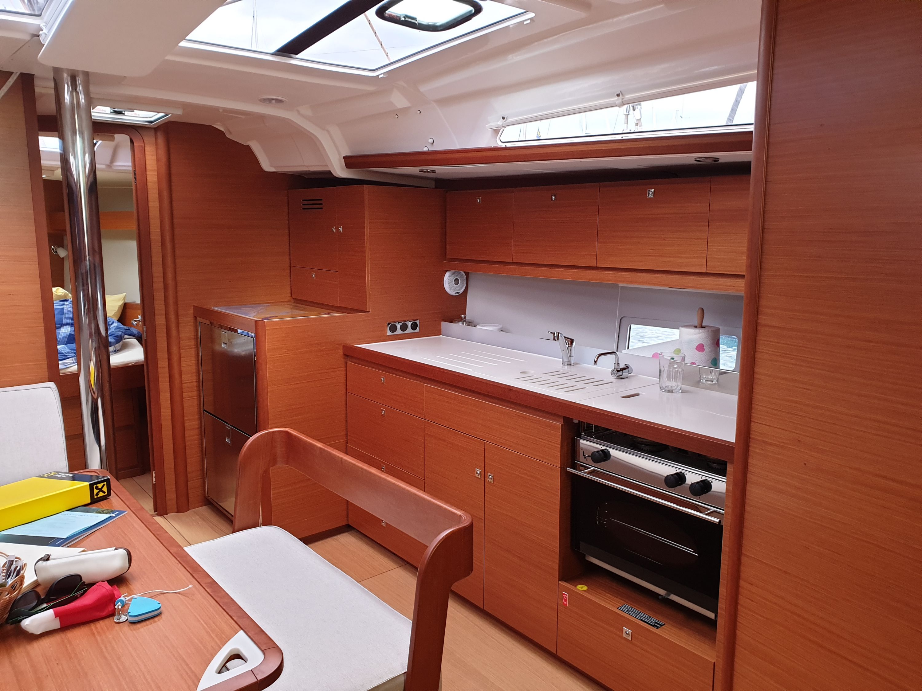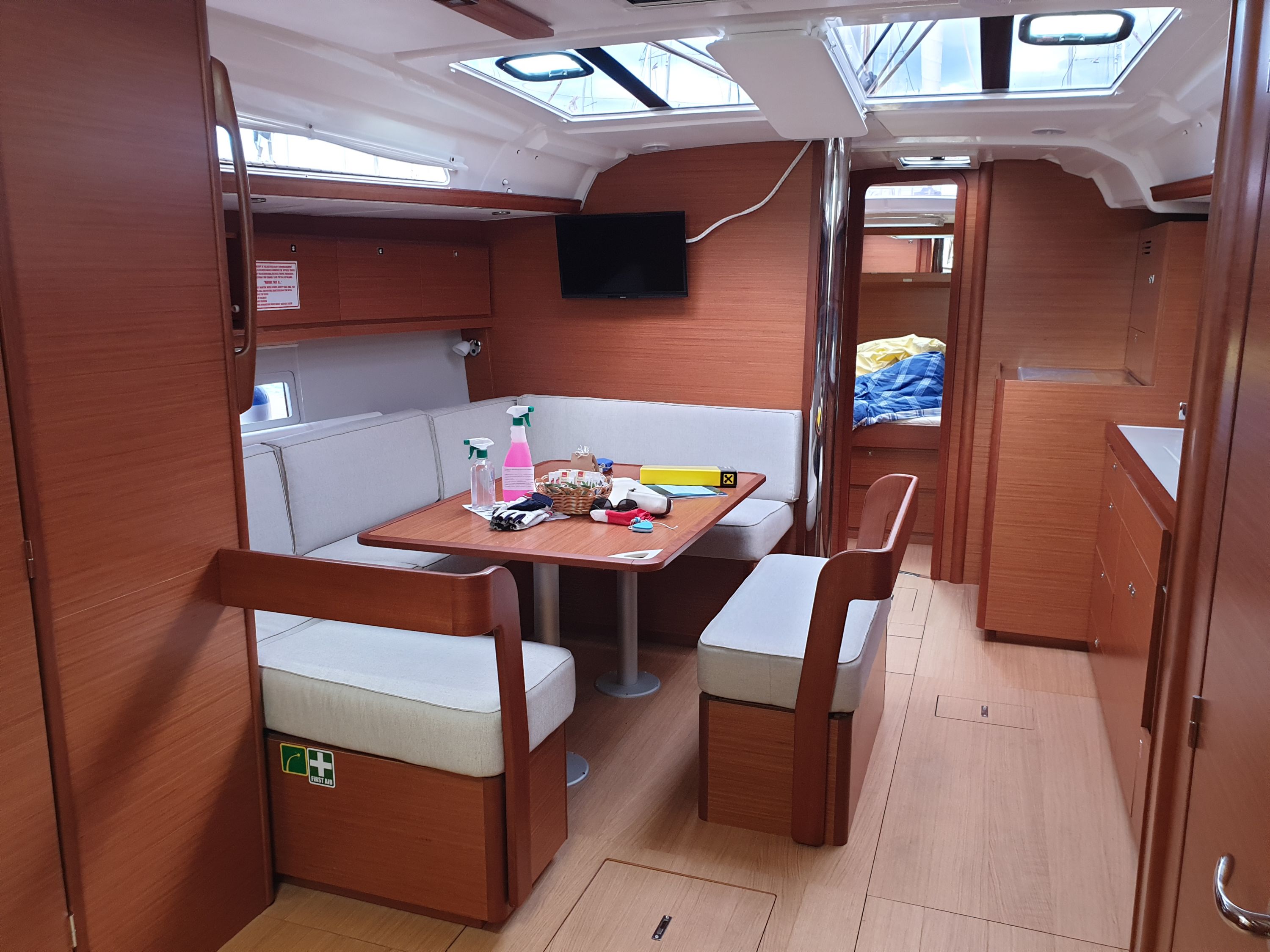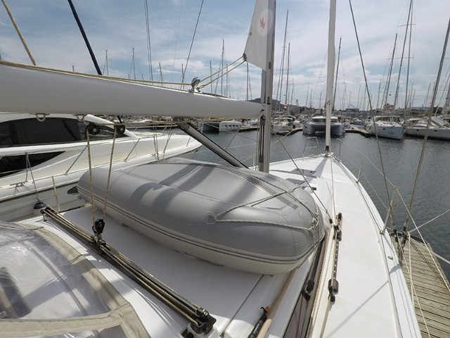 | Outside | 220 V-Landanschluss, Anker mit Kette, Anker mit Seil, Badeleiter, Biminitop, Bootshaken, Bugspriet, Cockpitdusche, Cockpitlautsprecher, Cockpitpolster, Cockpittisch, Deckbürste, elektr. Ankerwinsch, Fender, Festmacherleinen, Gangway, Grill, Kunststoff-Eimer (Pütz), Sprayhood, Teak im Cockpit, Wasserschlauch, Winschen |