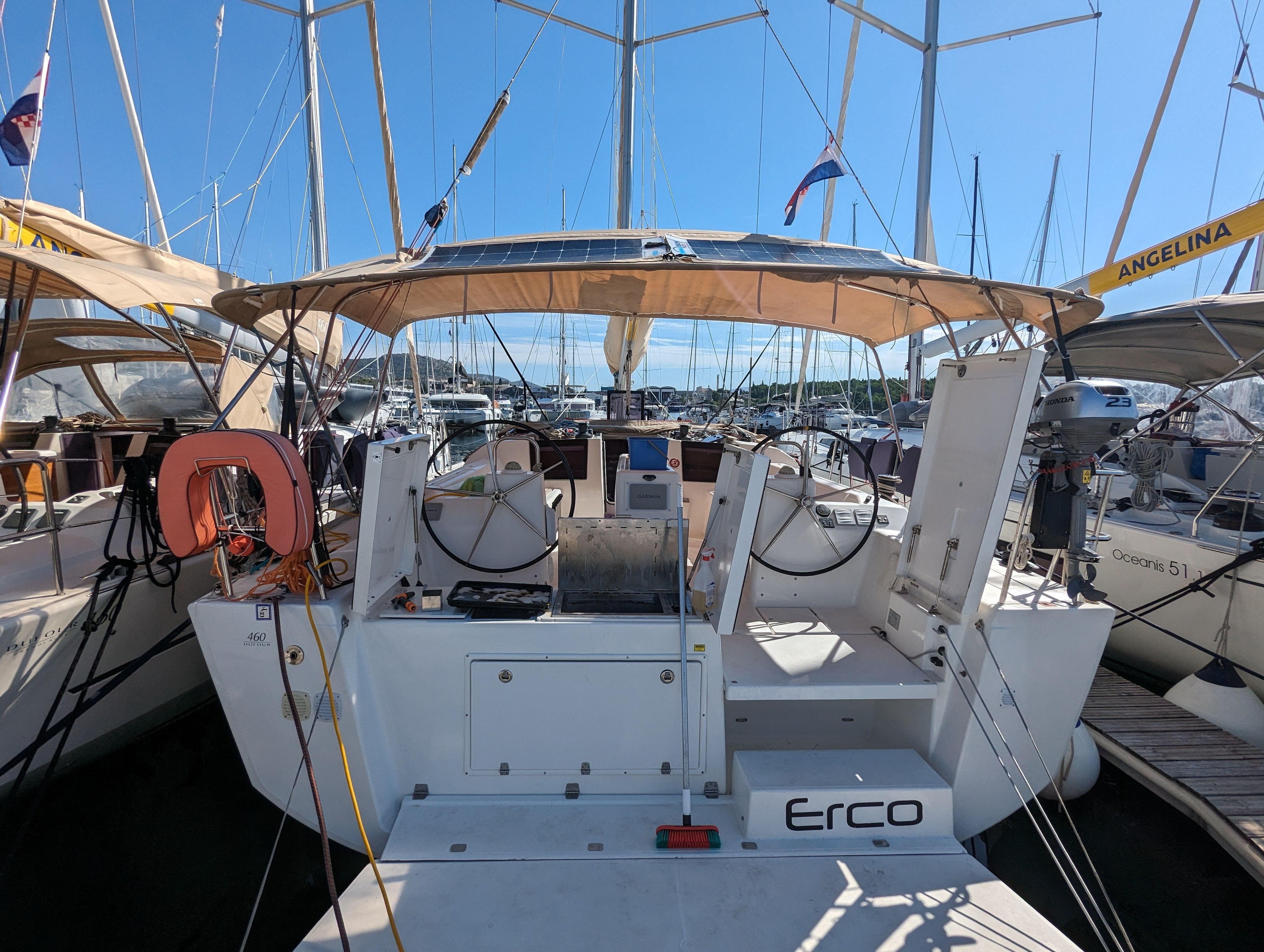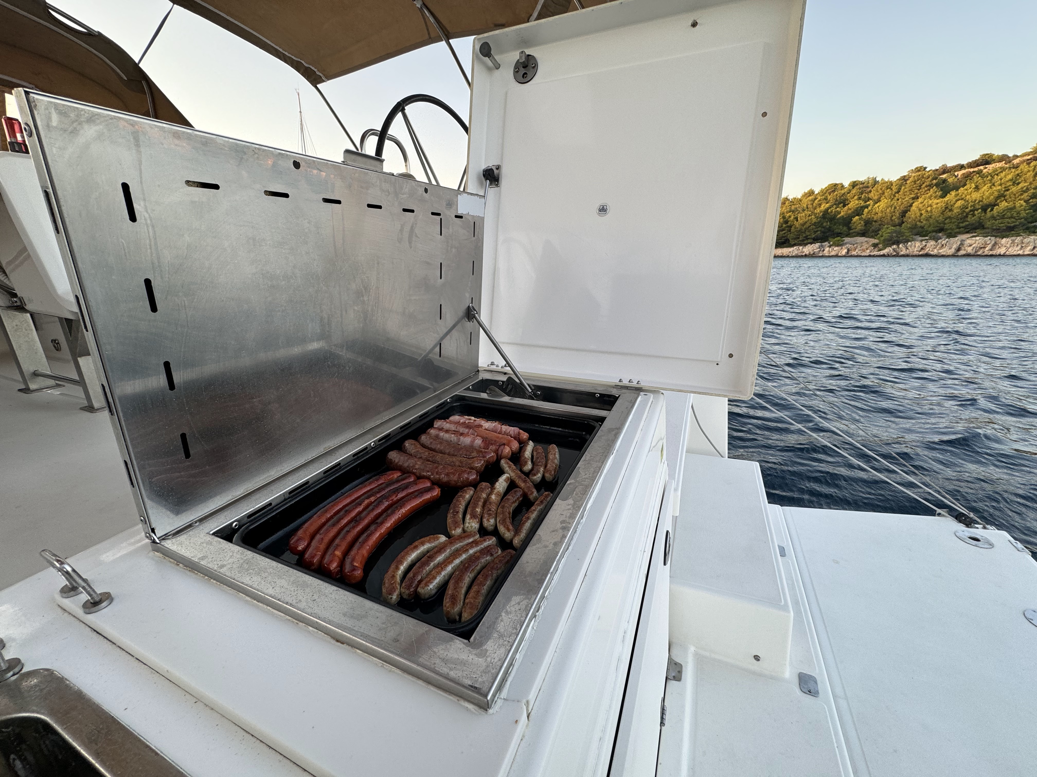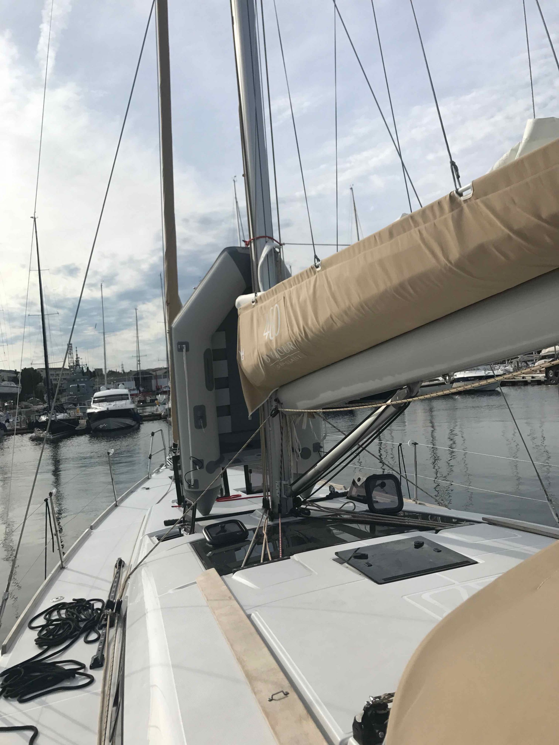 | Outside | 220 V-Landanschluss, Badeplattform, Biminitop, Bootshaken, Cockpitdusche, Cockpitkühlschrank, Cockpitlautsprecher, Cockpitpolster, Cockpittisch, Delta-Anker, elektr. Ankerwinsch, Fender, Festmacherleinen, Gangway, Grill, Kugelfender, Solaranlage, Sprayhood, Teak im Cockpit, Wasserschlauch, Winschen |