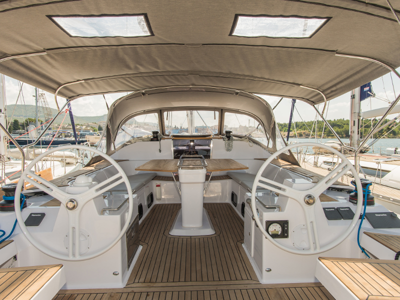Outside Biminitop, Cockpitdusche, Cockpitlautsprecher, Cockpittisch, elektr. Ankerwinsch, Sprayhood, Teak im Cockpit