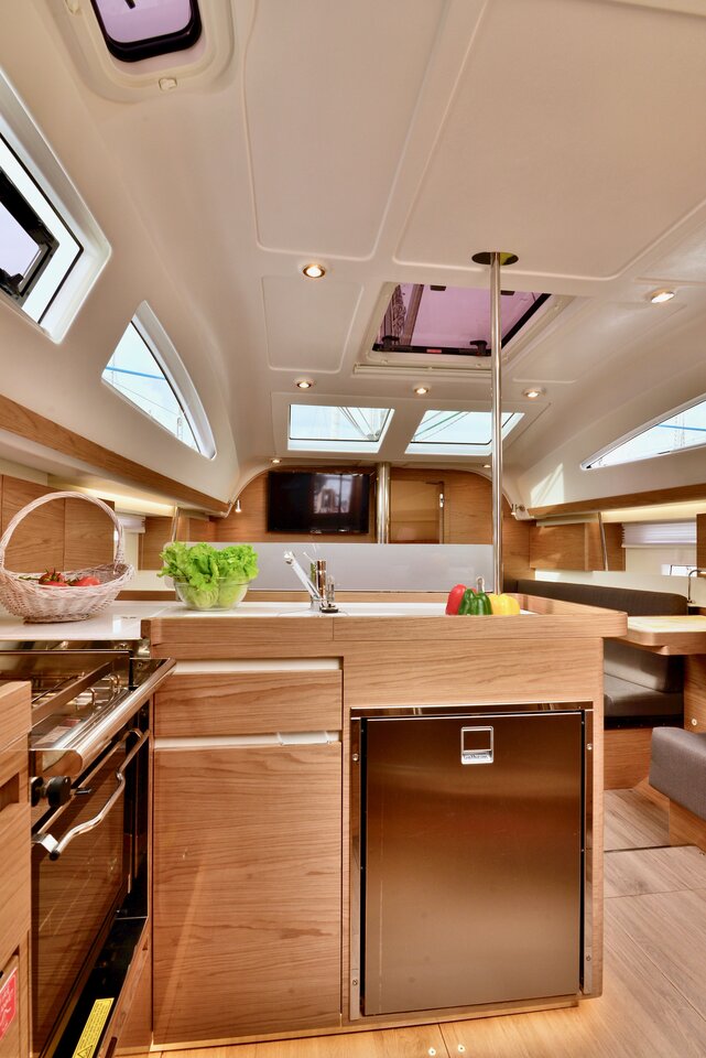 | Outside | Biminitop, Cockpitdusche, Cockpitlautsprecher, Cockpittisch, elektr. Ankerwinsch, Sprayhood, Teak im Cockpit |