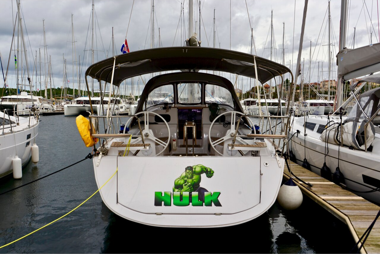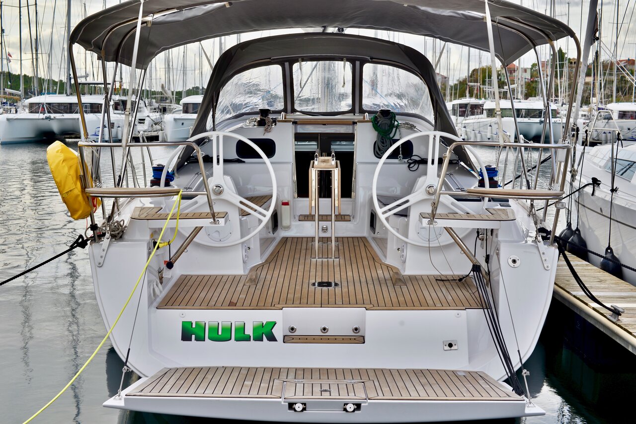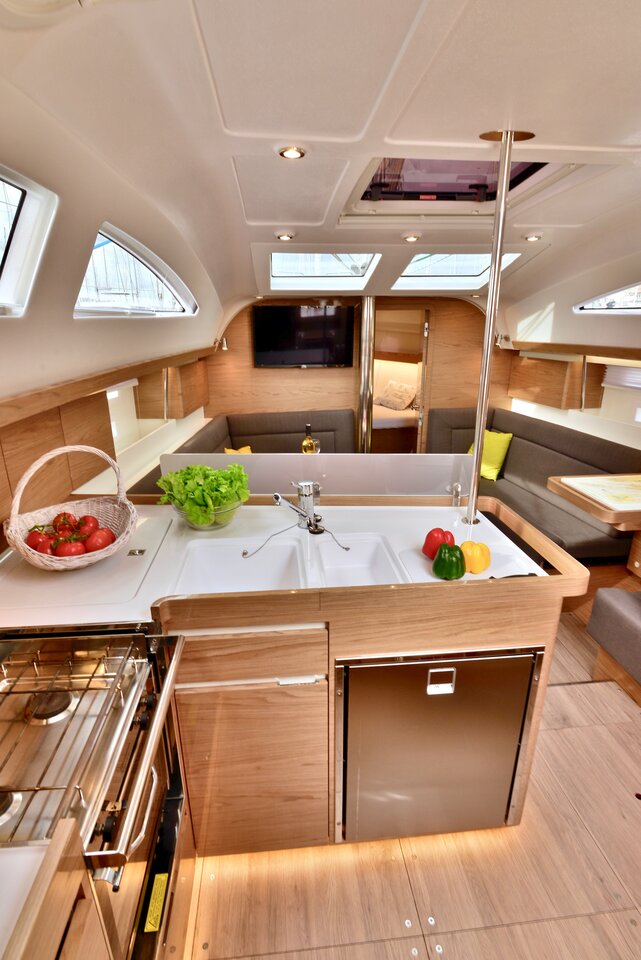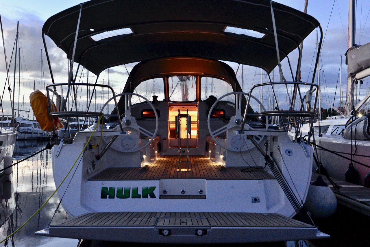 | Outside | Biminitop, Cockpitdusche, Cockpitlautsprecher, Cockpittisch, elektr. Ankerwinsch, Sprayhood, Teak im Cockpit, Unterwasserbeleuchtung |