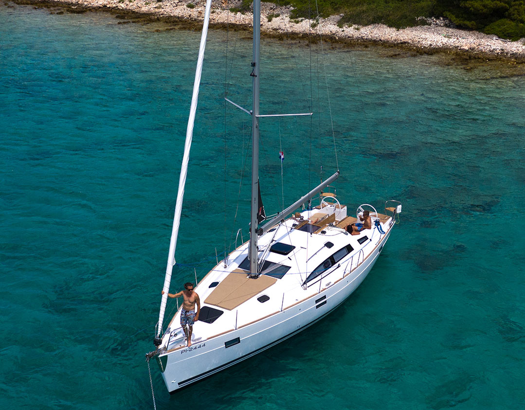 | Outside | Badeplattform, Biminitop, Cockpitkühlschrank, Cockpitpolster, Deckbeleuchtung, Delta-Anker, elektr. Ankerwinsch, Faltpropeller, Grill, Sprayhood, Teak im Cockpit |