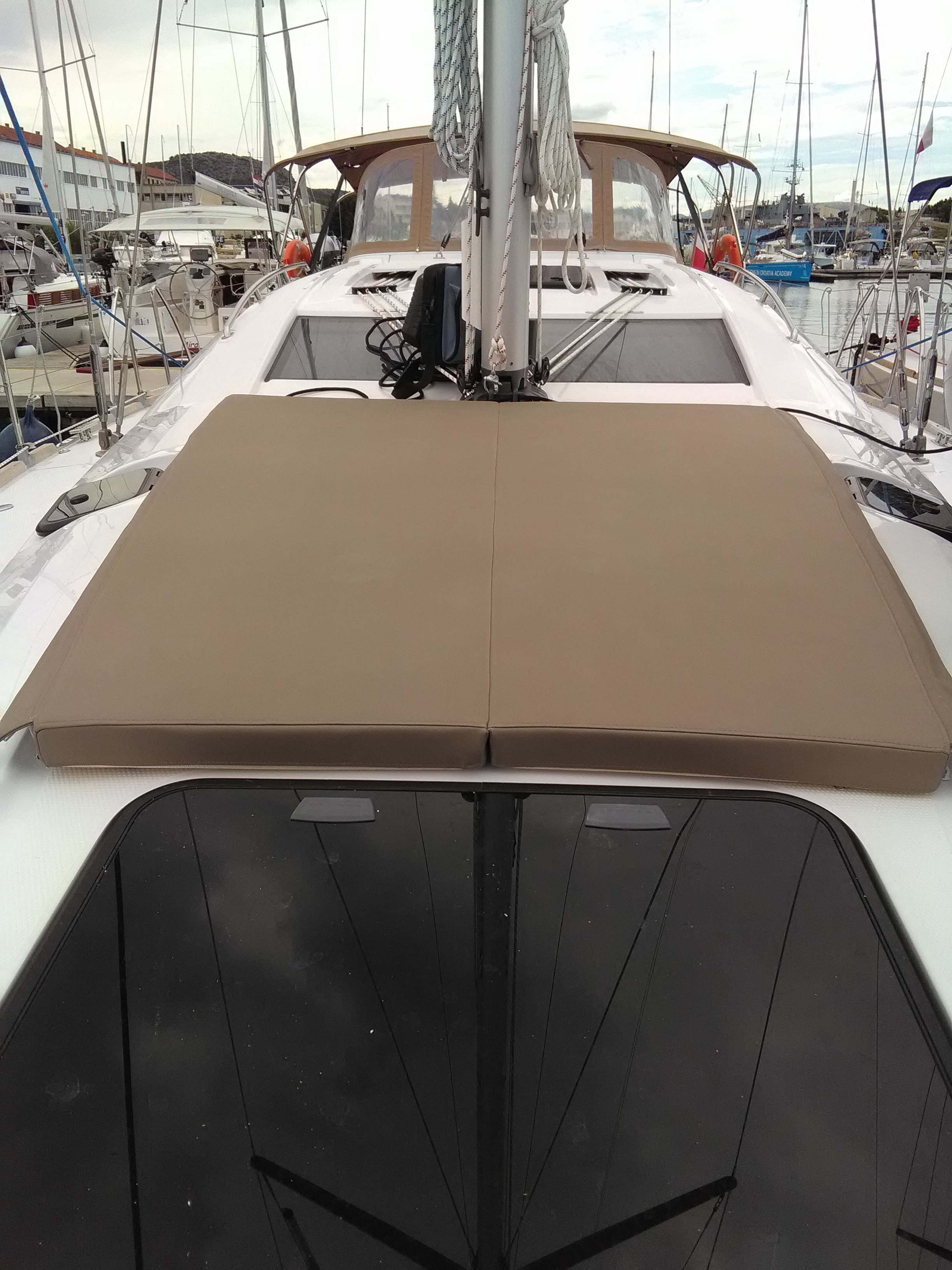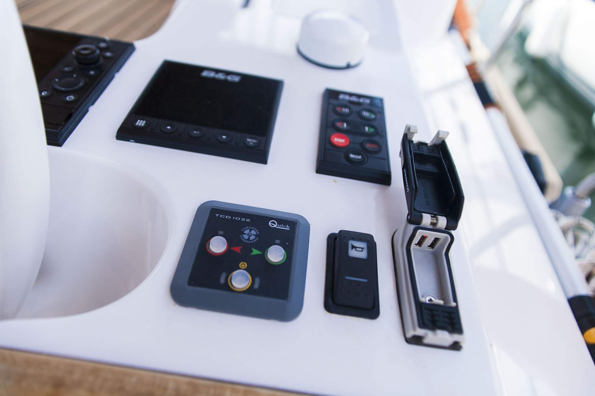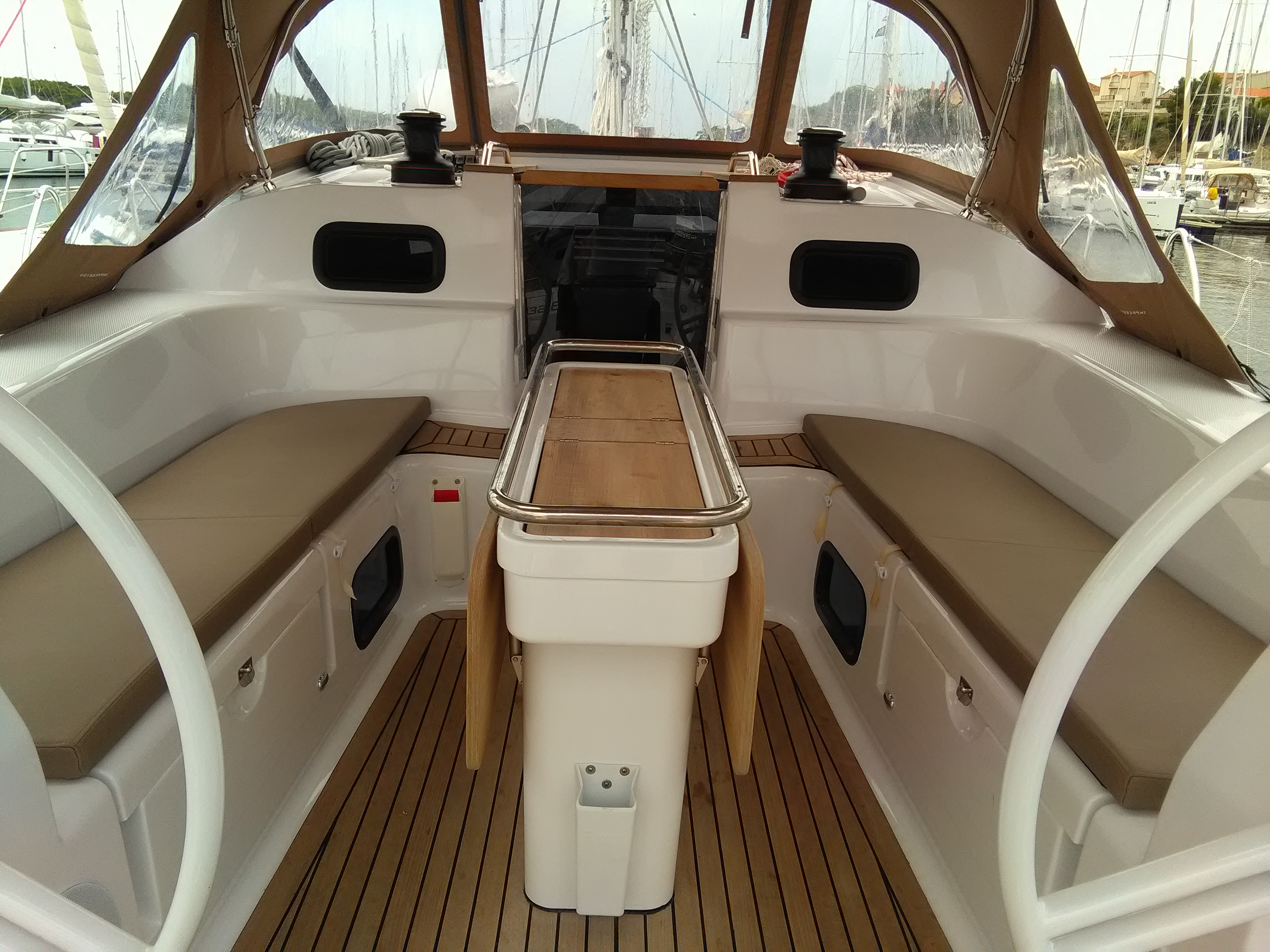 | Outside | 220 V Landstromkabel mit Ladegerät, 220 V-Landanschluss, Anker mit Kette, Badeleiter, Badeplattform, Biminitop, Cockpitdusche, Cockpitlautsprecher, Cockpitpolster, Cockpittisch, Deckpolster, elektr. Ankerwinsch, Sprayhood, Teak im Cockpit, Windex, Winschen |