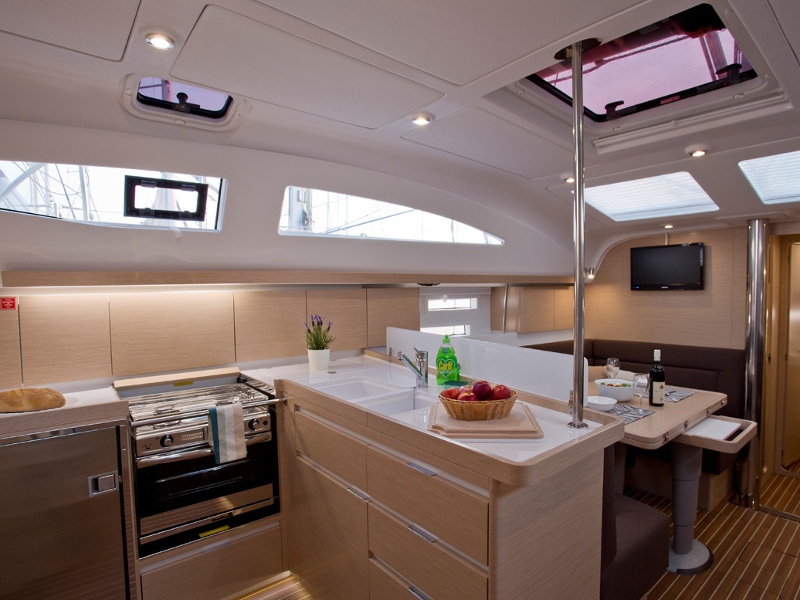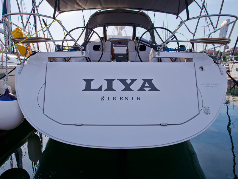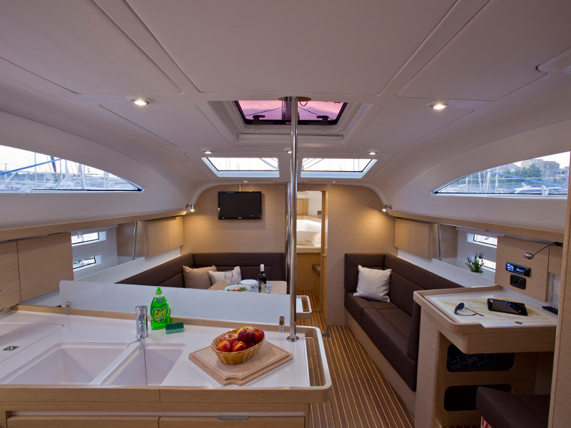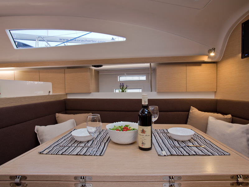 | Outside | Biminitop, Cockpitdusche, Cockpitlautsprecher, Cockpittisch, elektr. Ankerwinsch, Sprayhood, Teak im Cockpit |