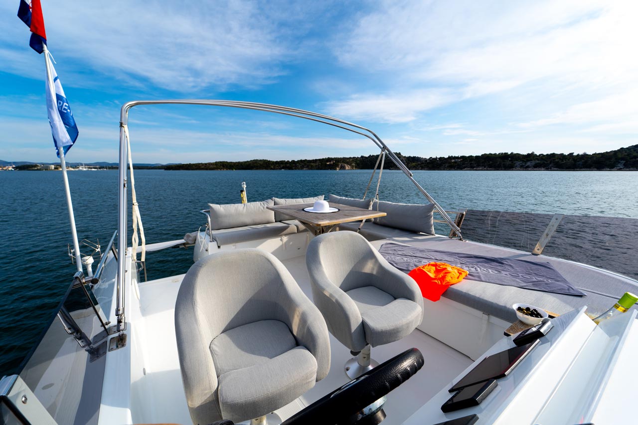 | Outside | Anker mit Kette, Ankerwinsch, Biminitop, Bootshaken, Cockpitdusche, Cockpitlautsprecher, Cockpitpolster, Cockpittisch, Davits, elektr. Ankerwinsch, Fender, Festmacherleinen, Gangway, Kugelfender, Kunststoff-Eimer (Pütz), Solaranlage, Wasserkanister , Wasserschlauch, Windex |