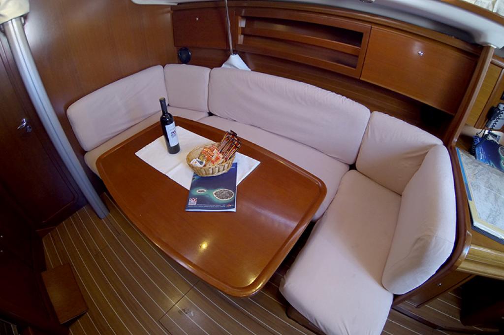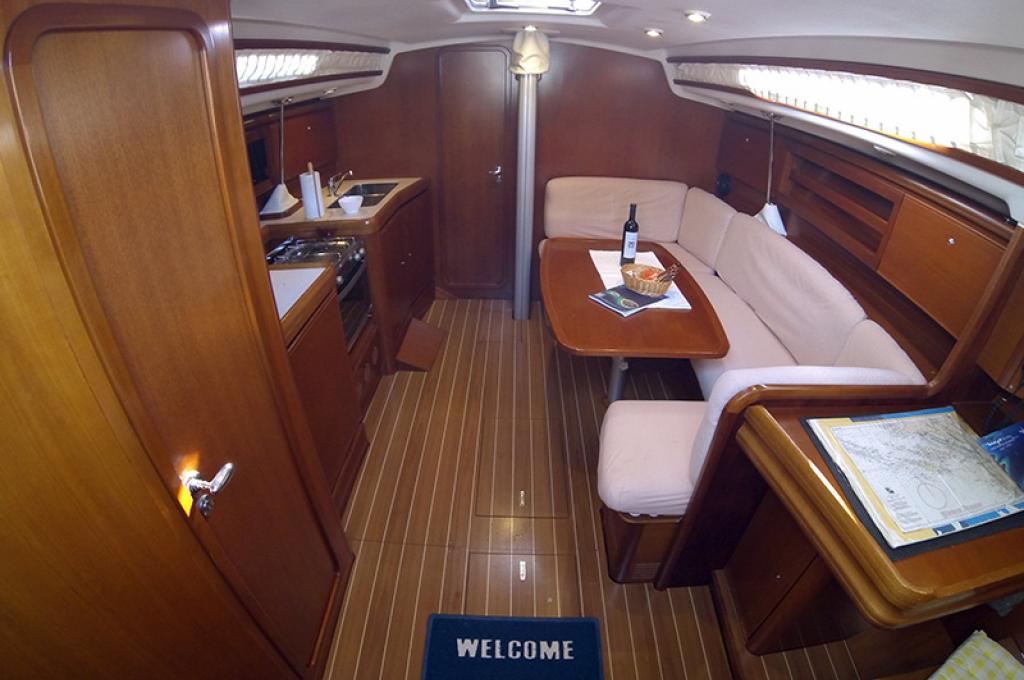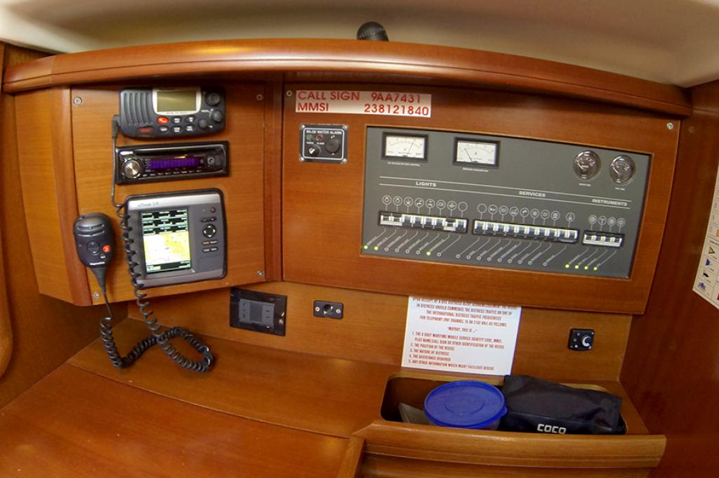 Outside 220 V-Landanschluss, Anker mit Kette, Anker mit Seil, Badeleiter, Biminitop, Bootshaken, Cockpitdusche, Cockpitlautsprecher, Cockpitpolster, Cockpittisch, Deckbürste, elektr. Ankerwinsch, Fender, Festmacherleinen, Gangway, Kunststoff-Eimer (Pütz), Sprayhood, Teak im Cockpit, Wasserschlauch, Winschen