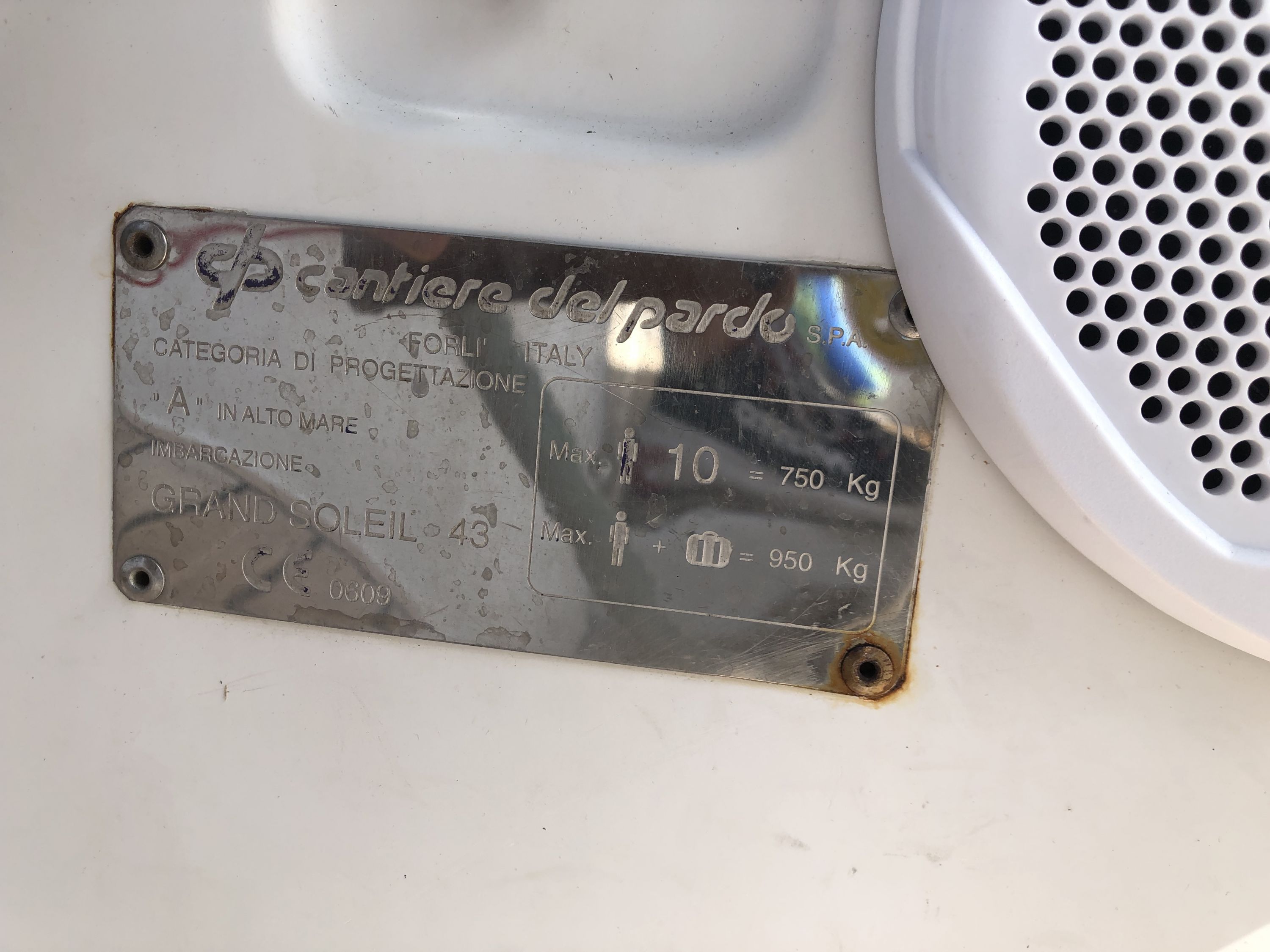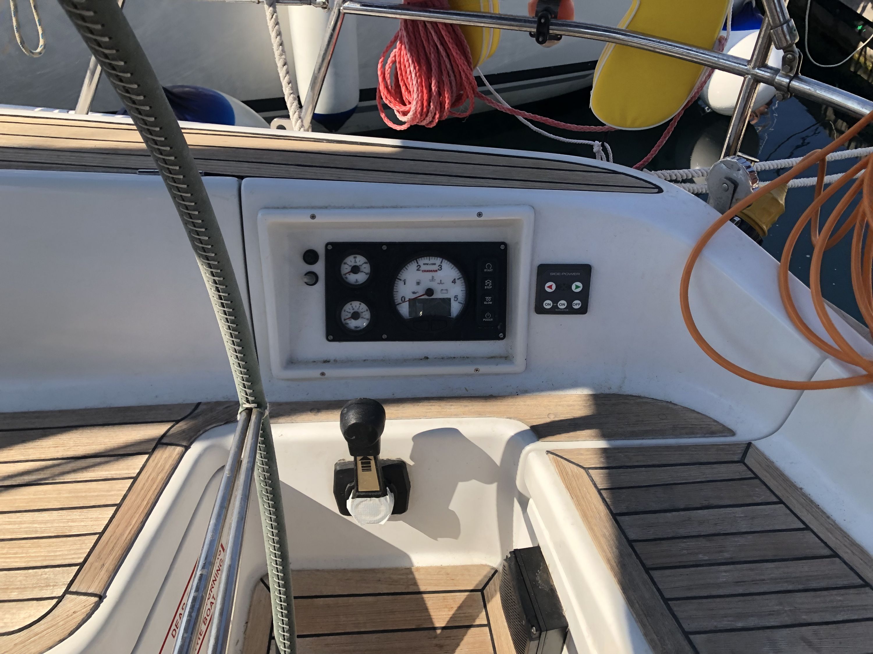 | Outside | 220 V-Landanschluss, Anker mit Kette, Anker mit Seil, Badeleiter, Biminitop, Bootshaken, Cockpitdusche, Cockpitlautsprecher, Cockpitpolster, Cockpittisch, Deckbürste, elektr. Ankerwinsch, Faltpropeller, Fender, Festmacherleinen, Gangway, Kunststoff-Eimer (Pütz), Sprayhood, Teak im Cockpit, Treibanker, Wasserschlauch, Winschen |